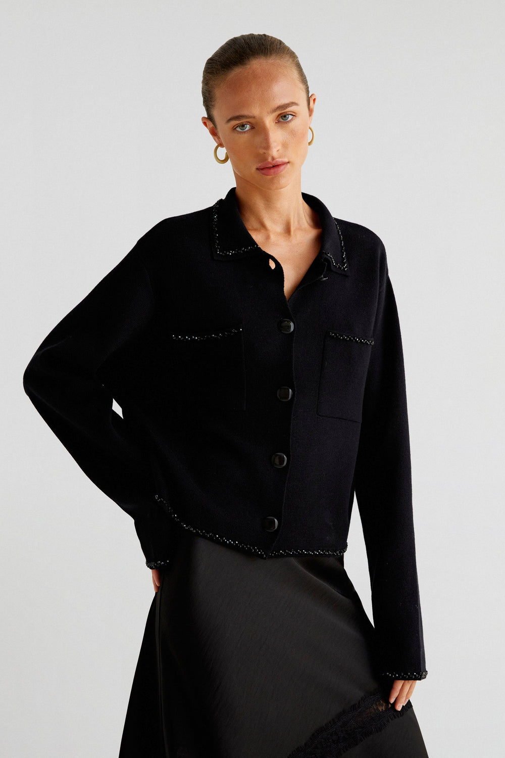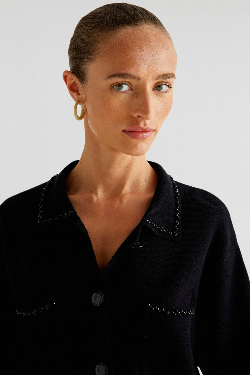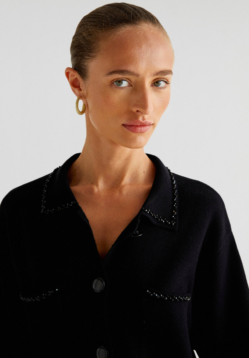 Cardigan made of a wool blend. Regular fit, classic collar and button fastening. Long sleeves and pockets. Bead details.