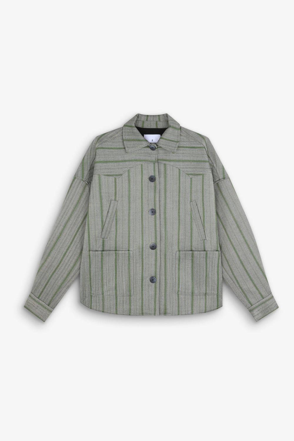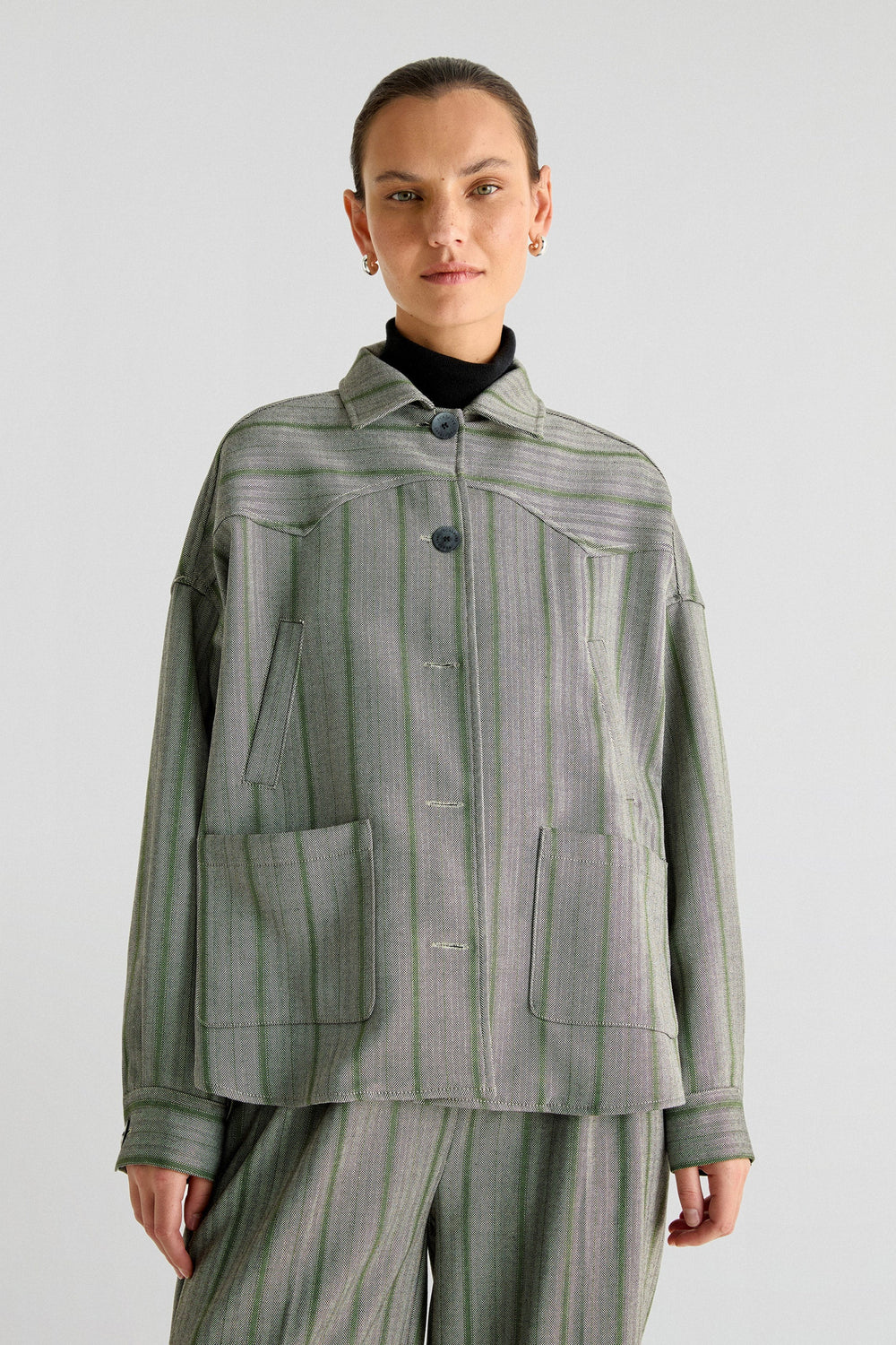 Striped overshirt jacket. Oversize fit, classic collar and button fastening. Long sleeves with buttoned cuffs and patch and jetted pockets.