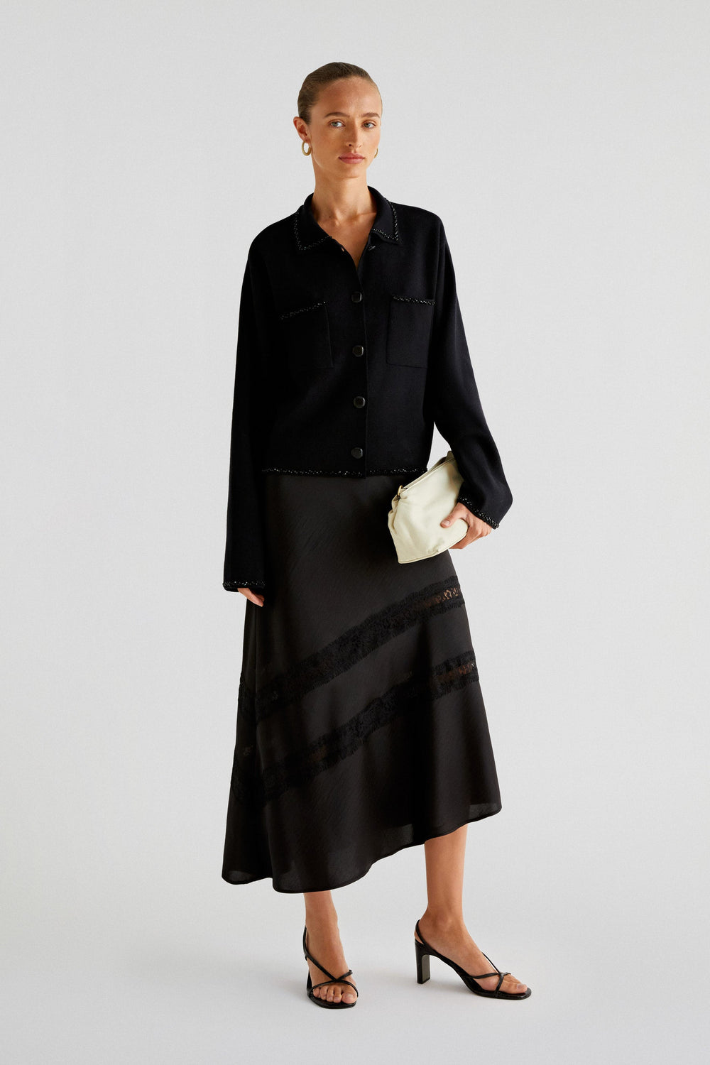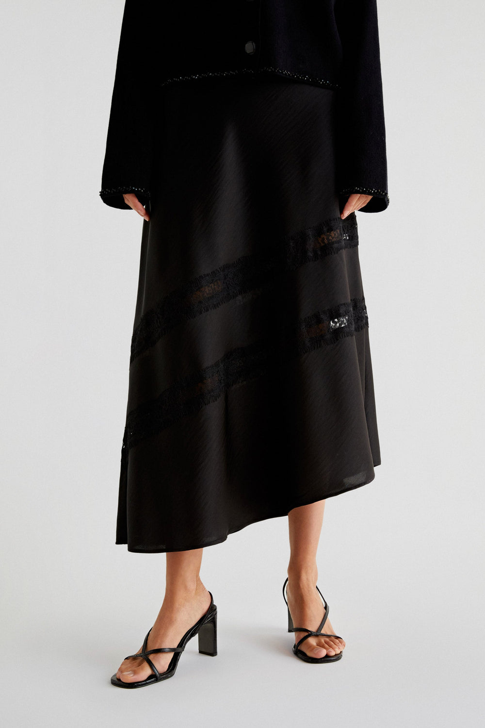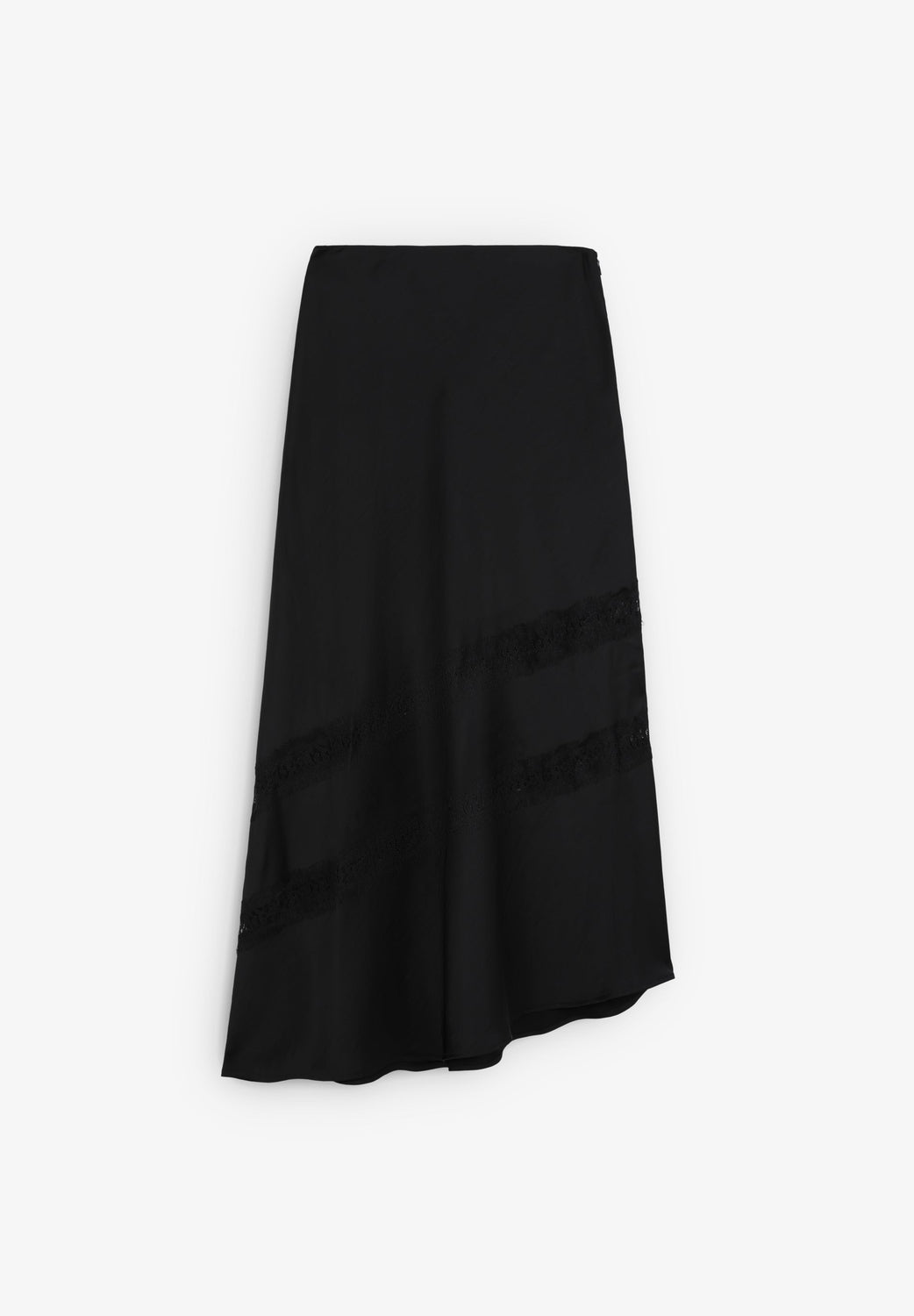 Midi skirt made of satin fabric. Regular fit, zip fastening. Asymmetric with a lace detail.