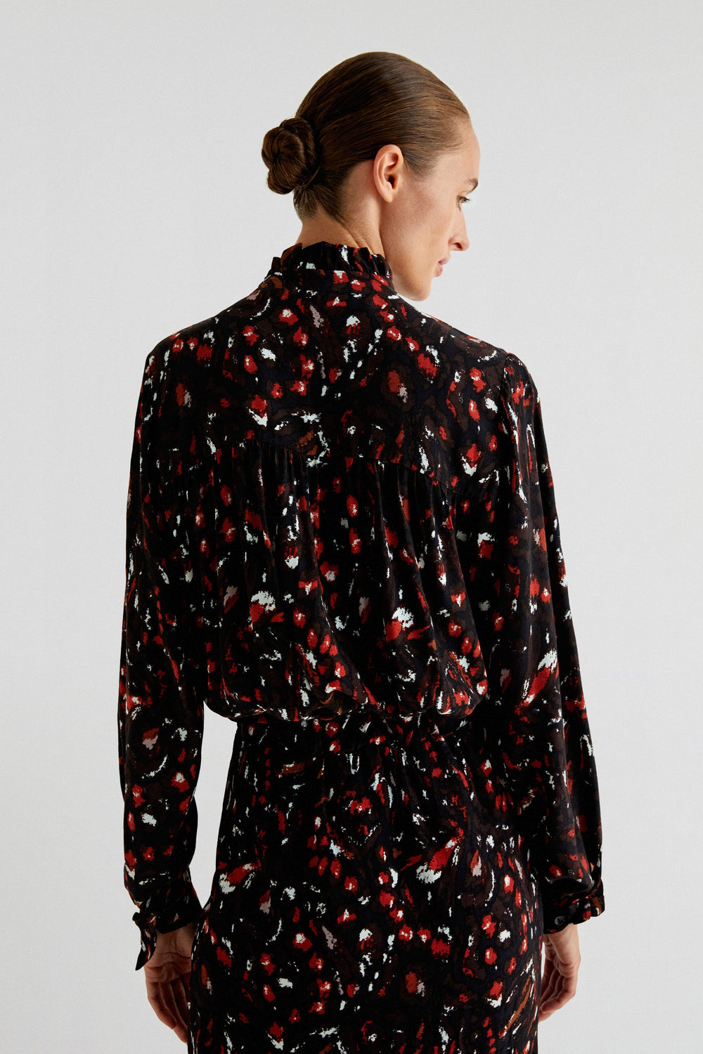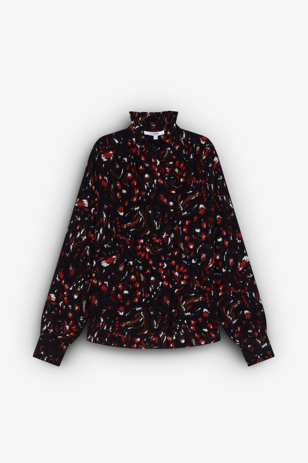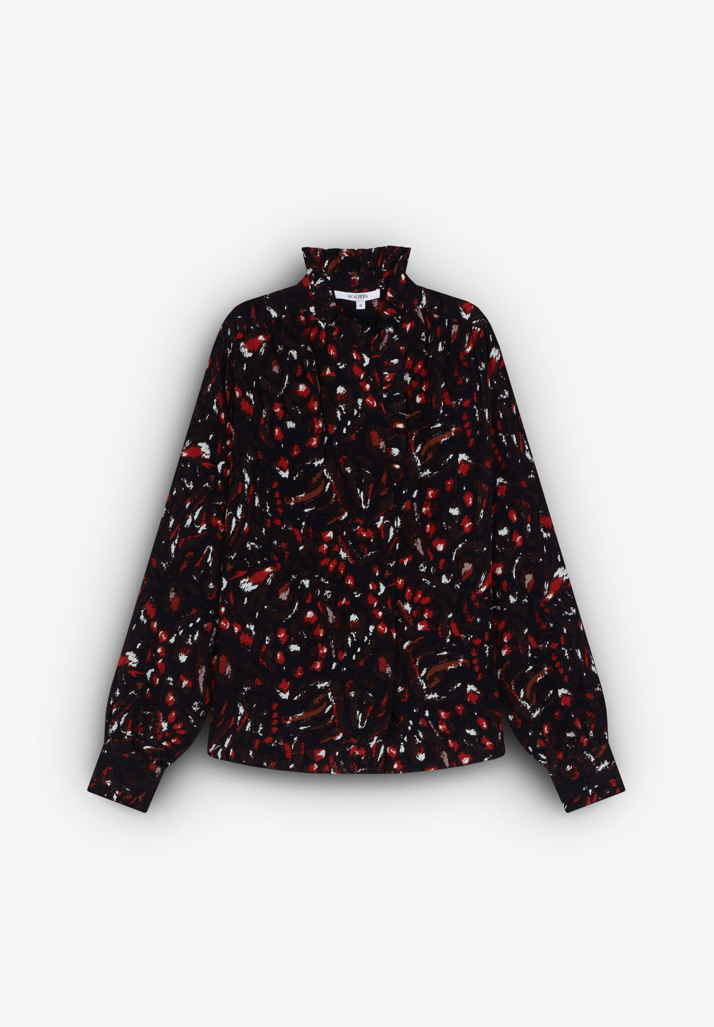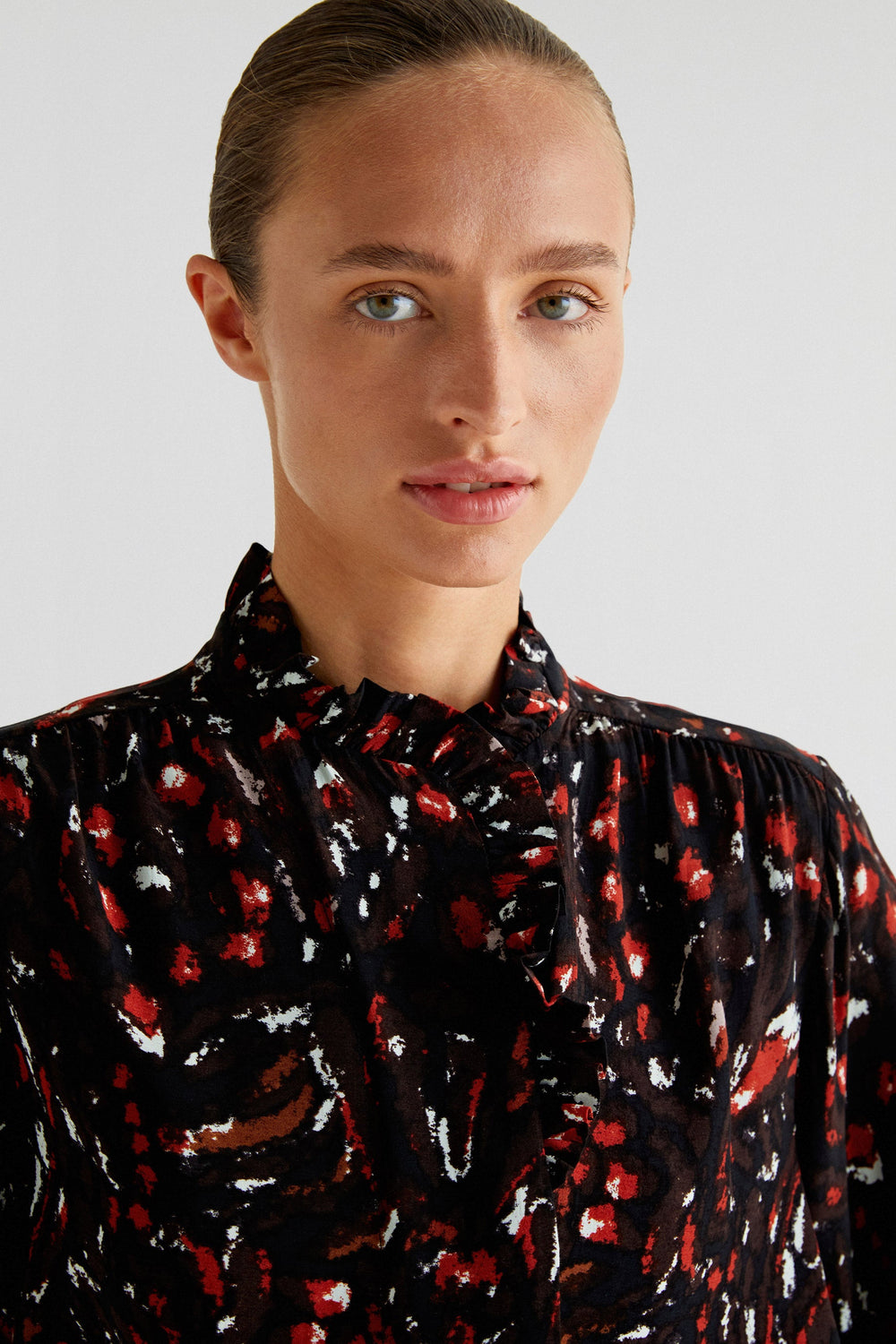 Printed blouse made of flowing fabric. Regular fit, high ruffled collar and button fastening. Long sleeves with cuffs.