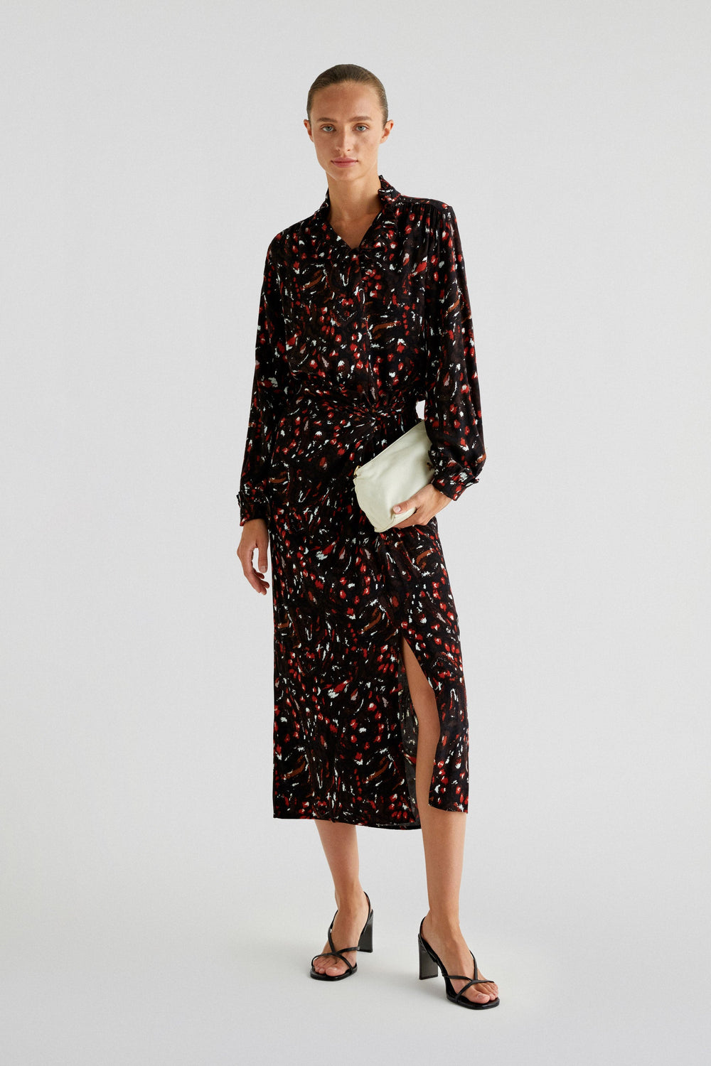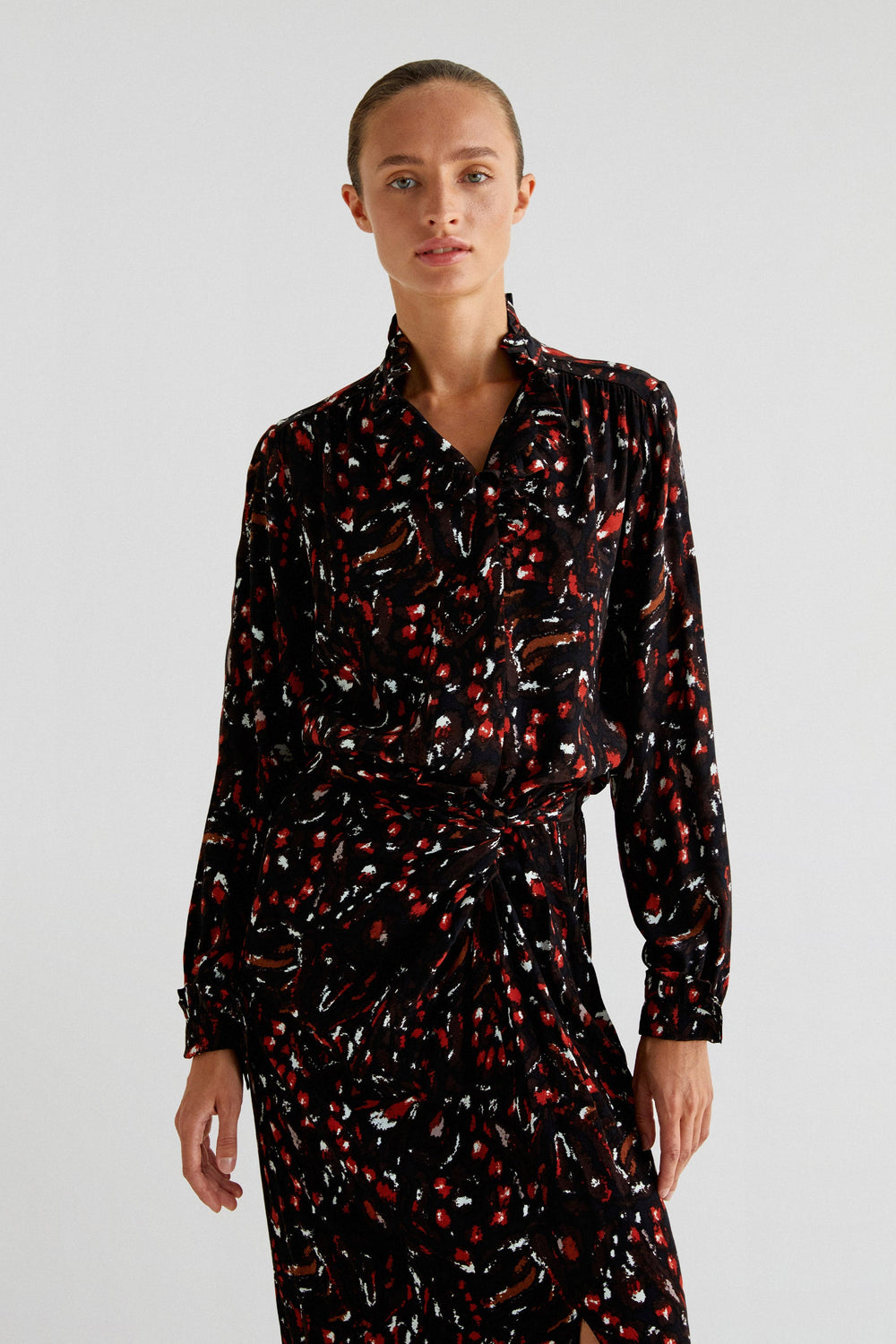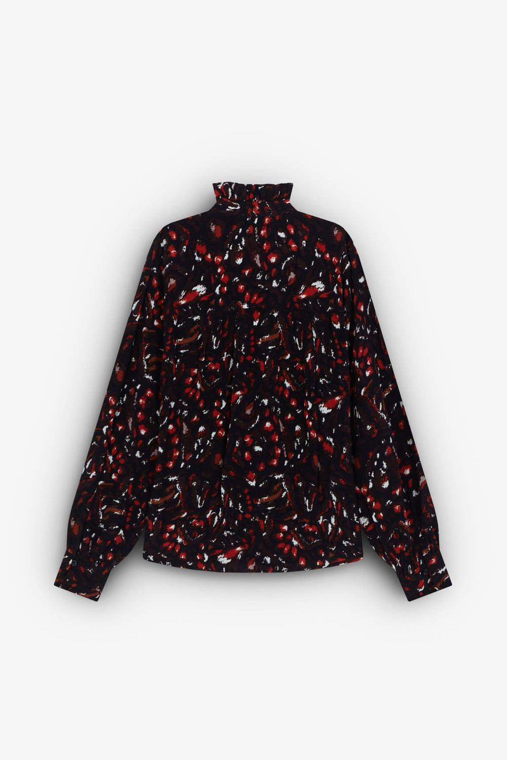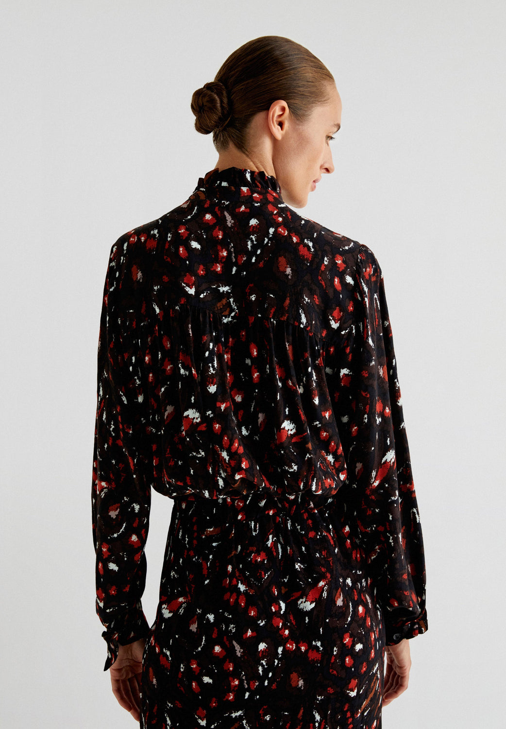 Printed blouse made of flowing fabric. Regular fit, high ruffled collar and button fastening. Long sleeves with cuffs.