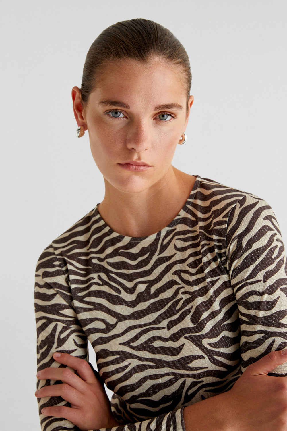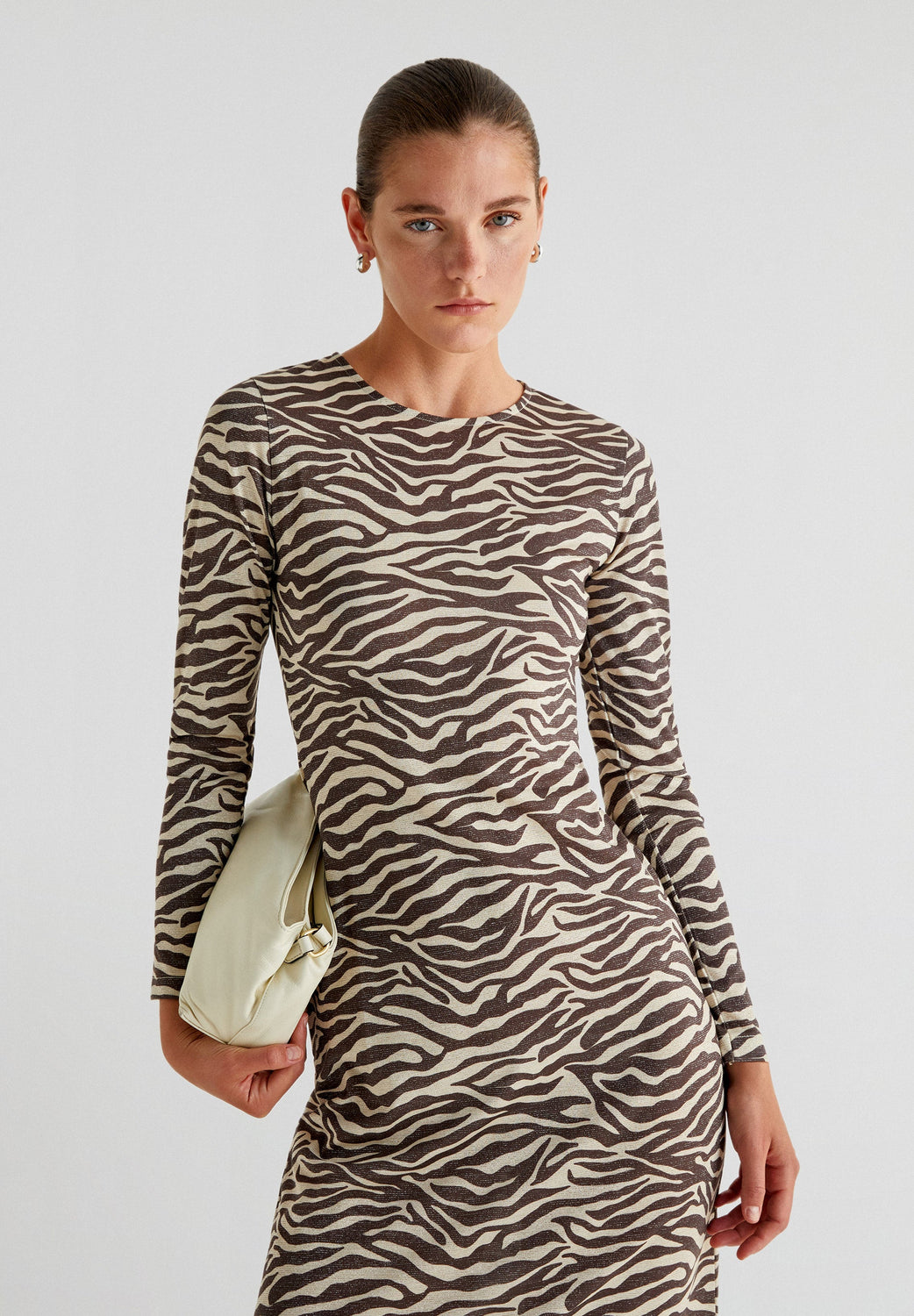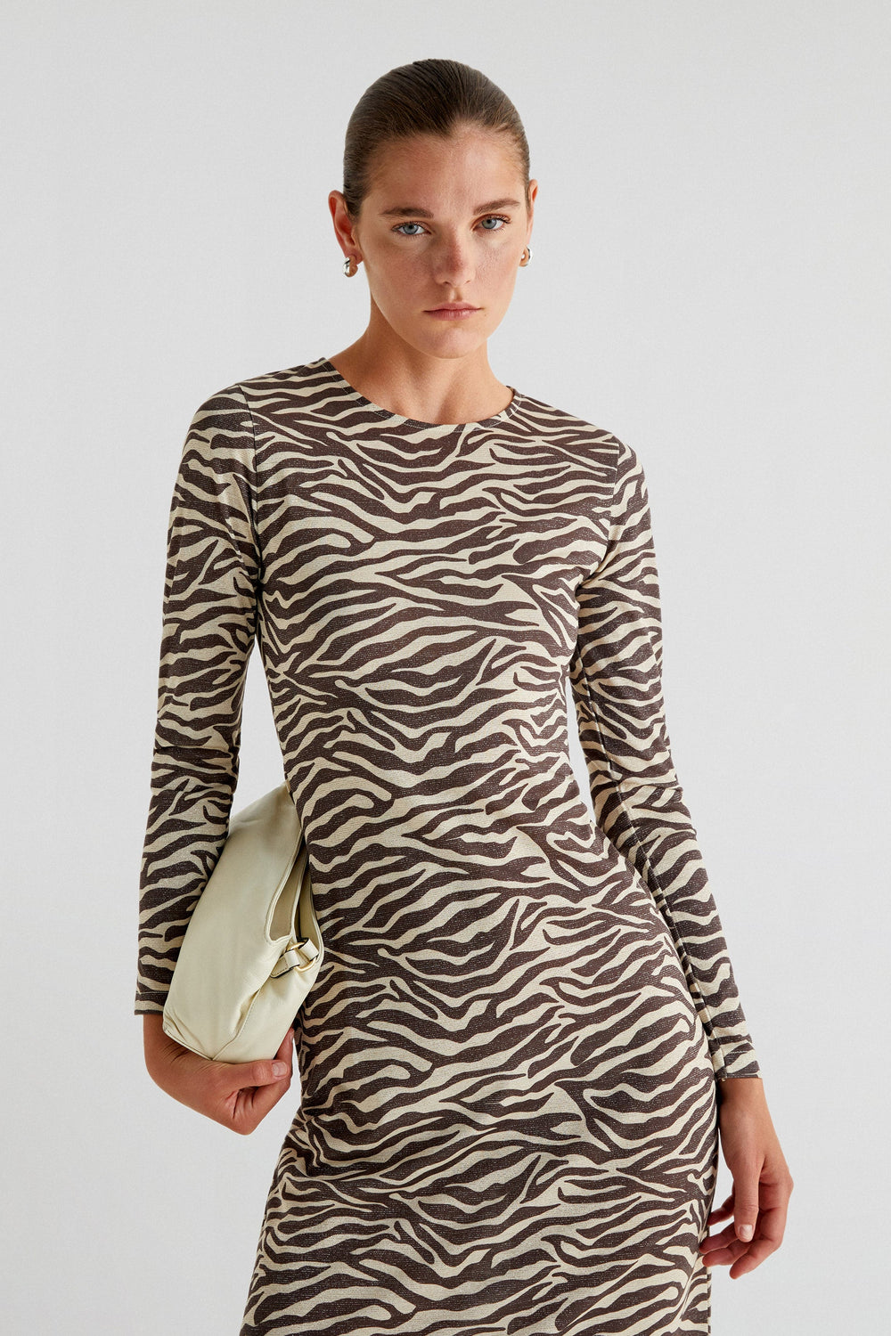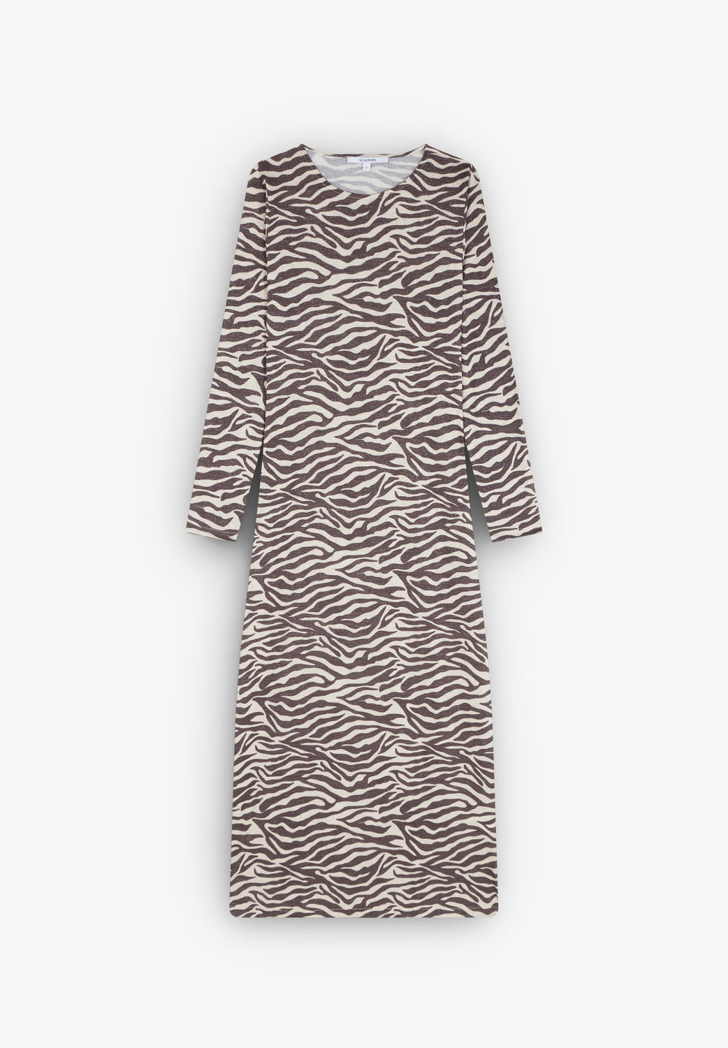 Midi dress with zebra print. Slim fit, round neck and long sleeves.