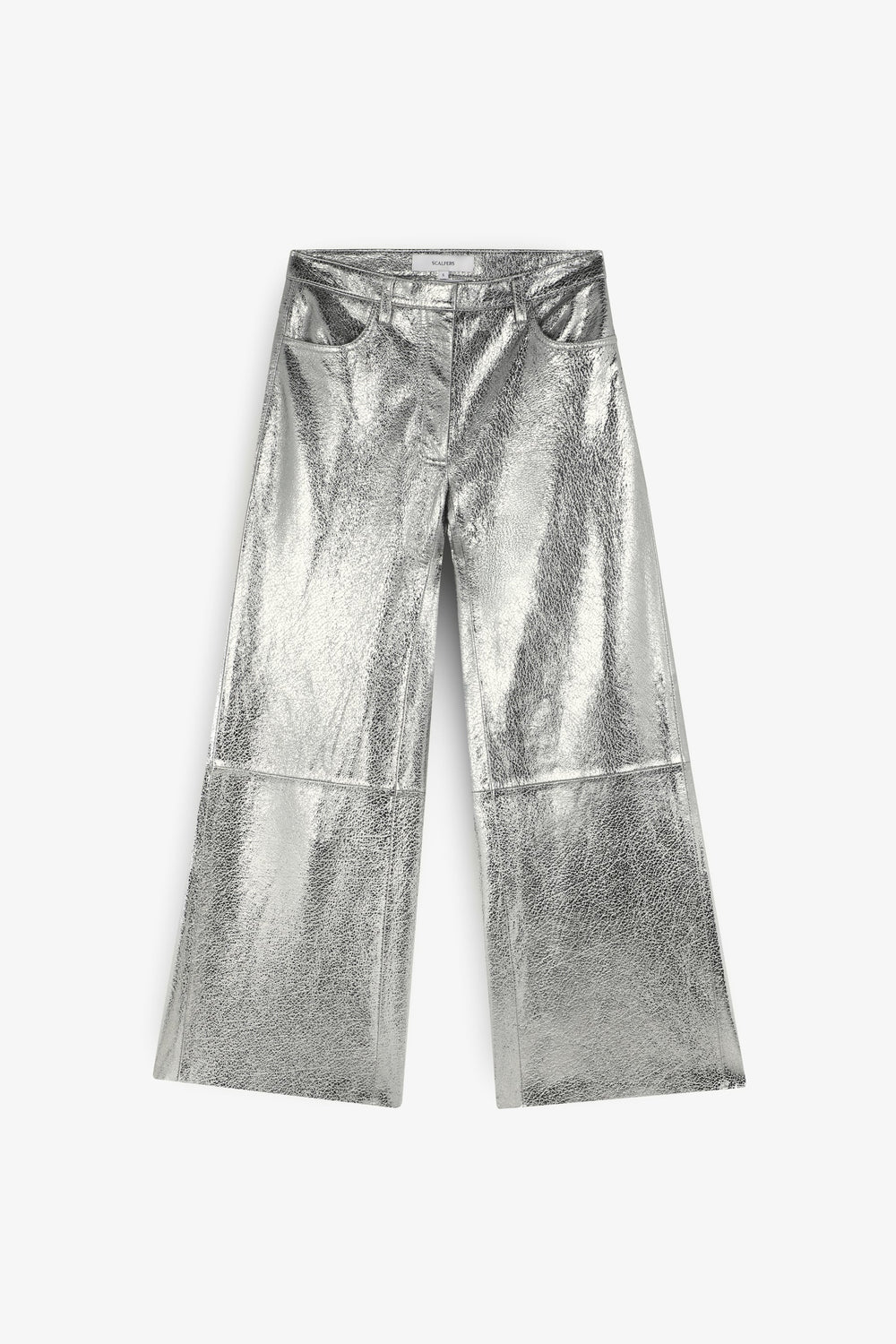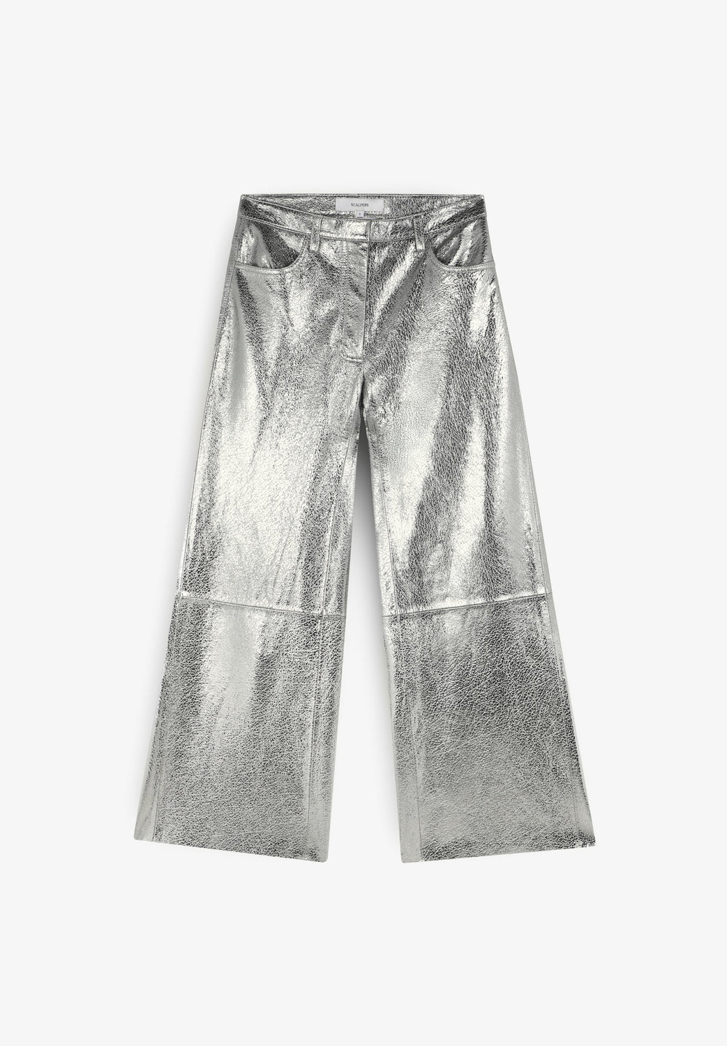 Metallic trousers made of 100% crackled leather . Ankle flare fit, mid-rise, zip fly and button fastening and side and back pockets. Belt loops and seam detail on the leg.