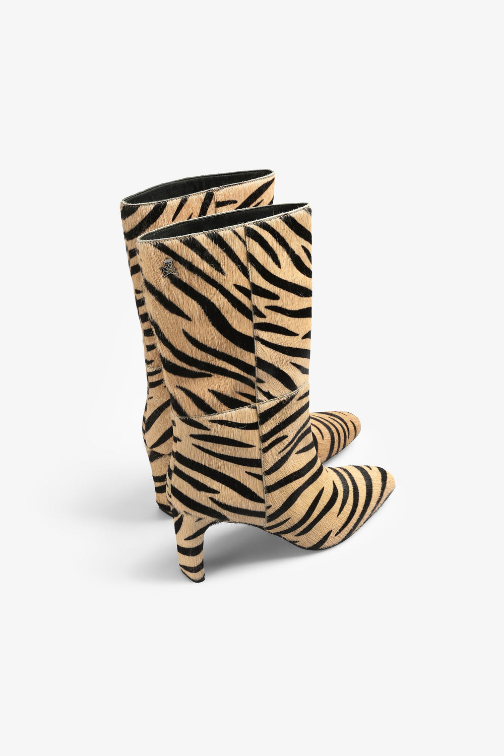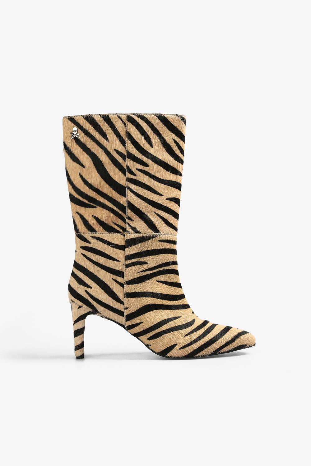 Zebra-inspired boots made of 100% leather. Medium length, high heel and metallic skull detail.