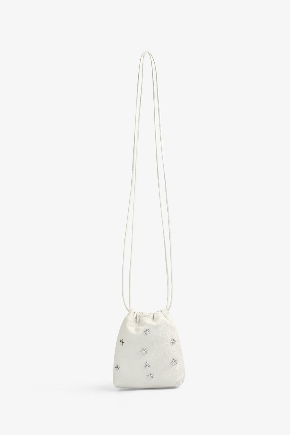 Small crossbody bucket bag. Made from 100% leather. Adjustable strap closure. Long double handle. Logo engraved on the back. Skull studs and stars detail on the front.