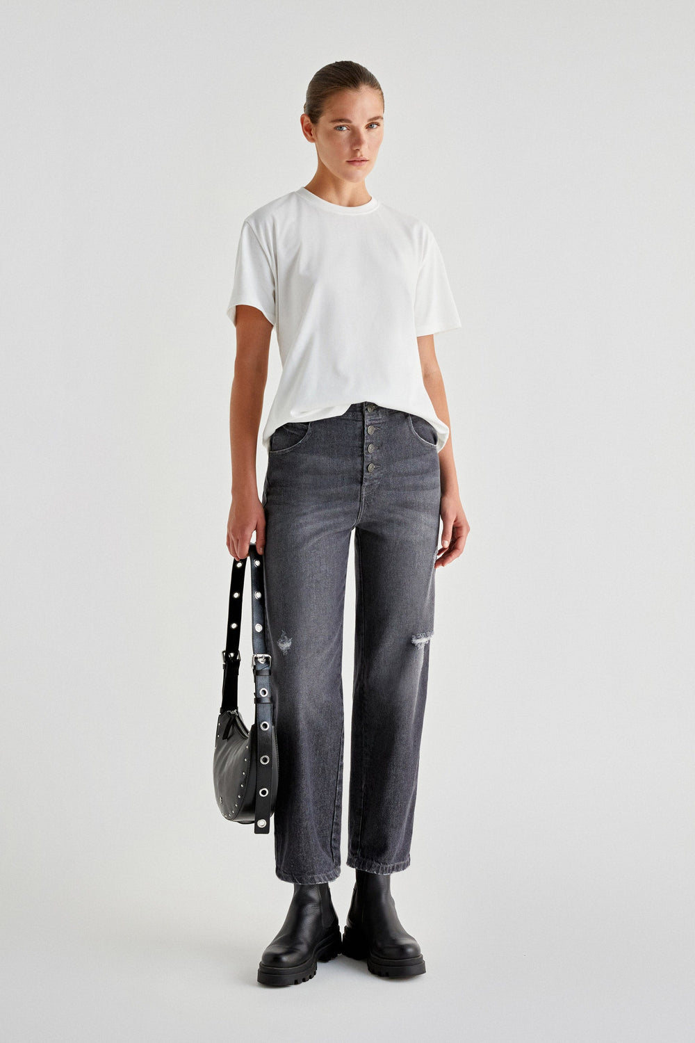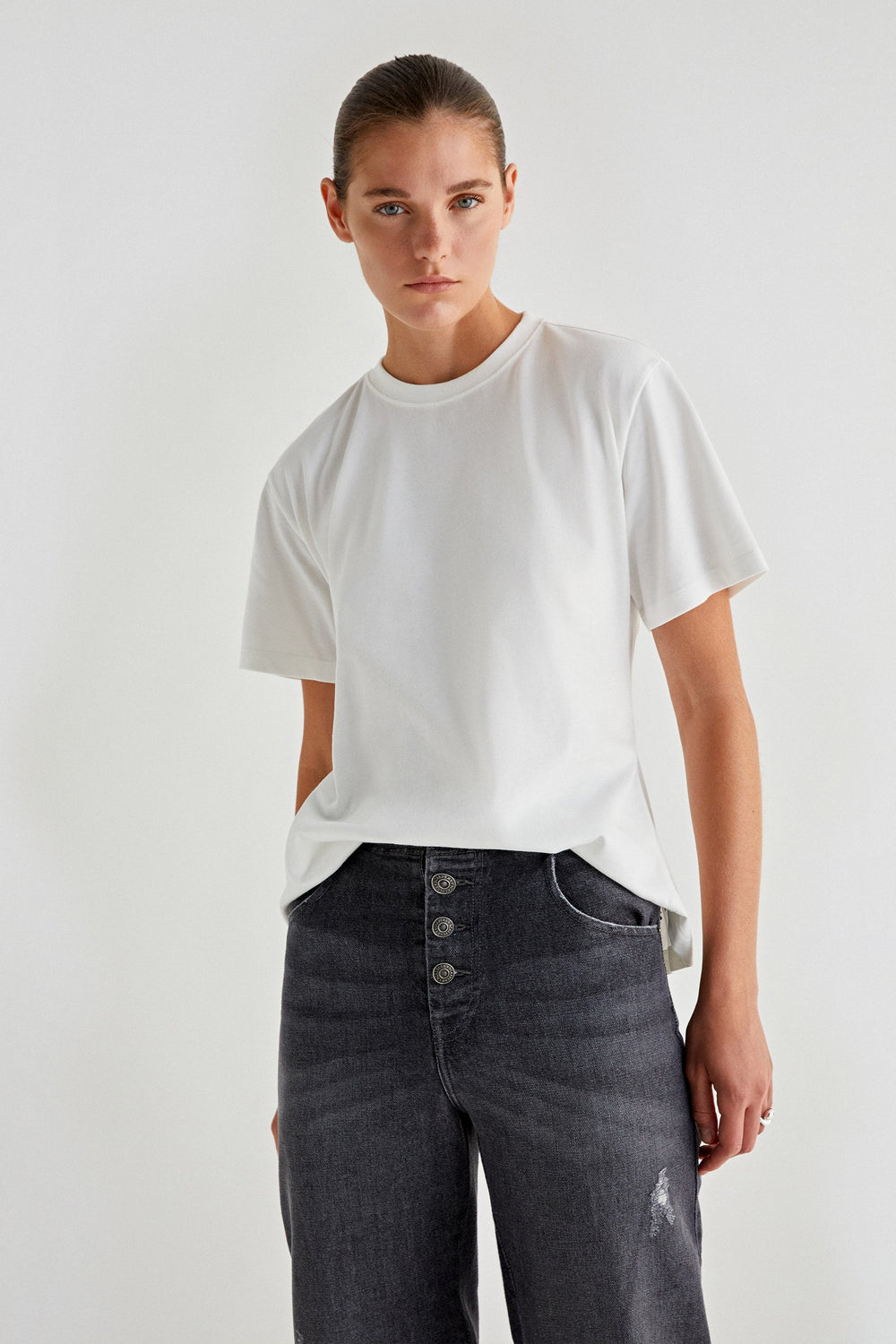 T-shirt made of 100% BCI cotton. Regular fit, round neck and short sleeves. Knot detail and back vents.
