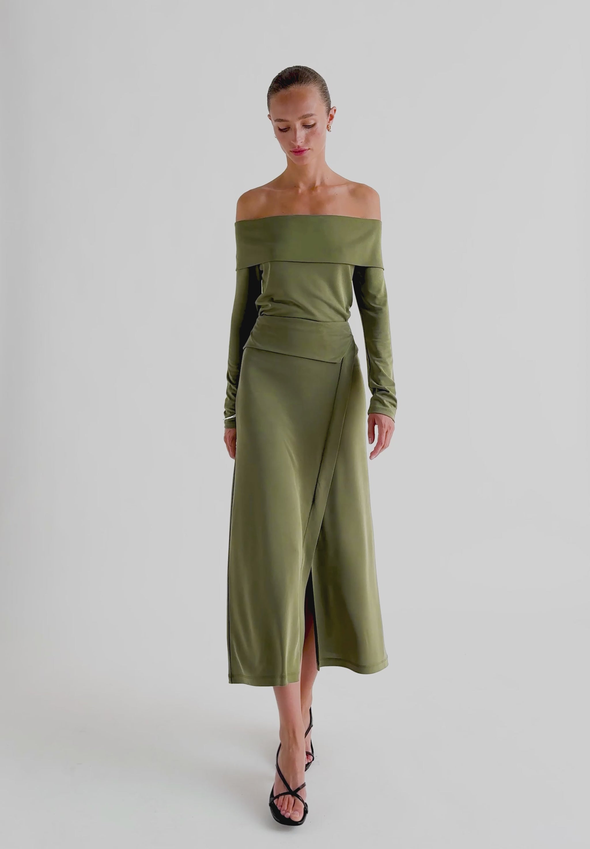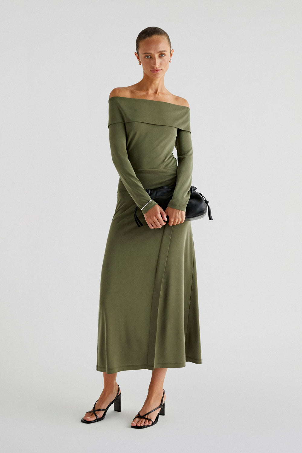 Top with a straight turn-up neckline. Made of flowing fabric. Long sleeves. Slim fit.