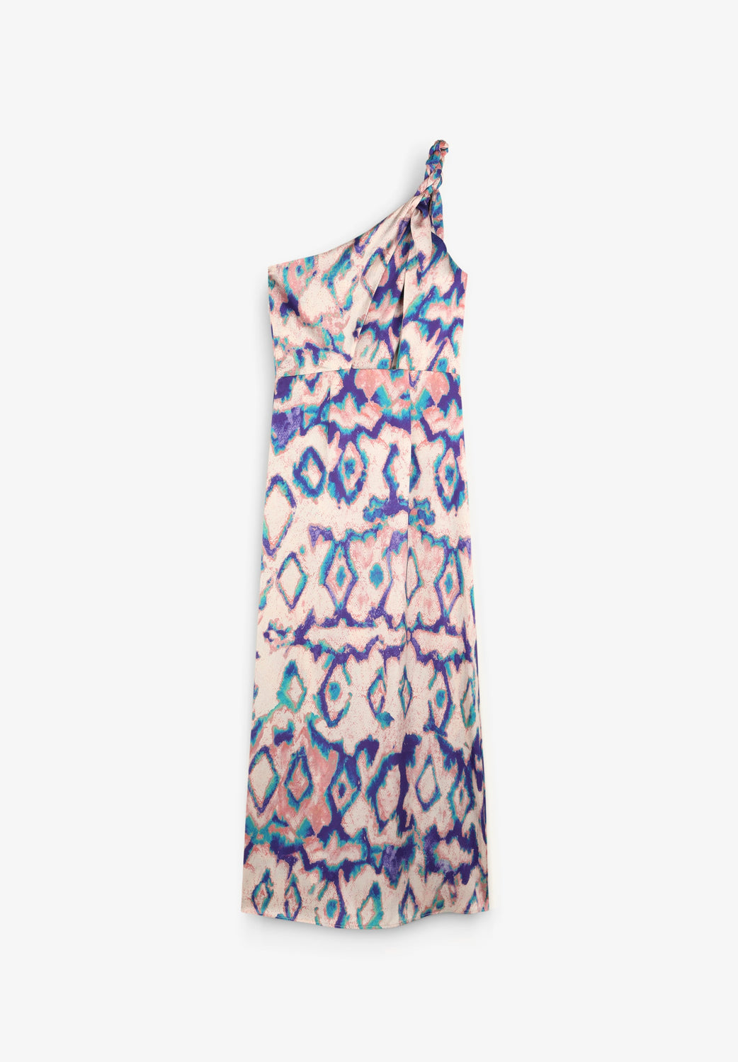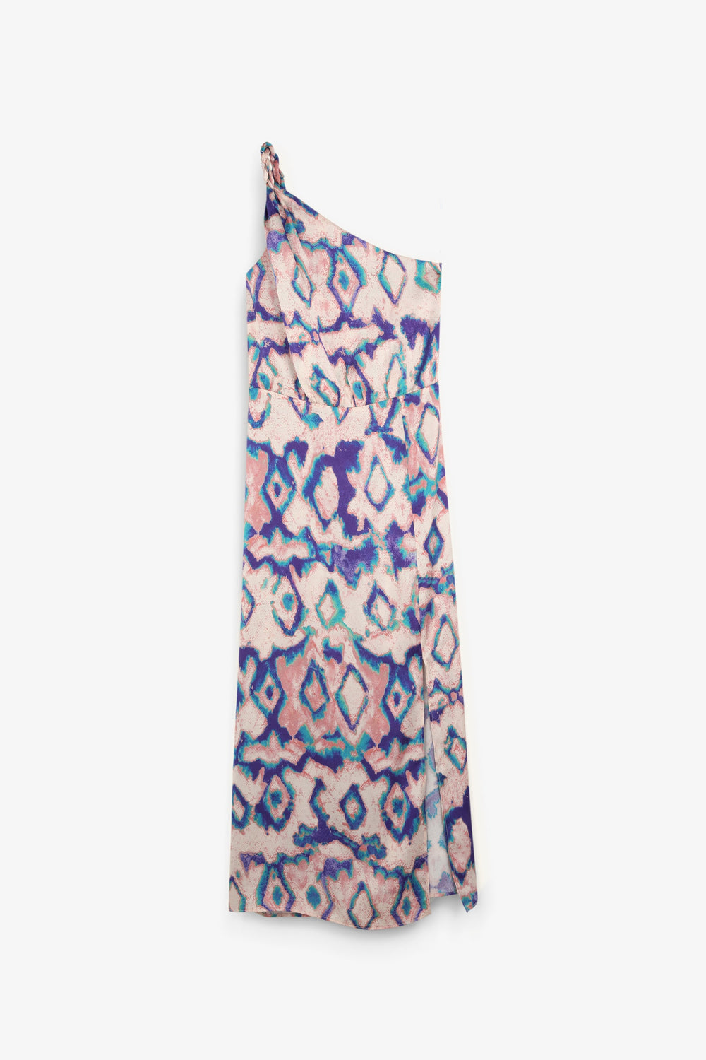 Midi print dress. Made of flowing fabric. Regular fit. Asymmetric neckline. Strap sleeves with knot detail. Open back. Slit on the hem.