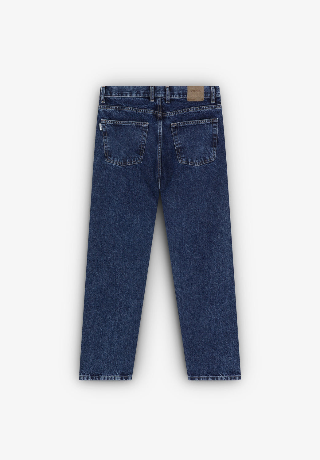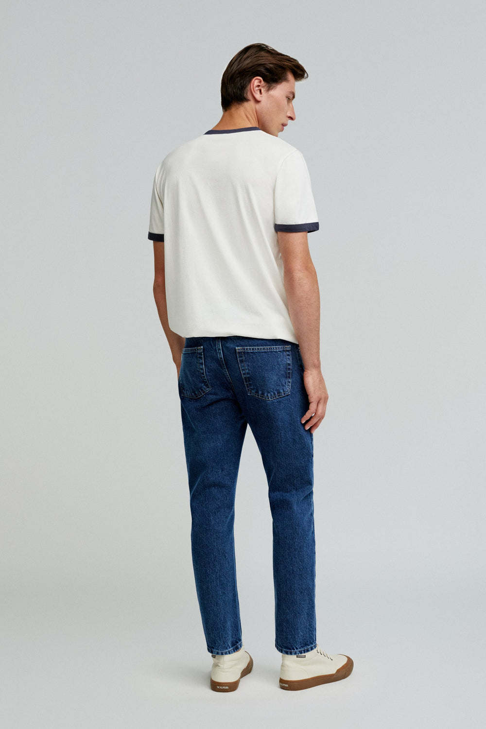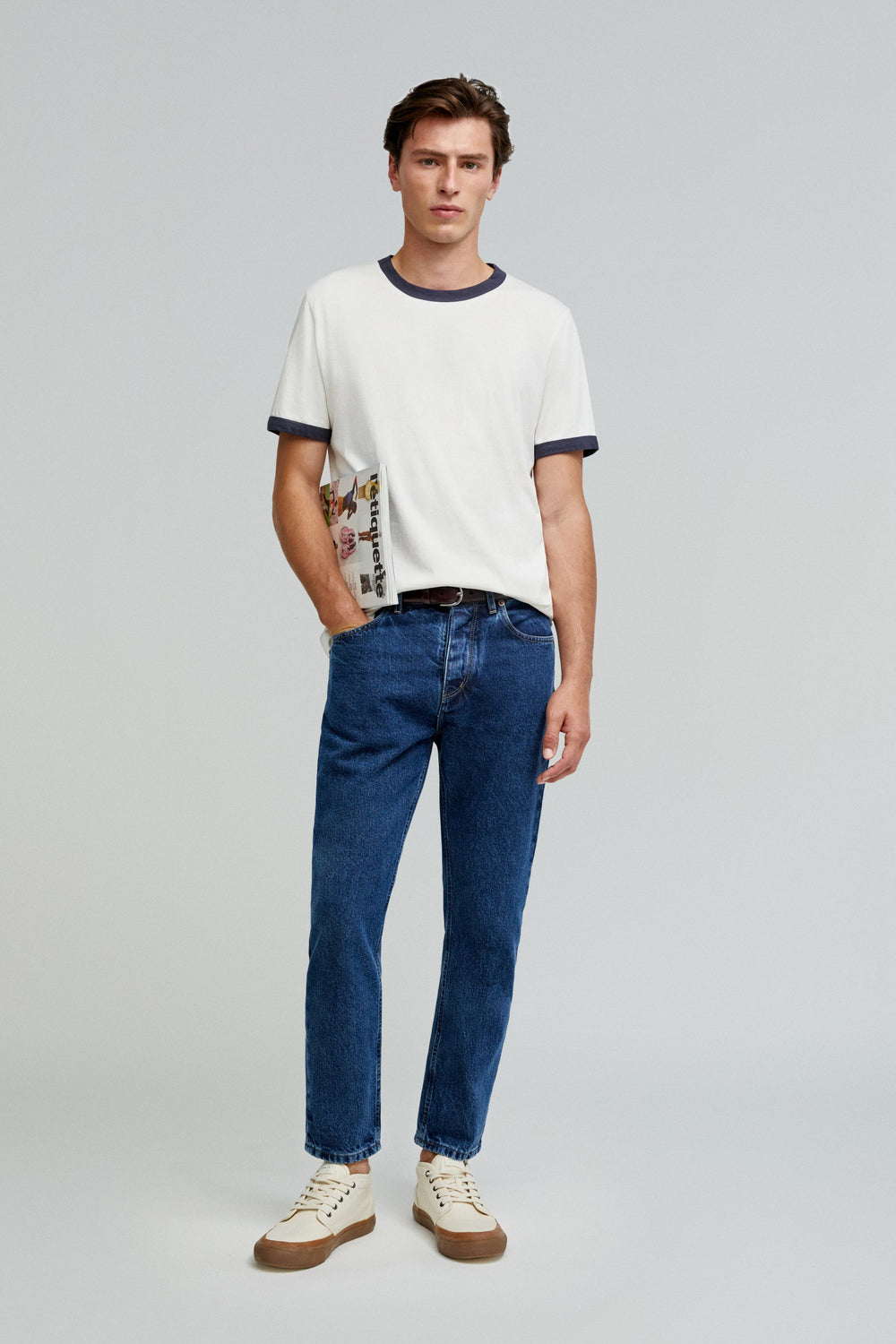 Jeans made of slightly stretch fabric. Cropped fit, top button and zip fly fastening and side and back pockets. Belt loops at the waist.