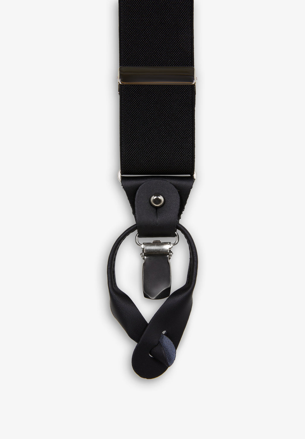Monochrome elasticated braces. Metal details. Leather trim.