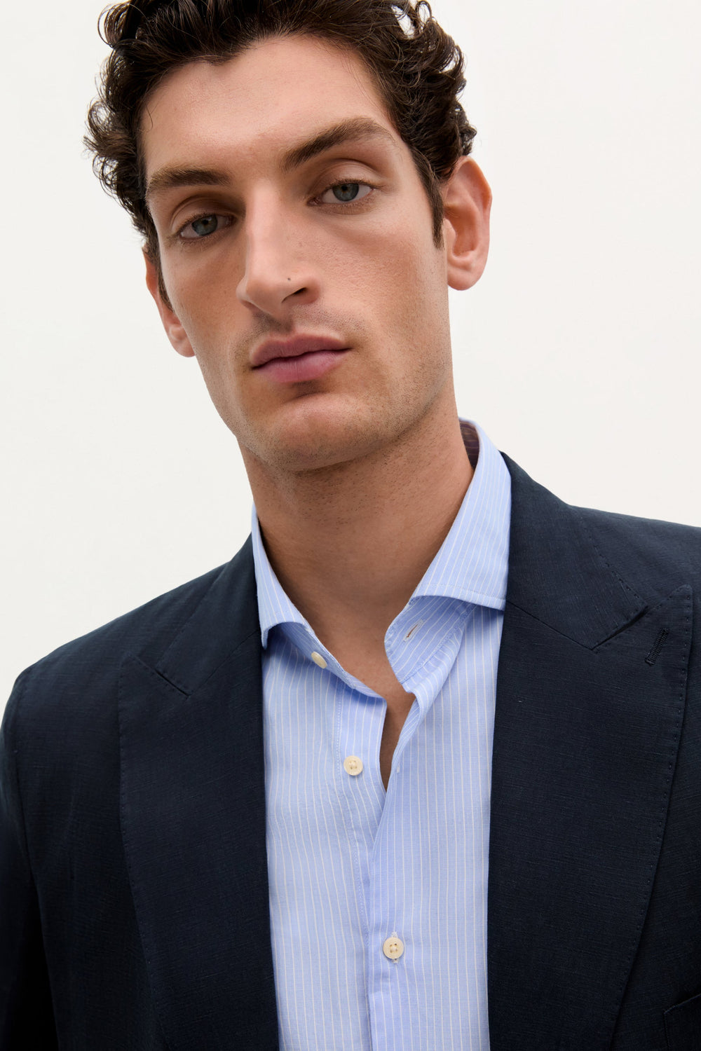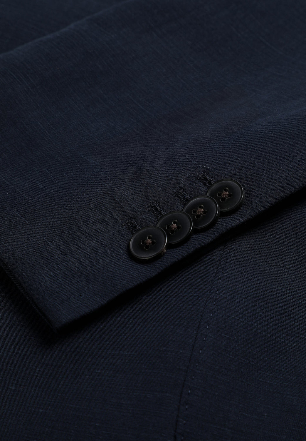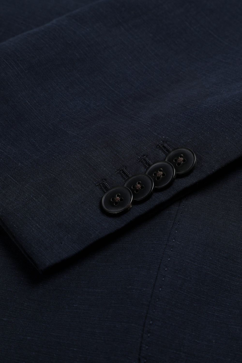 Chaqueta confeccionada en Lino de corte entallado sport. Cierre de botonadura simple. Solapas de muesca. Bolsillo de ojal en el pecho, bolsillos de solapa laterales. Abertura trasera. Forro interior.