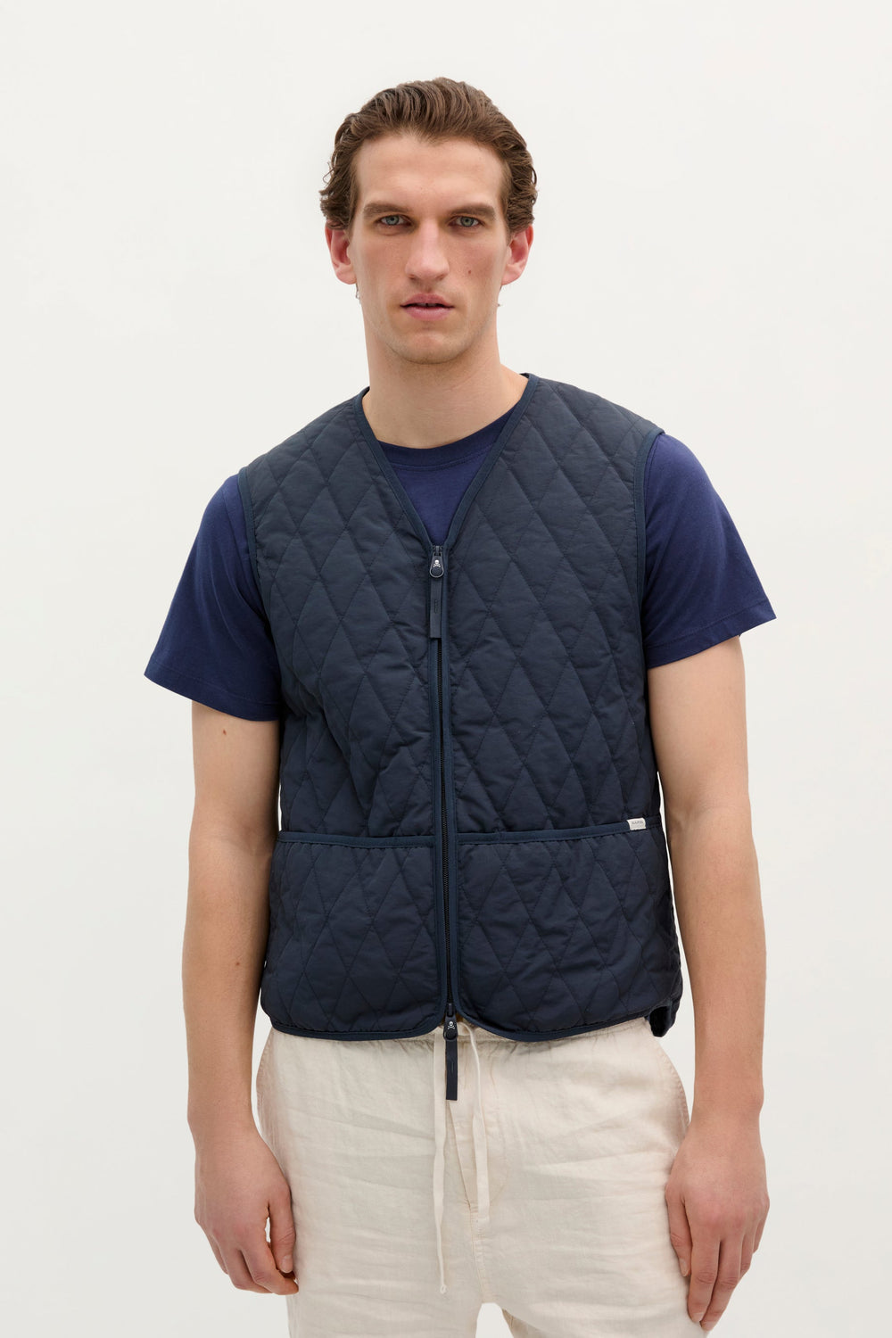 Puffer vest. Made in recycled nylon, regular fit and V-neck with double slider zip fastening. Front pockets with logo detail on label.