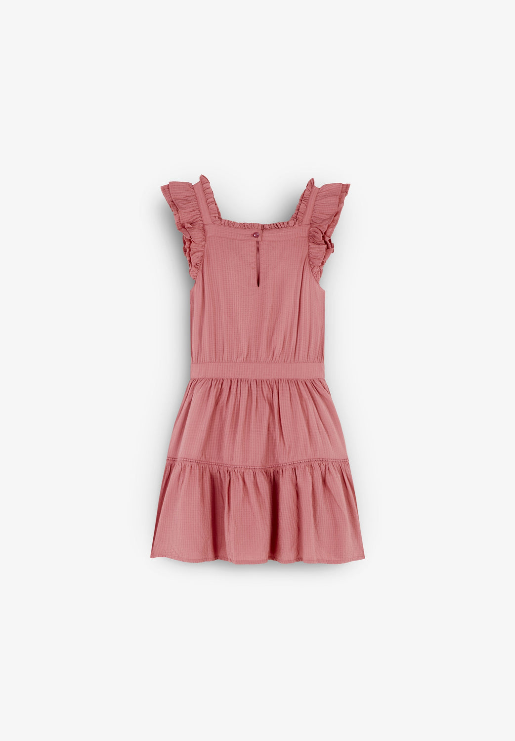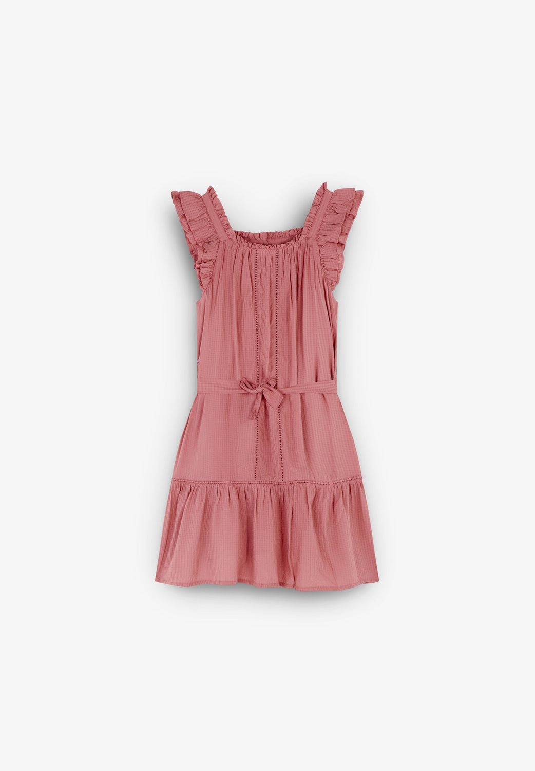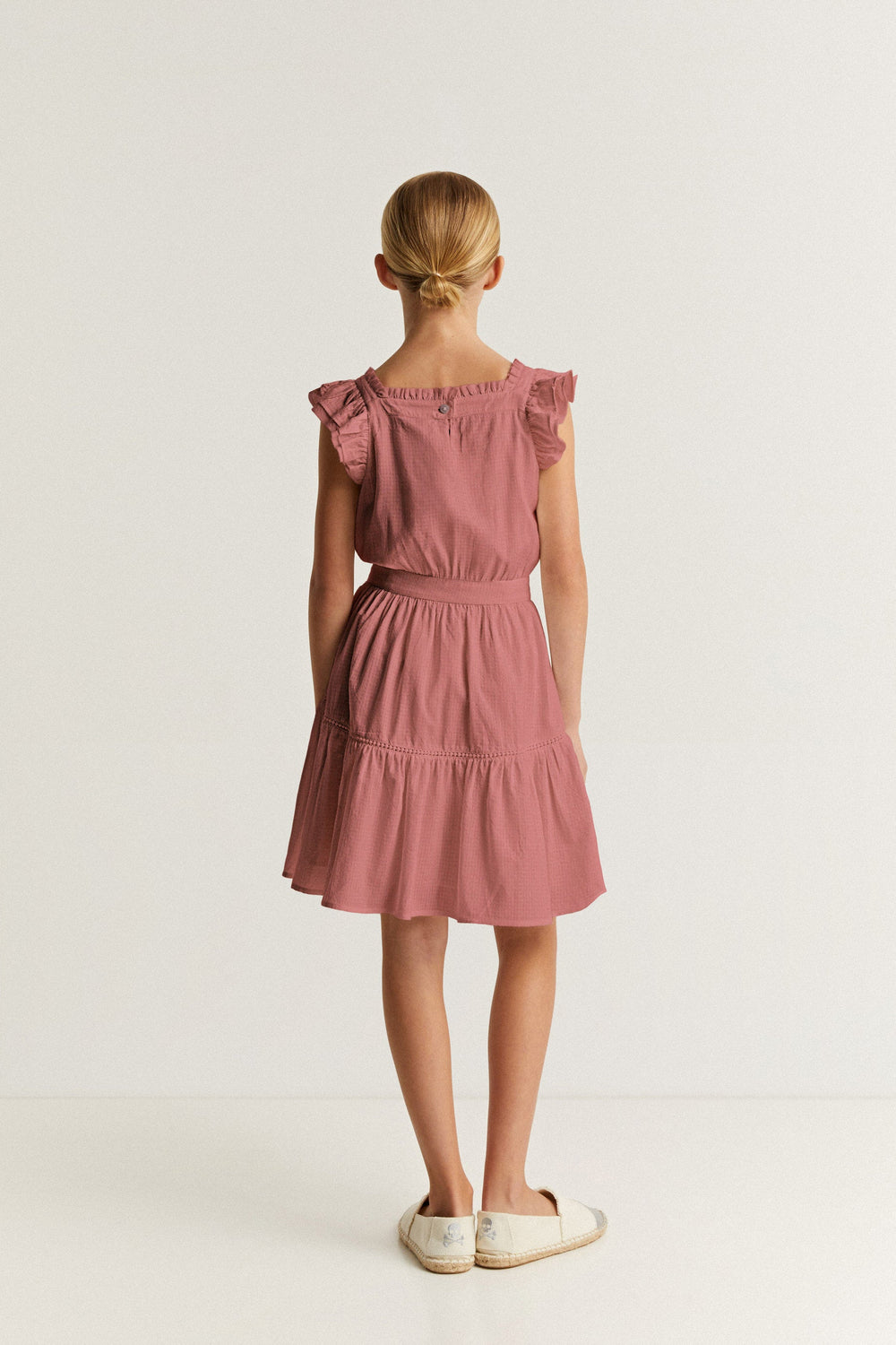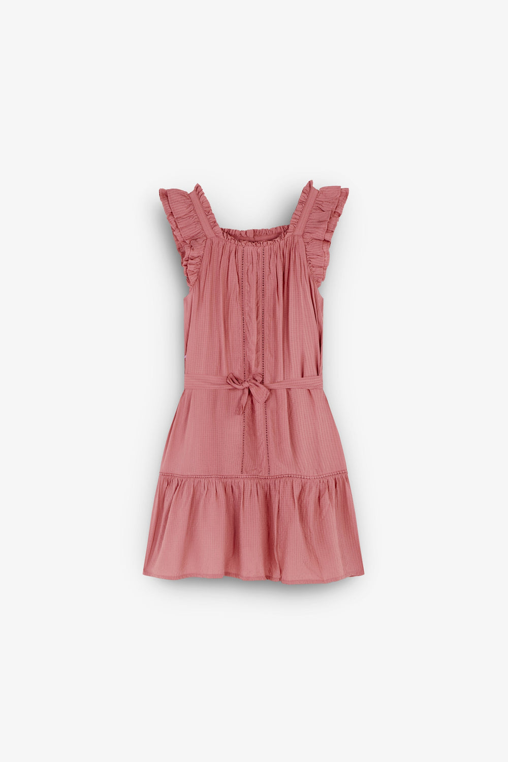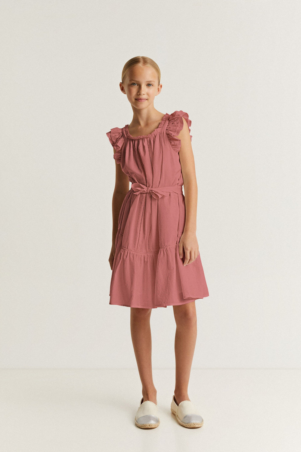 Dress with a ruffle and bow at the waist. Round gathered neck. Short sleeve with ruffle detail. Made of 100% cotton. Regular fit.
