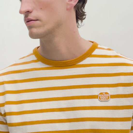 Striped T-shirt in rustic fabric. Made of 100% cotton. Regular fit. Round neck. Short sleeves. Chest patch with logo.