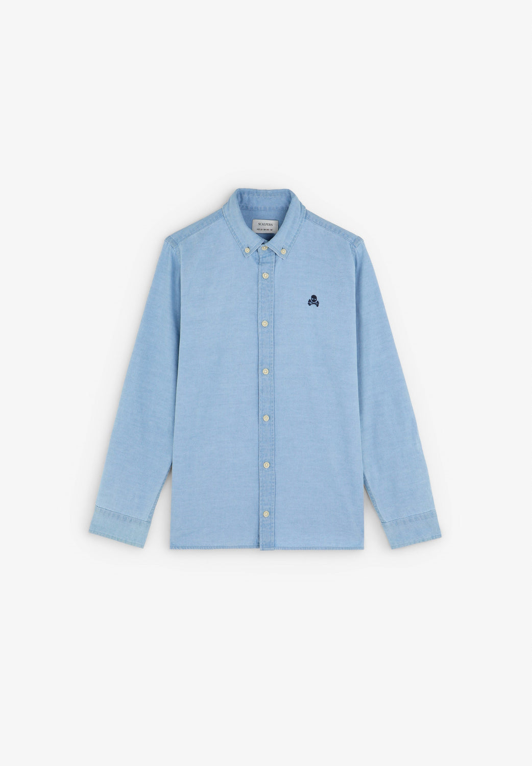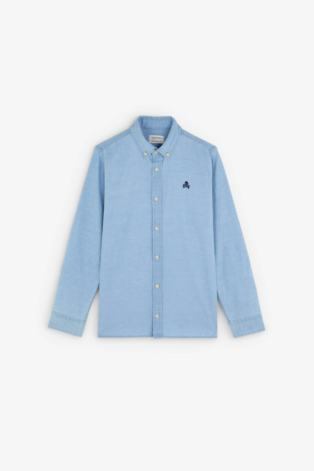 Denim shirt made of 100% BCI cotton. Regular fit, collar with buttons and button fastening. Long sleeves with buttoned cuffs and contrast embroidered skull.