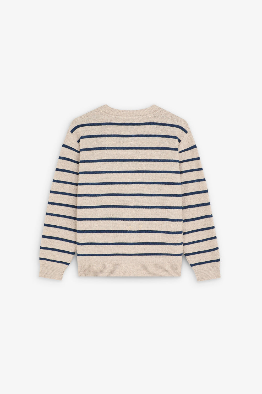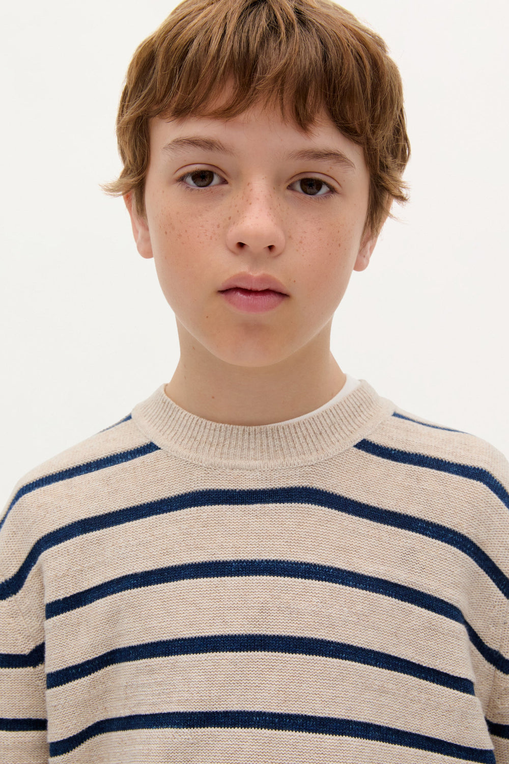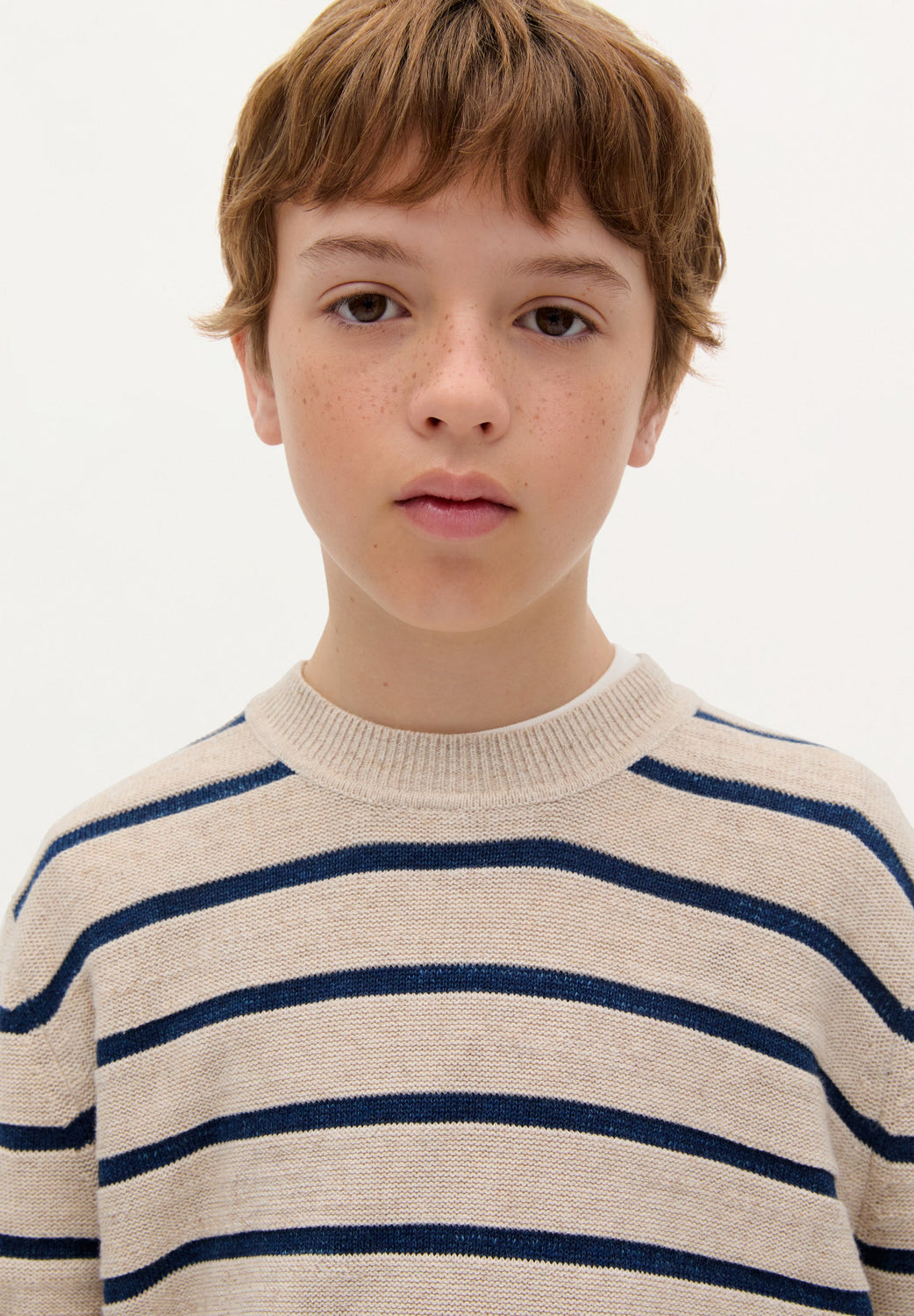 Striped round neck jumper. Blazer made of cotton and cashmere blend. Round neck. Long sleeves. Logo on label at hem.