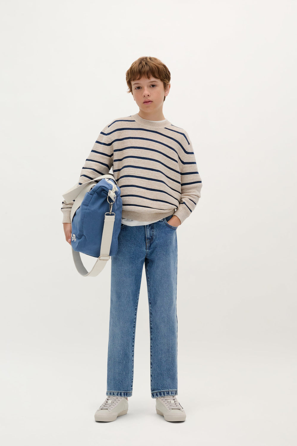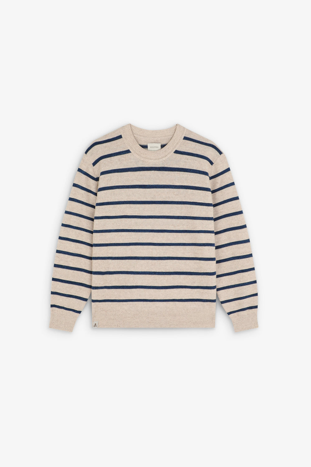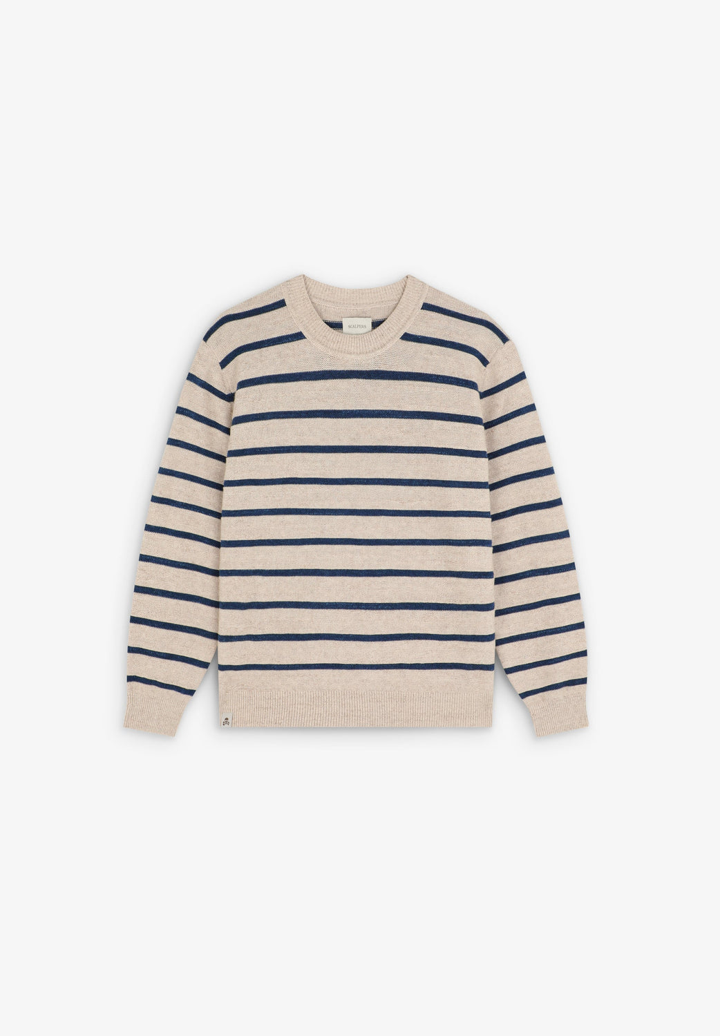 Striped round neck jumper. Blazer made of cotton and cashmere blend. Round neck. Long sleeves. Logo on label at hem.