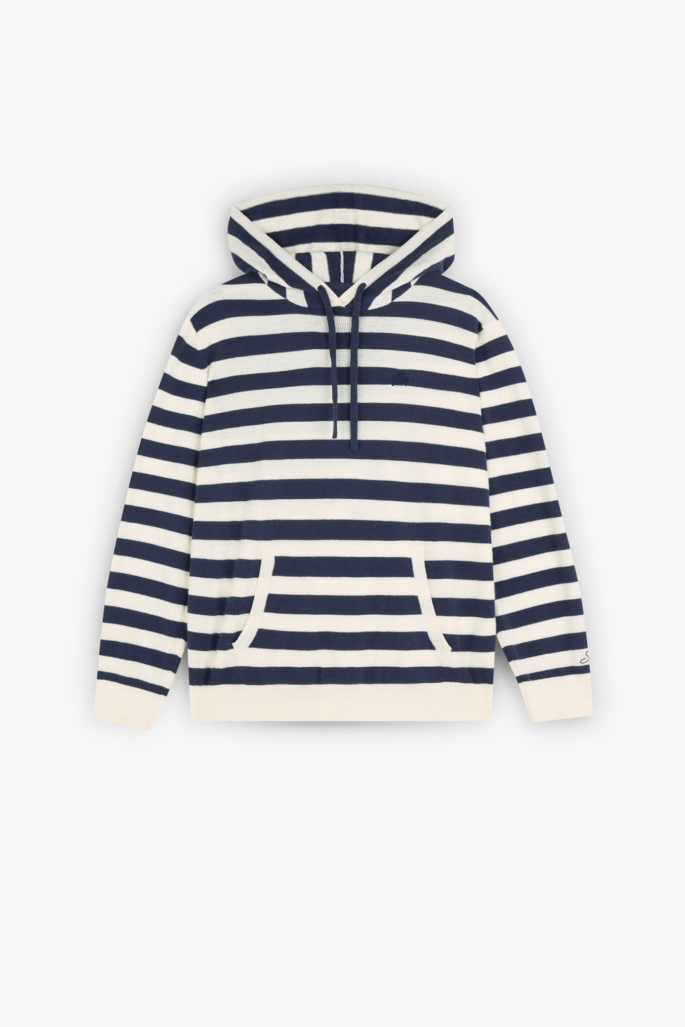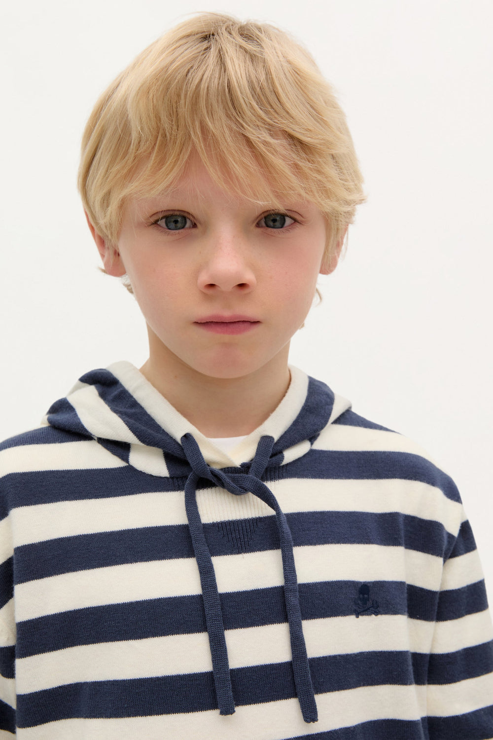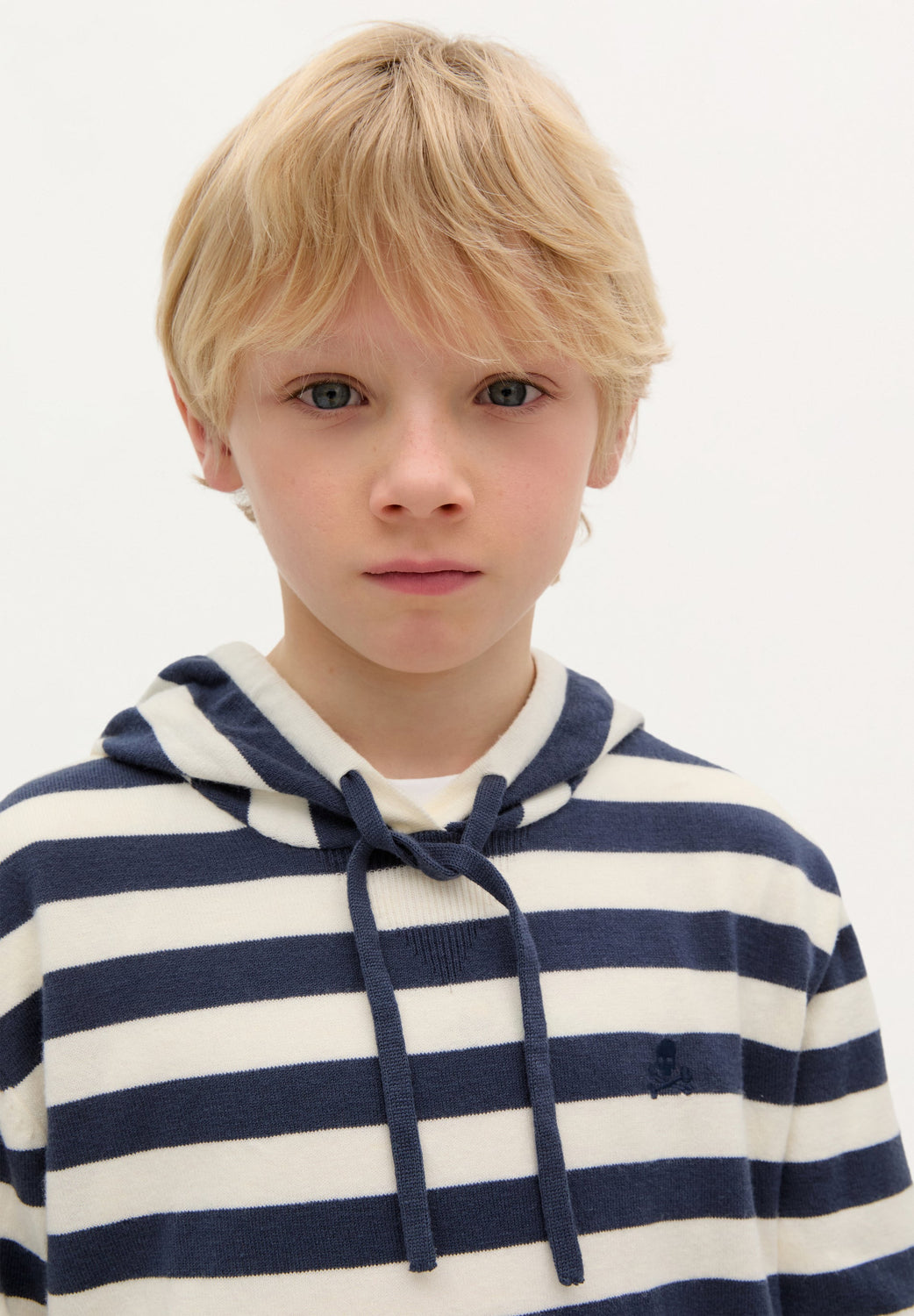 Striped sweater with hood and contrast details. Made of 100% BCI cotton. Regular fit. Collar with adjustable hood. Long sleeves with contrast cuffs. Pouch pocket. Contrast embroidered skull detail.