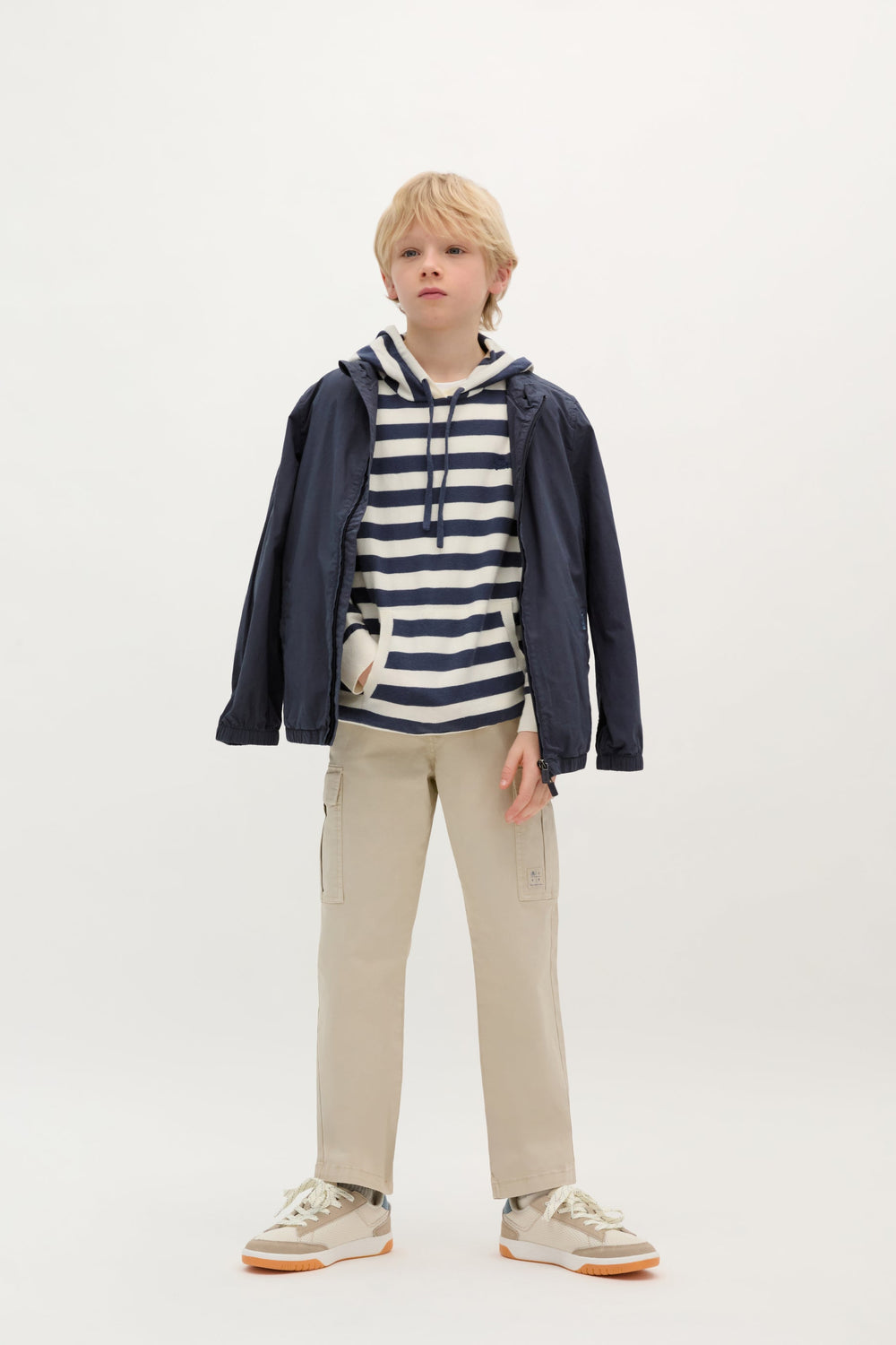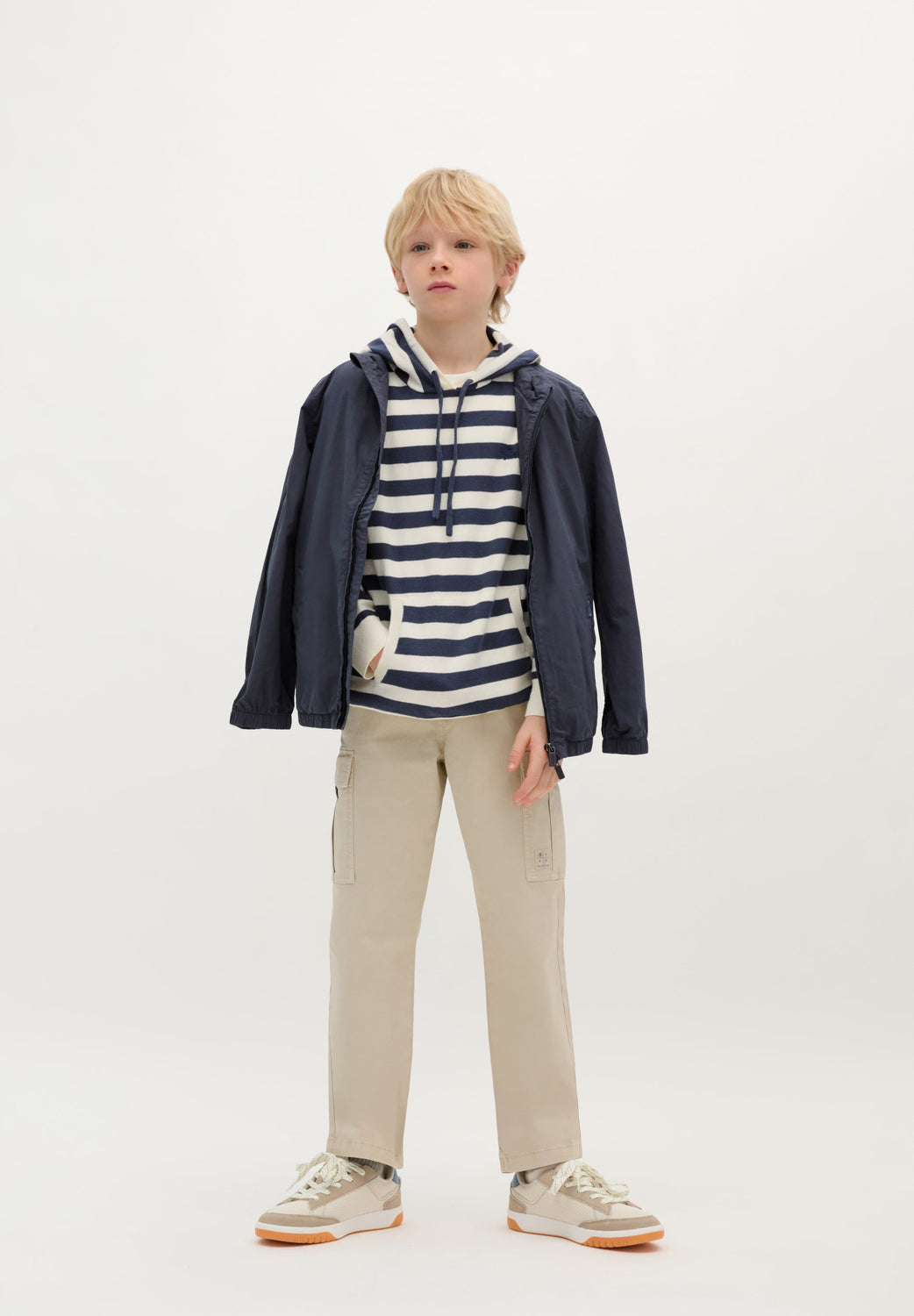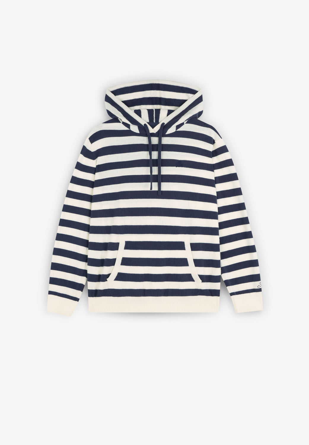 Striped sweater with hood and contrast details. Made of 100% BCI cotton. Regular fit. Collar with adjustable hood. Long sleeves with contrast cuffs. Pouch pocket. Contrast embroidered skull detail.