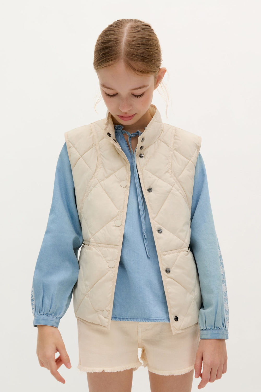 Puffer vest made of polyester. Regular fit with button fastening. Side slits, front magnetised pockets. Rubber patch detail on the back.
