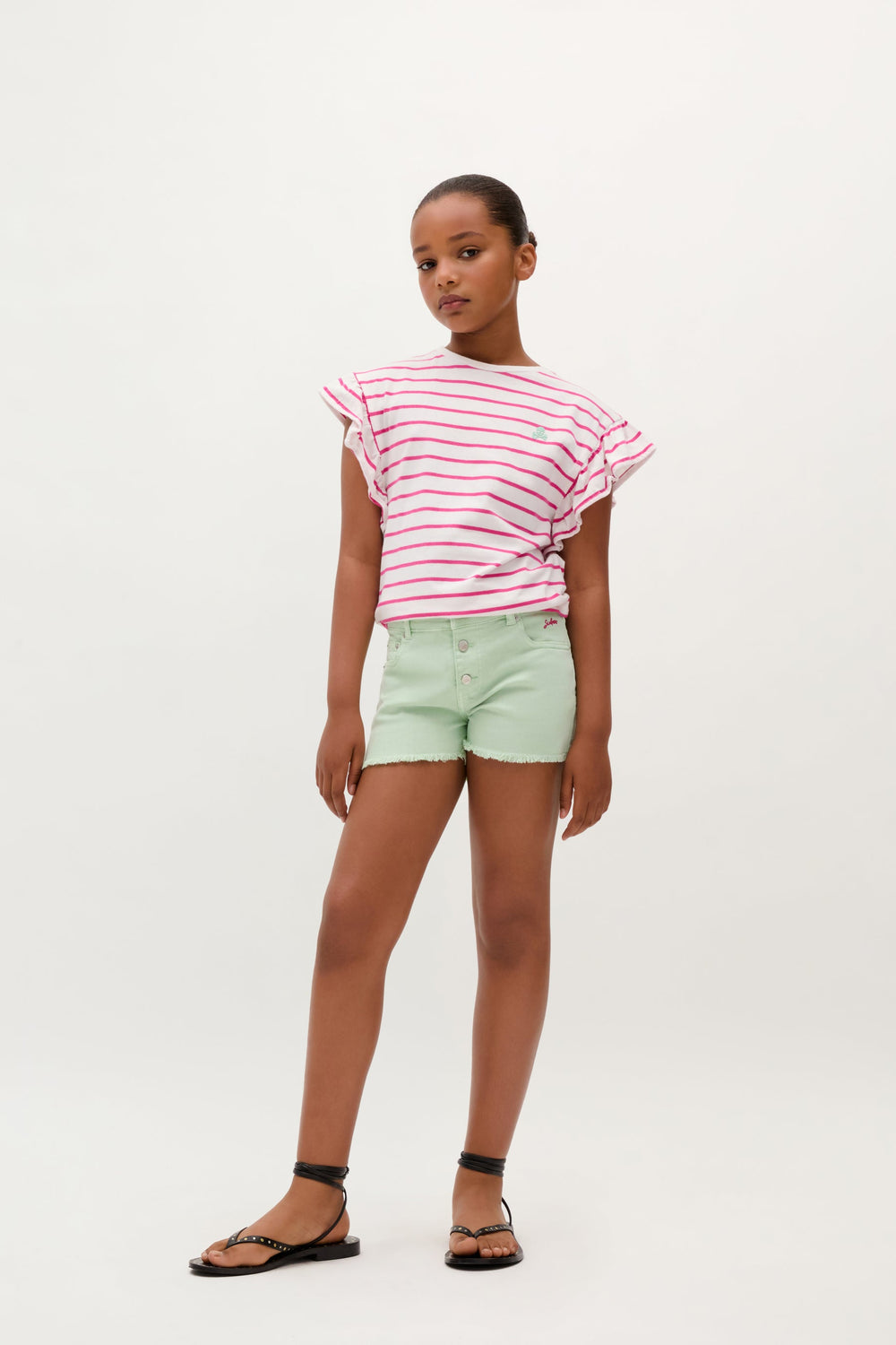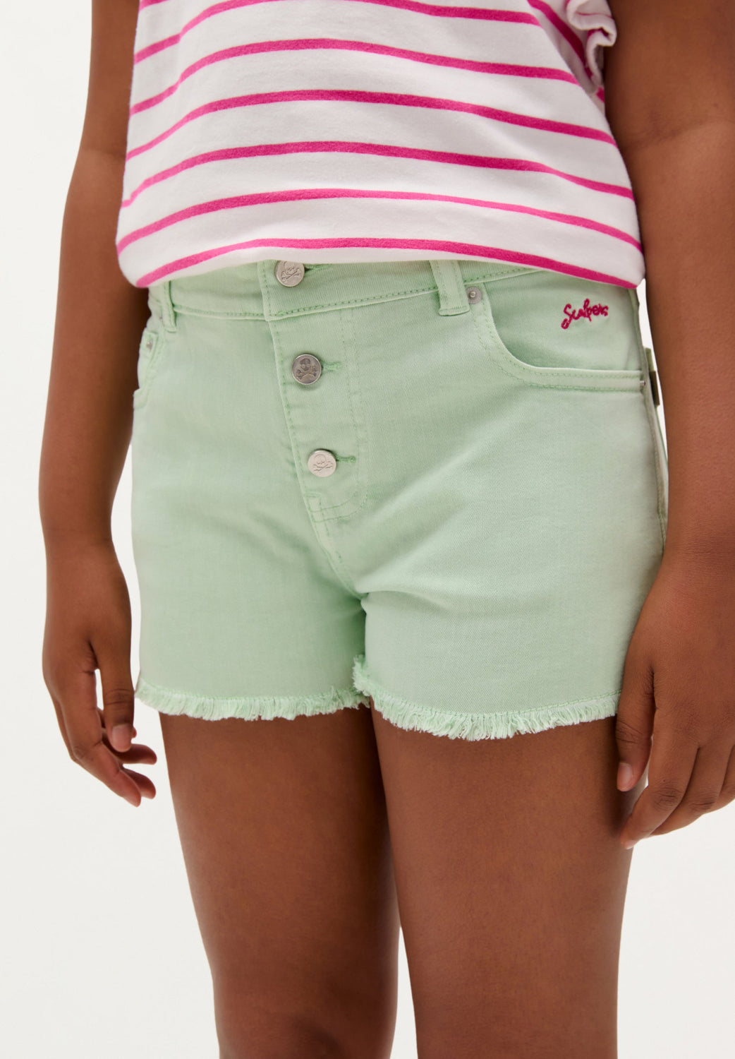 Bermuda shorts made of BCI cotton with front press stud fastening. Front pockets and back patch pockets with embroidered sun detail. Frayed hem. Logo detail on front pocket and back waistband.