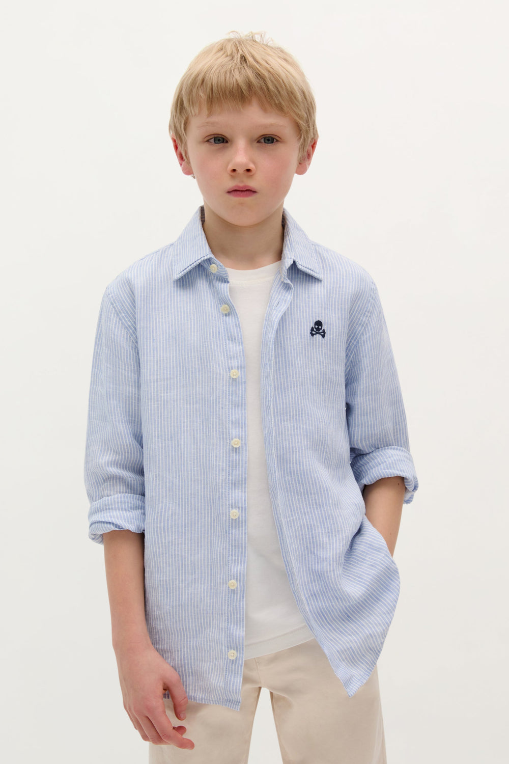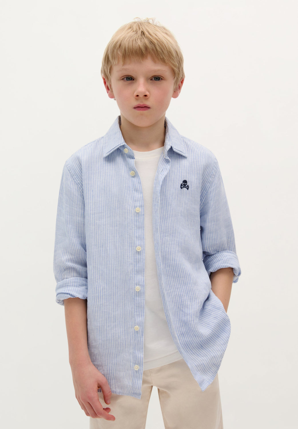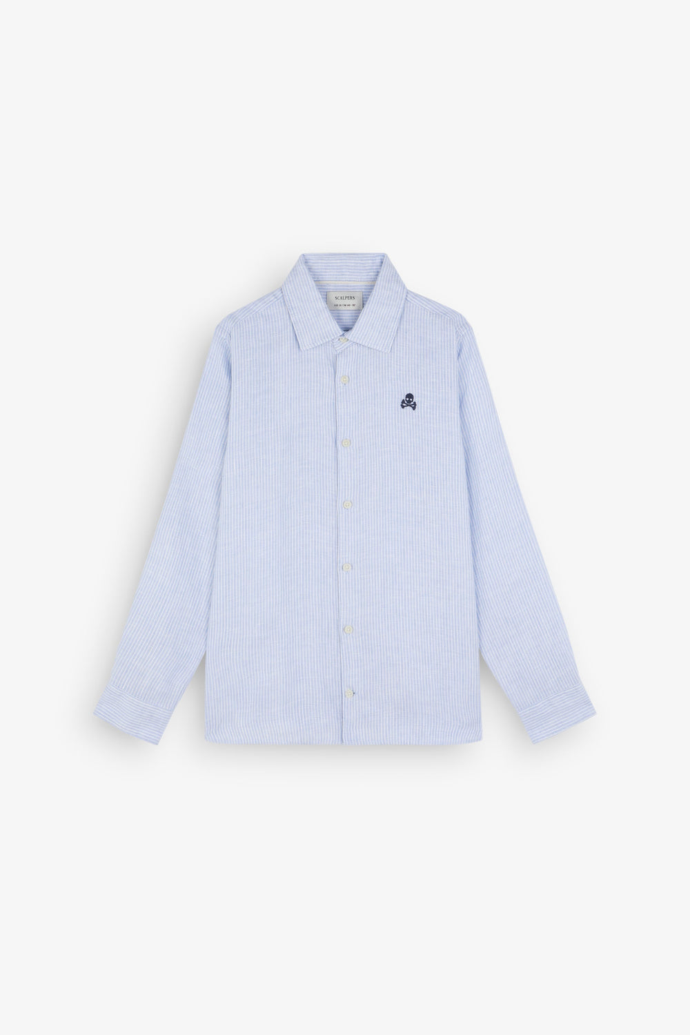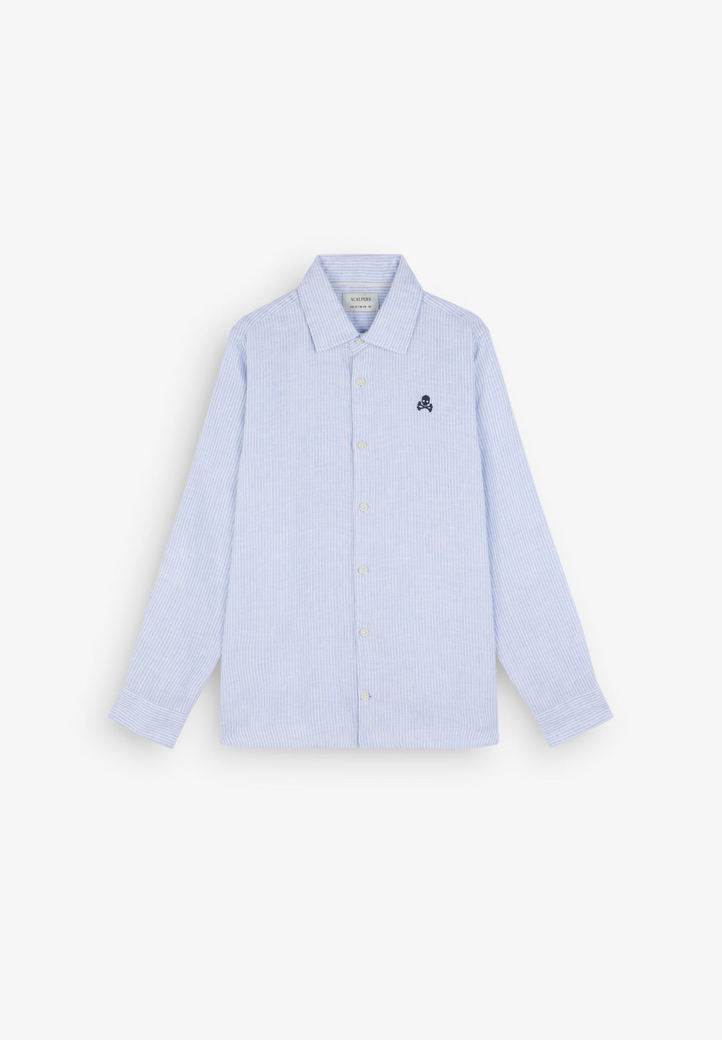Shirt made of 100% linen with striped print. Regular fit, classic collar and long sleeves with button cuffs. Button fastening and embroidered skull logo on chest.