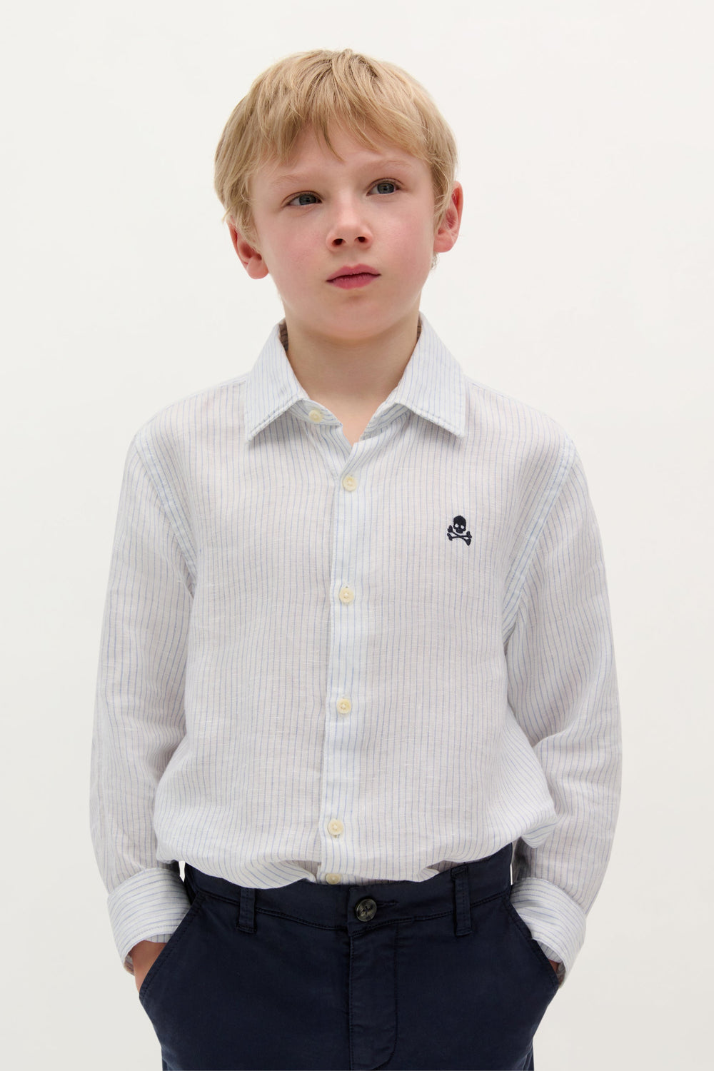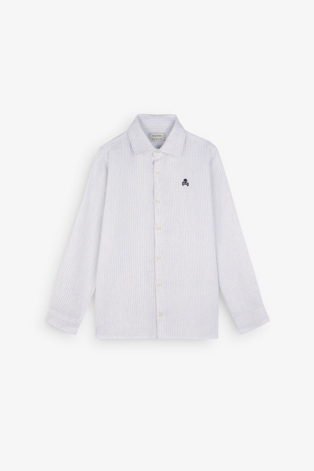 Shirt made of 100% linen with striped print. Regular fit, classic collar and long sleeves with button cuffs. Button fastening and embroidered skull logo on chest.