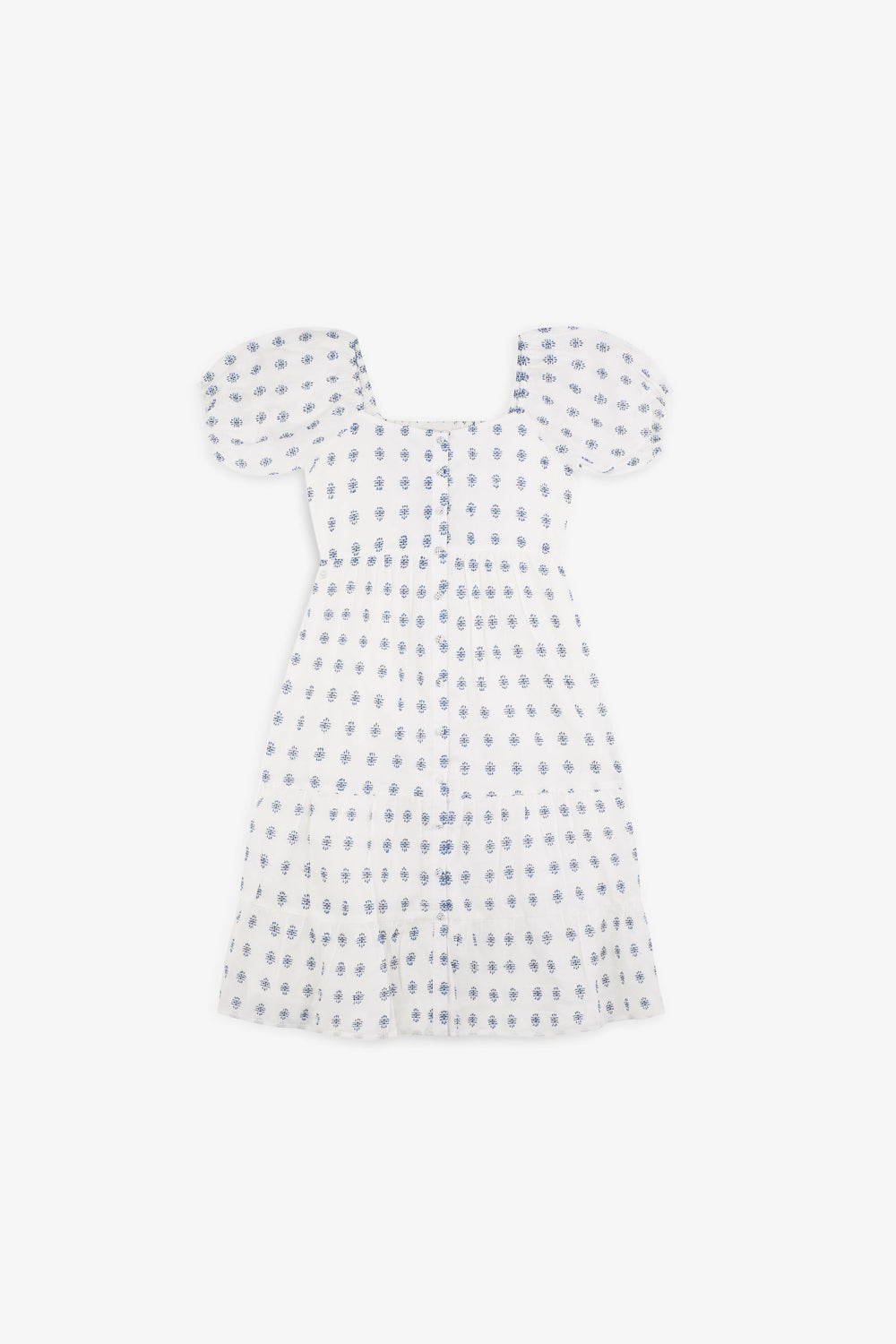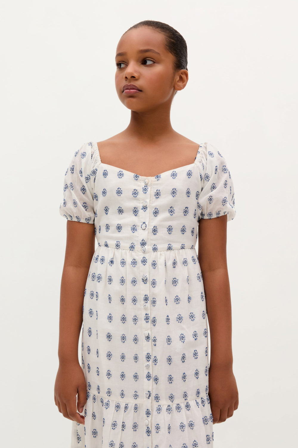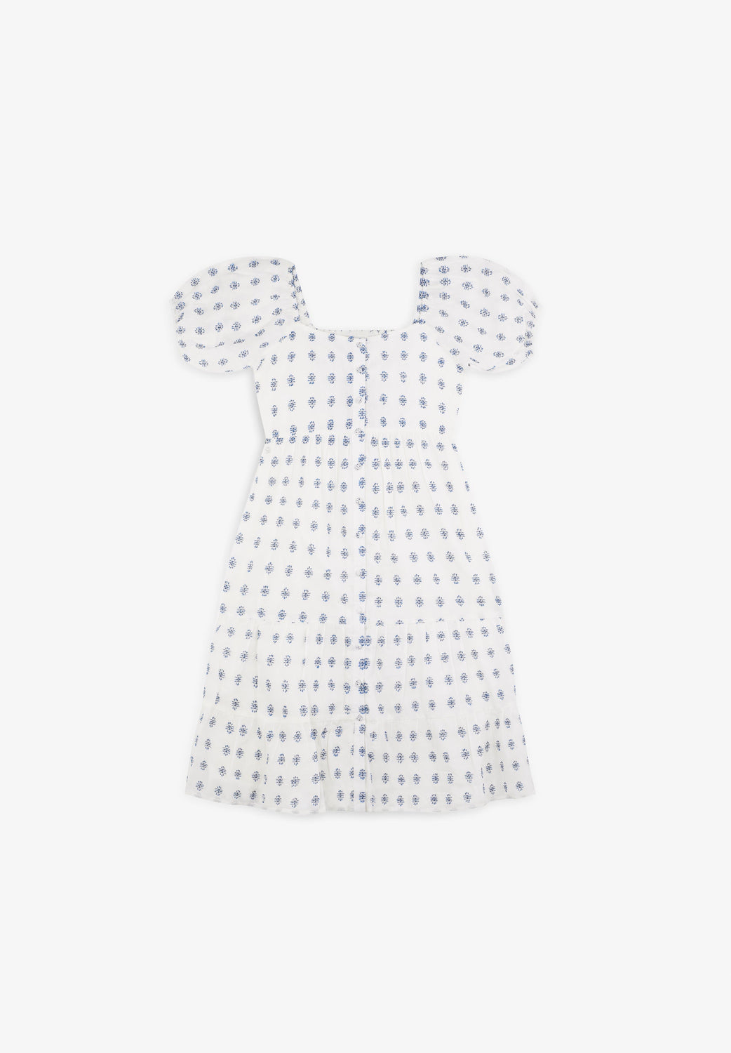 Dress made of 100% BCI cotton. Square-cut neckline. Puff sleeves. Lined. Smocking detail on the back. Front button fastening.