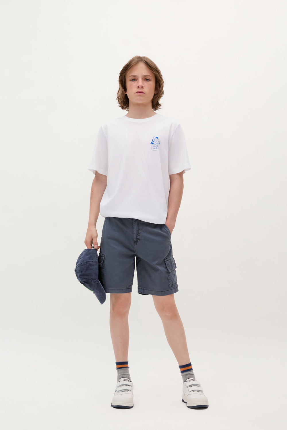 Bermuda shorts made of 100% organic BCI cotton. Front pockets, back patch pockets and flap pockets on sides. Front button fastening. Logo detail.