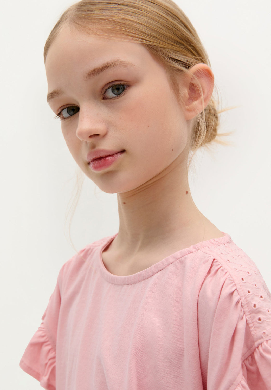 Shirt made of 100% BCI cotton with round neck and sleeveless with ruffle detail. Regular fit. Embroidered detail on shoulder pads and teardrop fastening on the back.