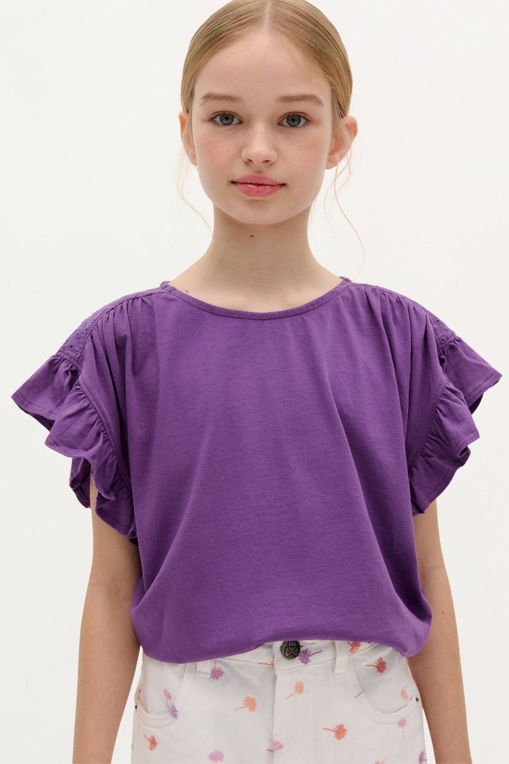 Shirt made of 100% BCI cotton with round neck and sleeveless with ruffle detail. Regular fit. Embroidered detail on shoulder pads and teardrop fastening on the back.