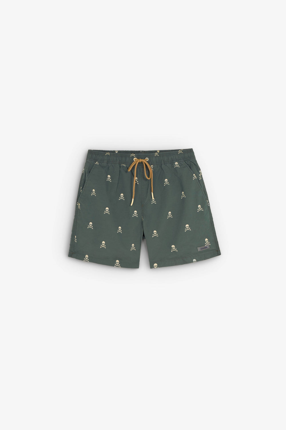 Cotton and nylon swimming trunks. Elasticated adjustable drawstring waistband. Printed monogram design with matte finish. Inner mesh lining. Side and front pockets with velcro fastening. Rubberised logo detail on the front left.