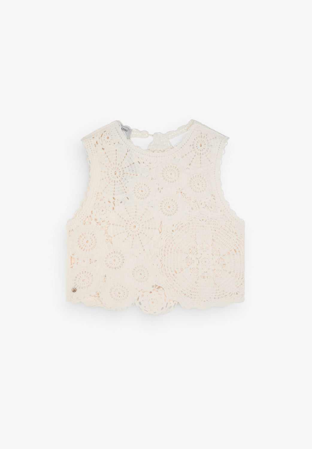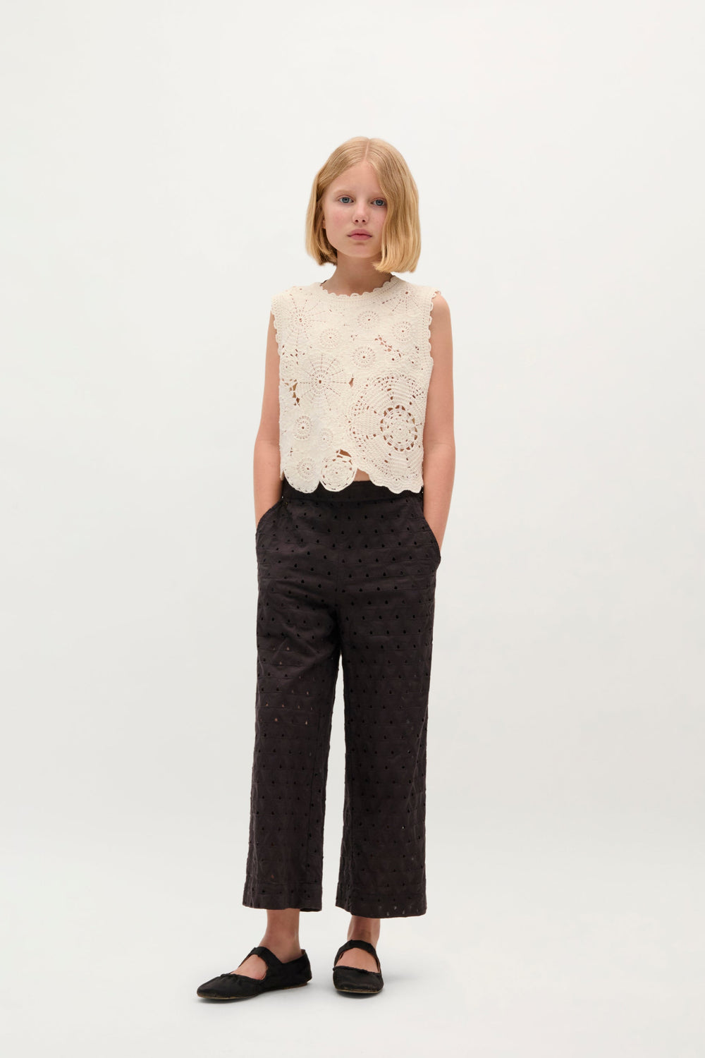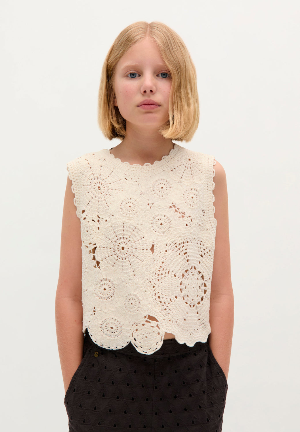 Top with crochet flower embroidery. Sleeveless design with round neck. Teardrop button fastening at the back. Metal logo tag detail on the hem.