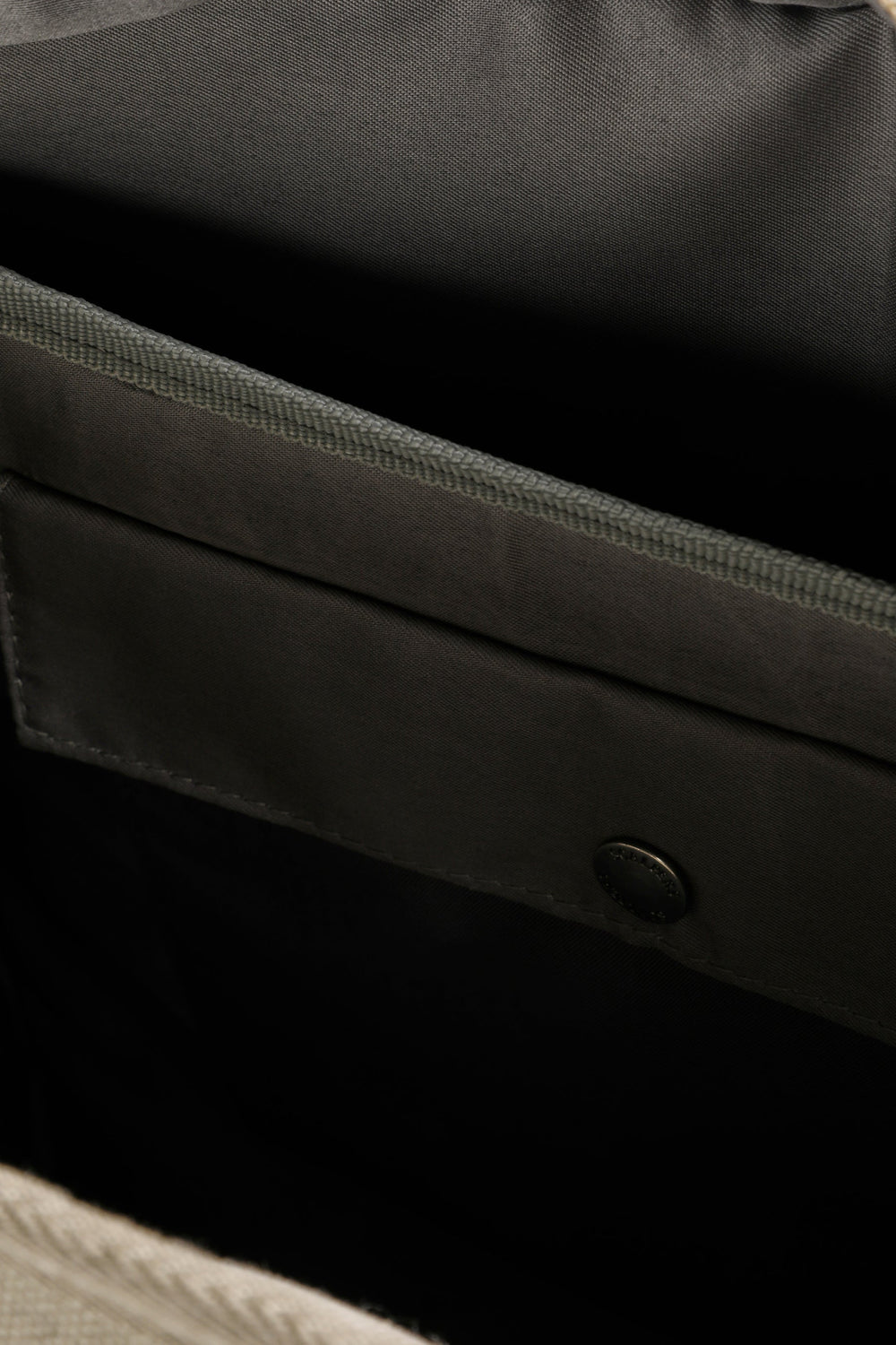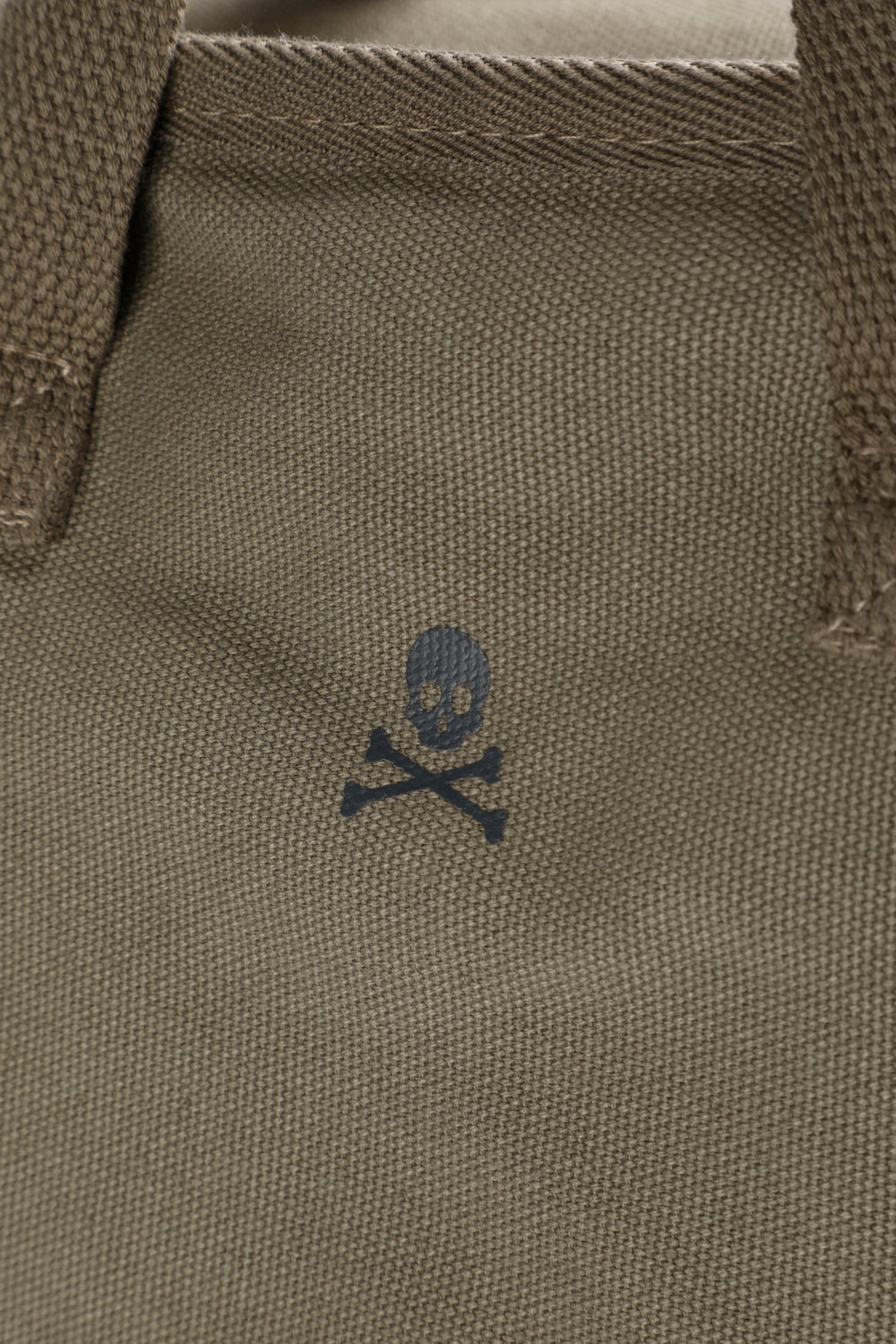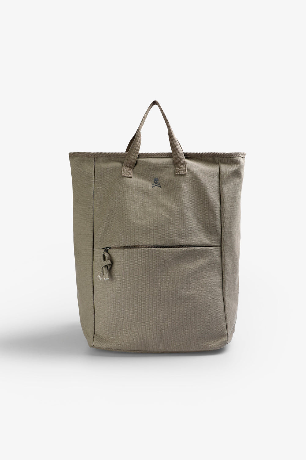 Backpack style bag. Made of recycled canvas fabric. Zip fastening. Inner pocket. Adjustable top and back short handles. Front logo and skull print detail.