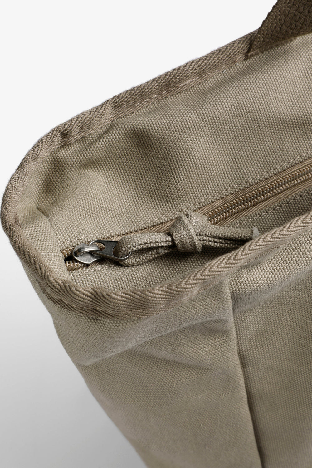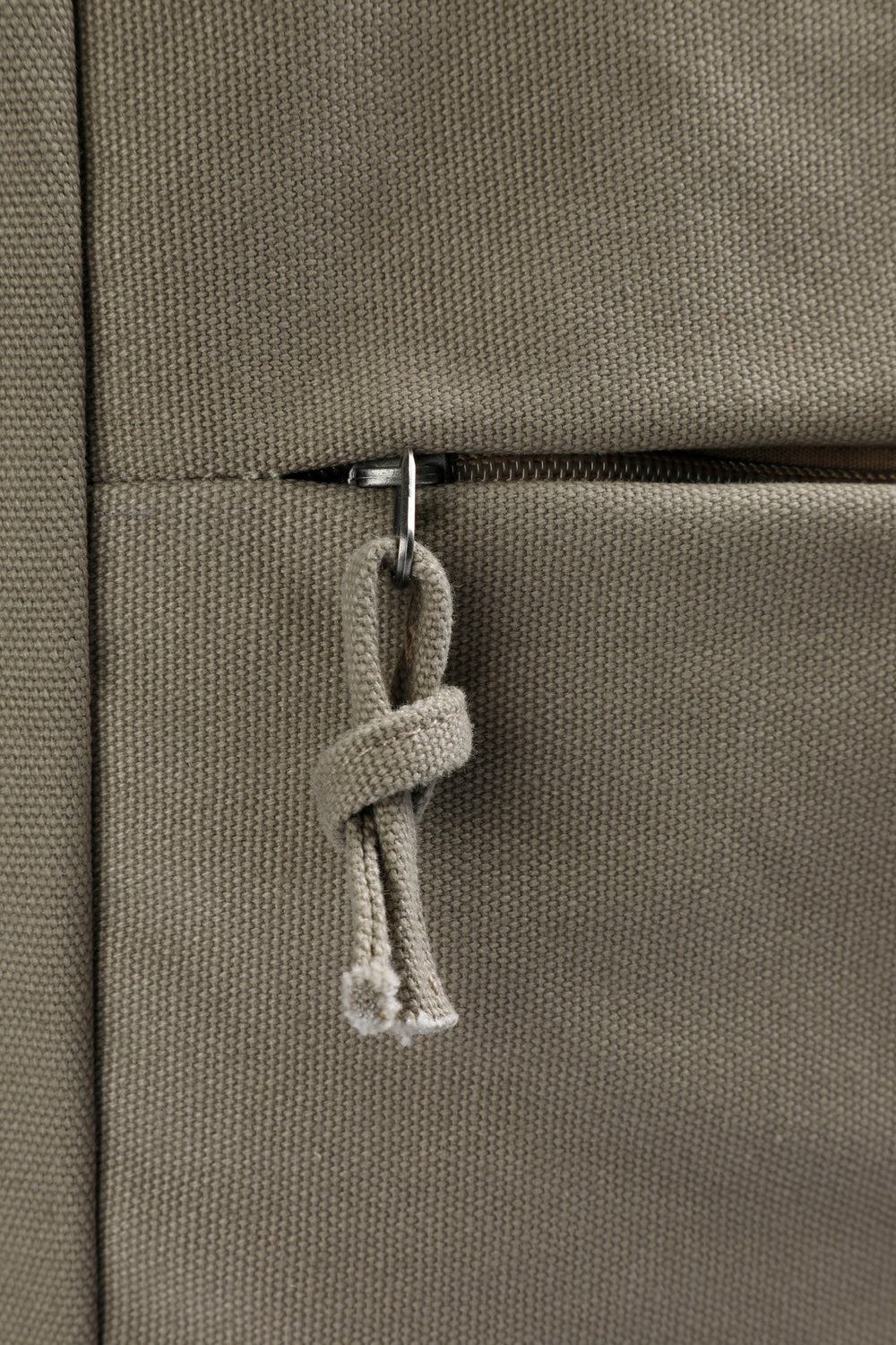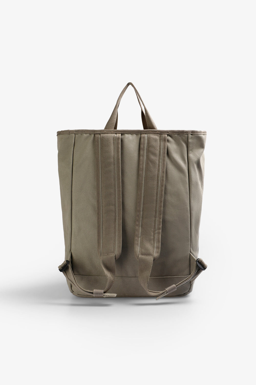 Backpack style bag. Made of recycled canvas fabric. Zip fastening. Inner pocket. Adjustable top and back short handles. Front logo and skull print detail.
