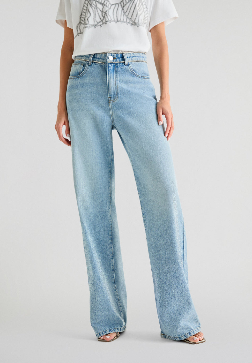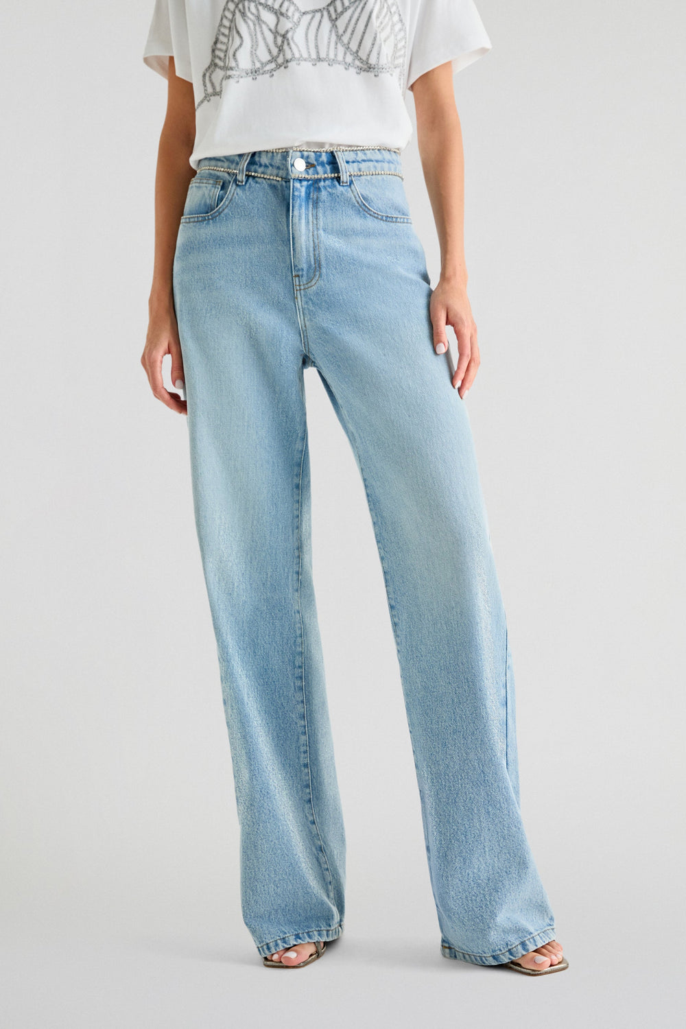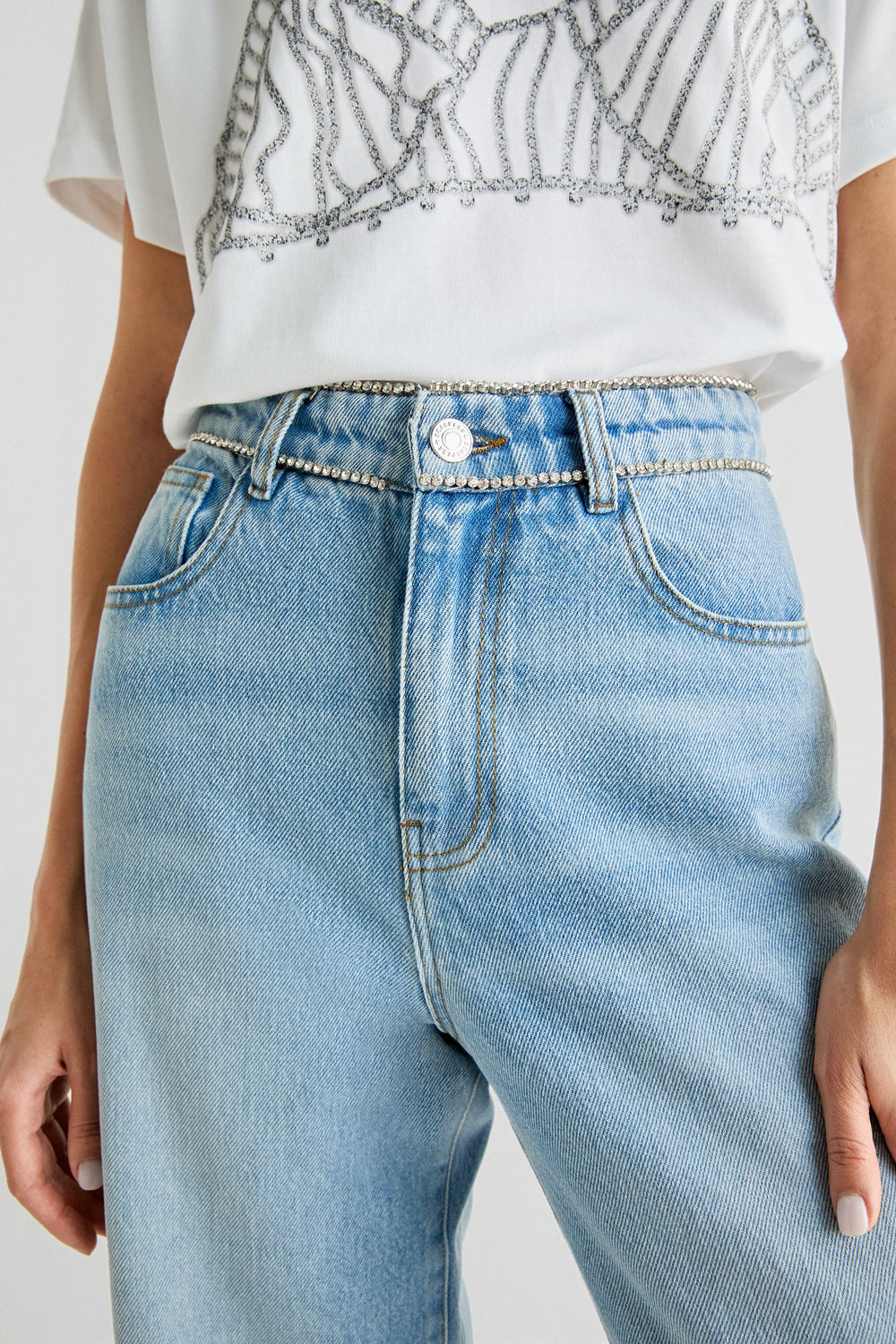 Jeans made of 100% cotton. Full length fit, button and zip fly fastening. Front and back pockets and belt loops. Crystal details at the waist.