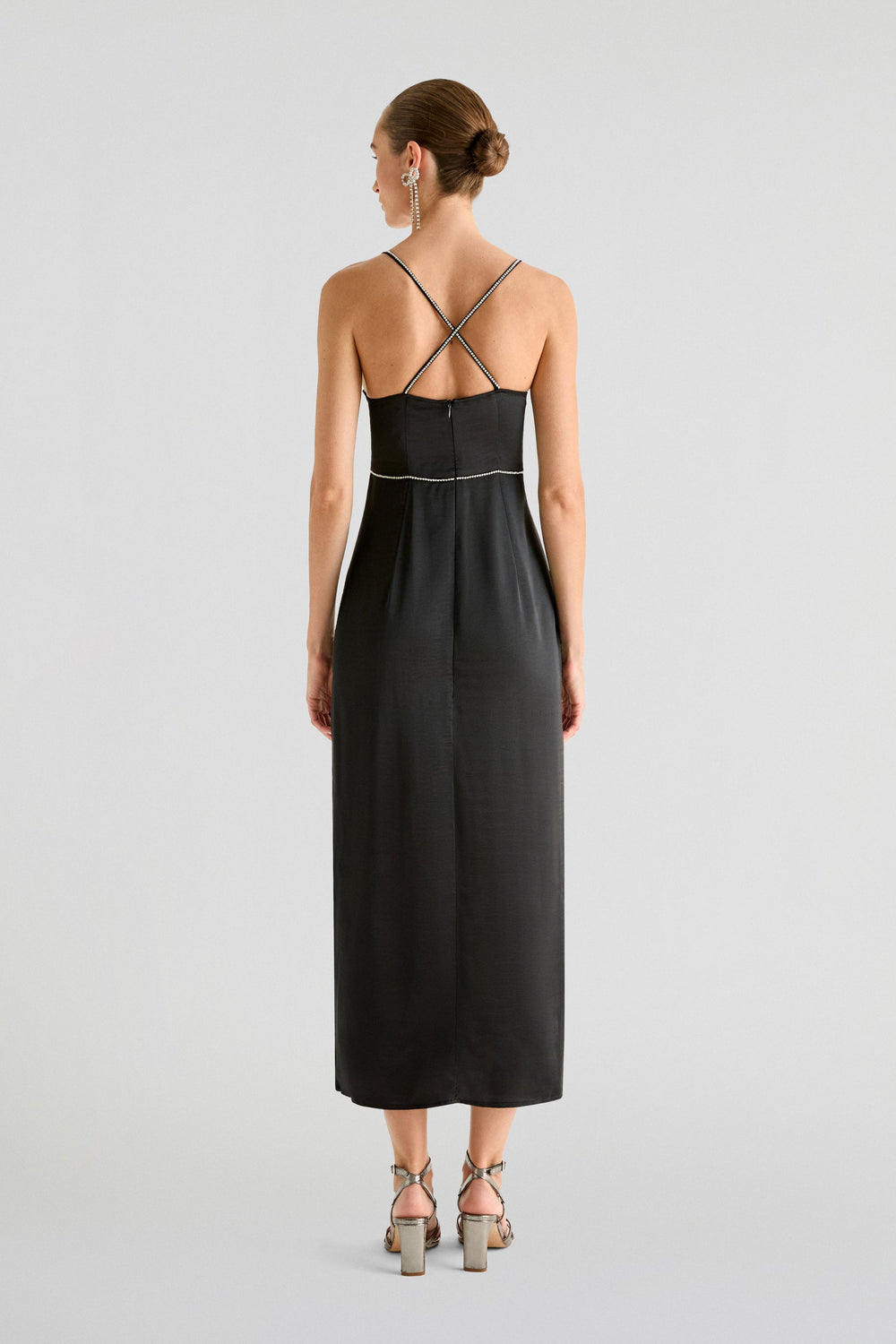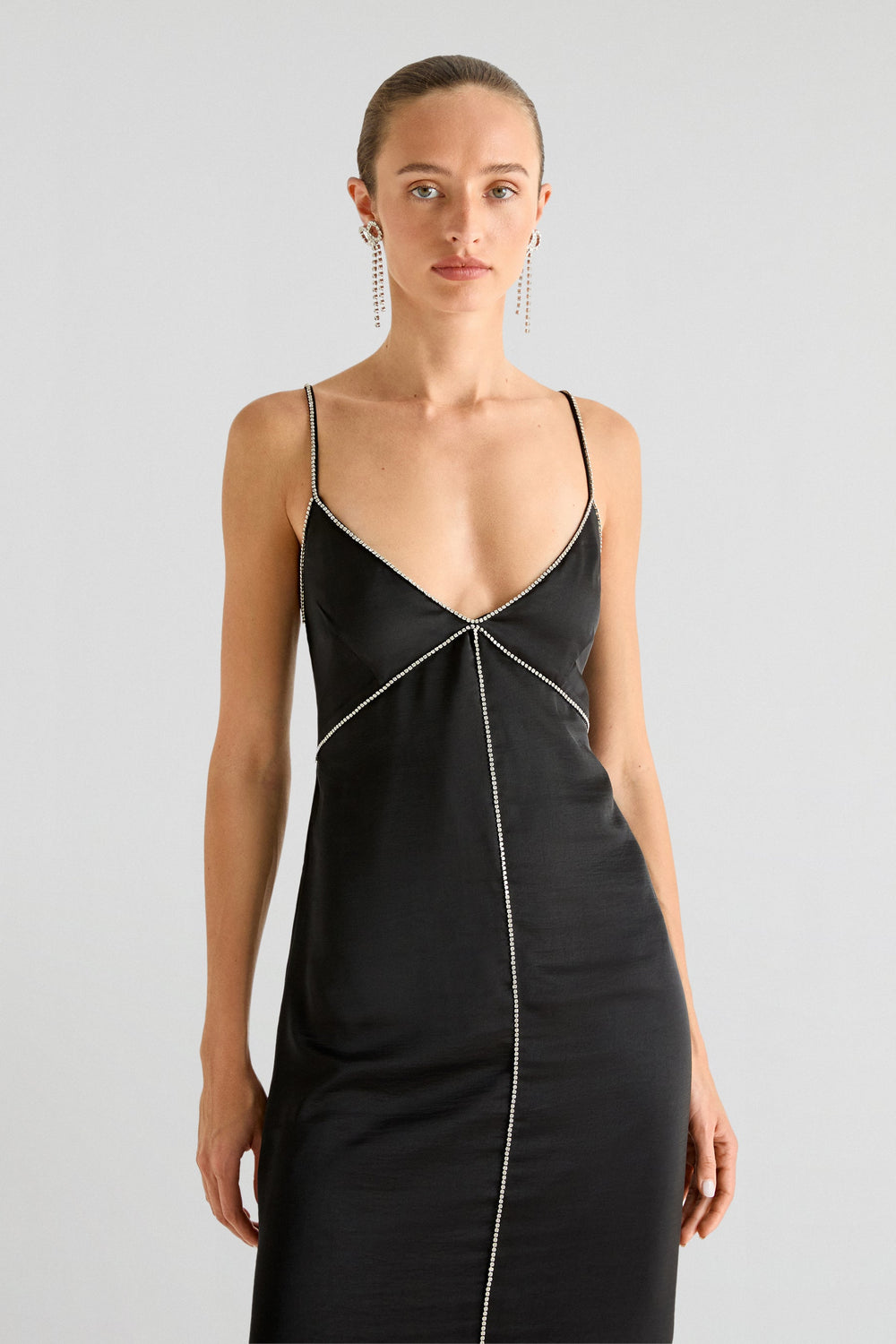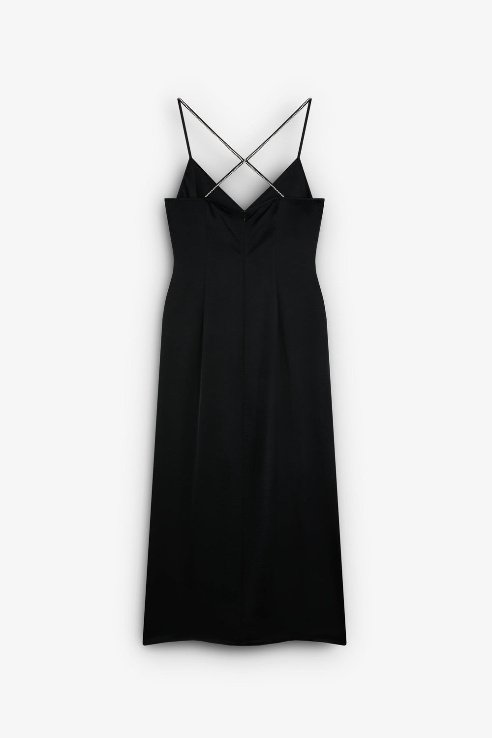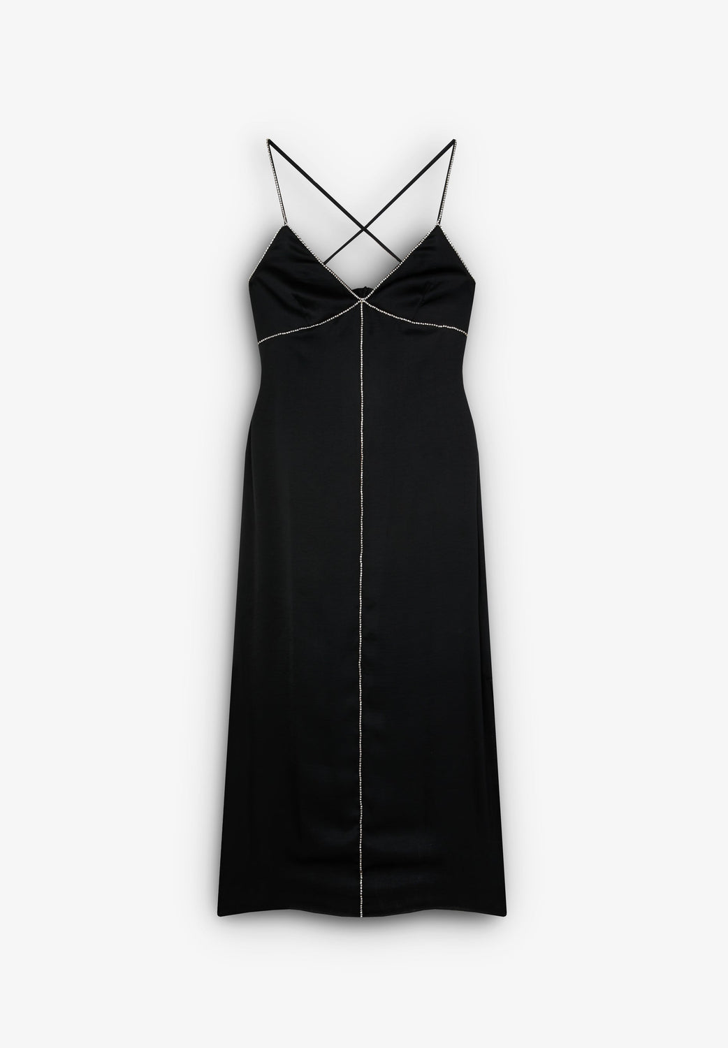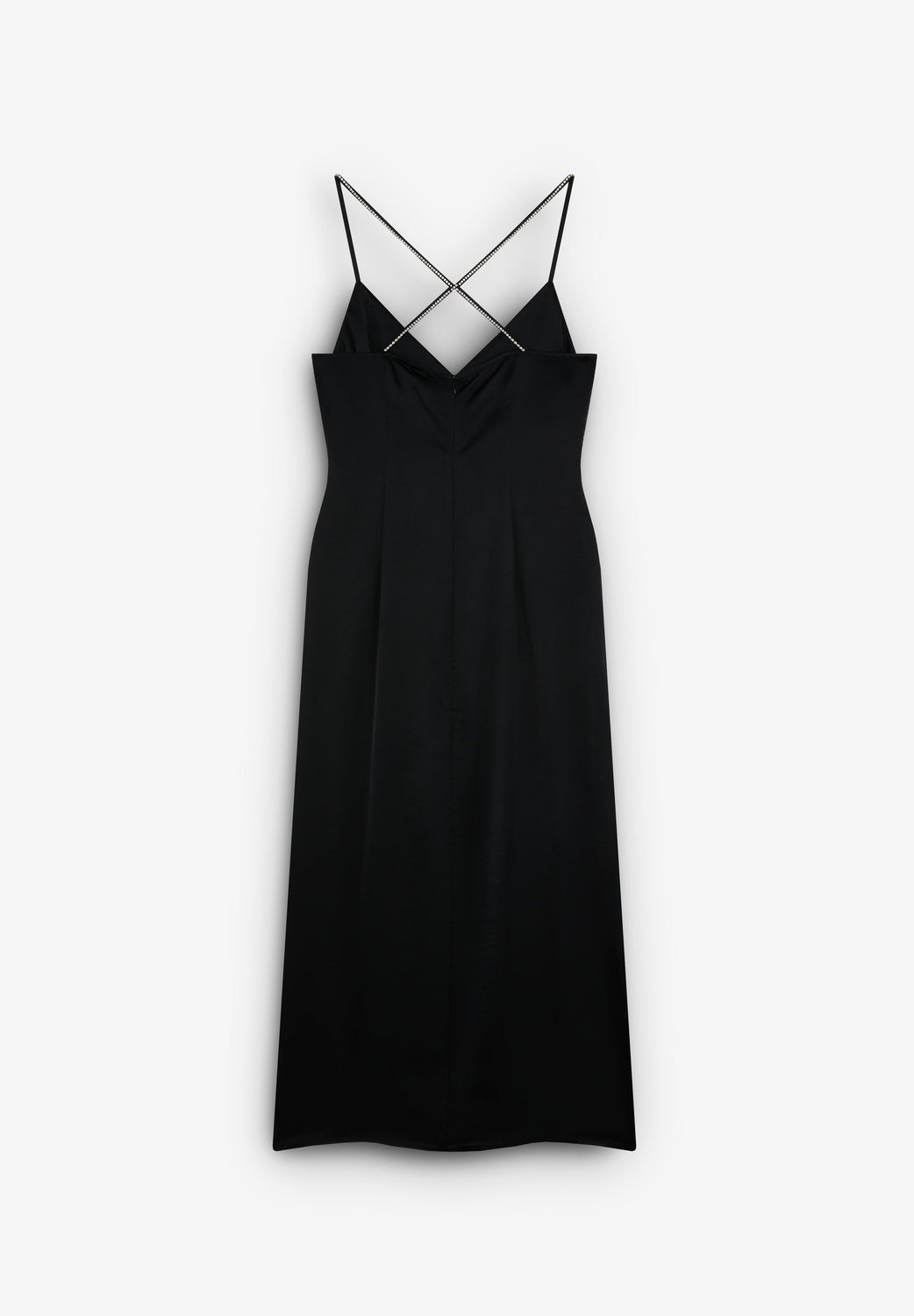 Midi slip dress made of satin fabric. Slim fit, zip fastening and criss-cross straps at the back. Crystal details.