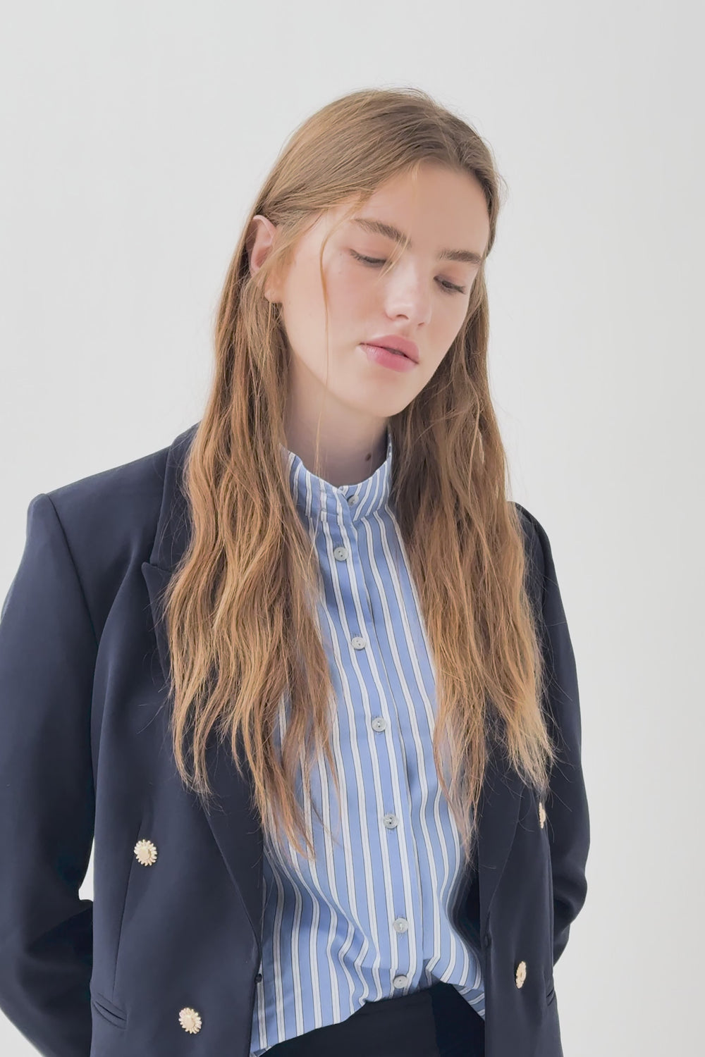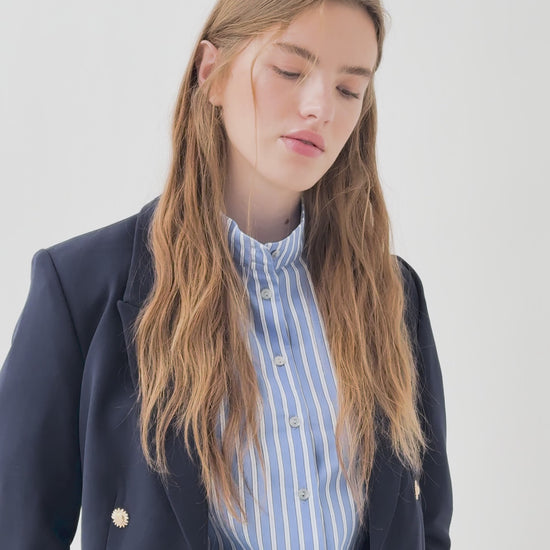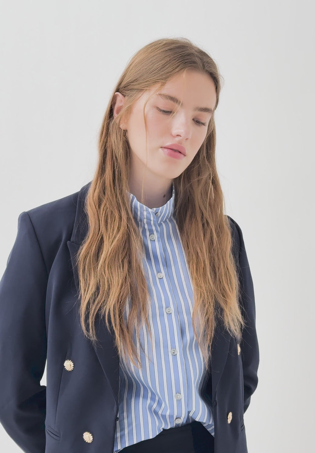 Structured blazer. Made of slightly stretchy fabric. Straight cut. Lightweight shoulder pads. Lapel collar. Button fastening. Long sleeves with slit details on cuffs. Jetted pockets.