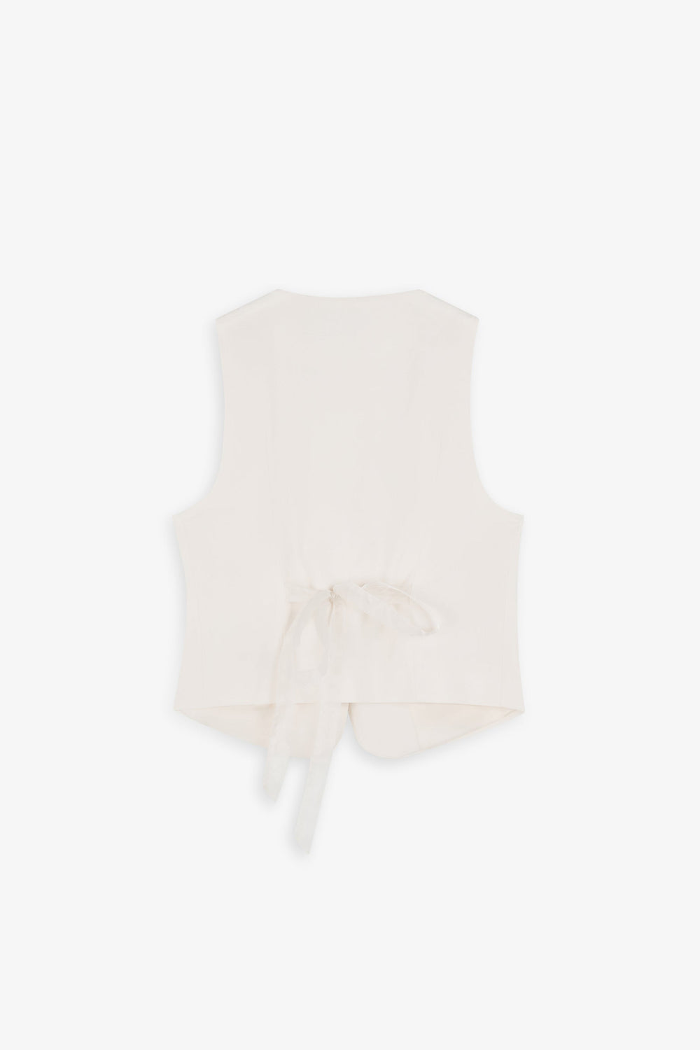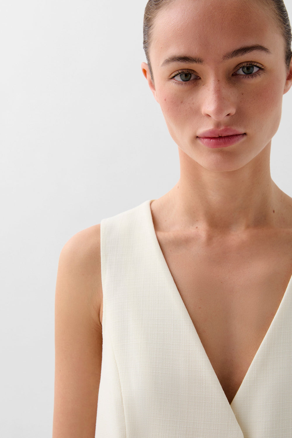Waistcoat made of a cotton blend. Regular fit, V-neck and button fastening. Front pockets with piping and back tie.
