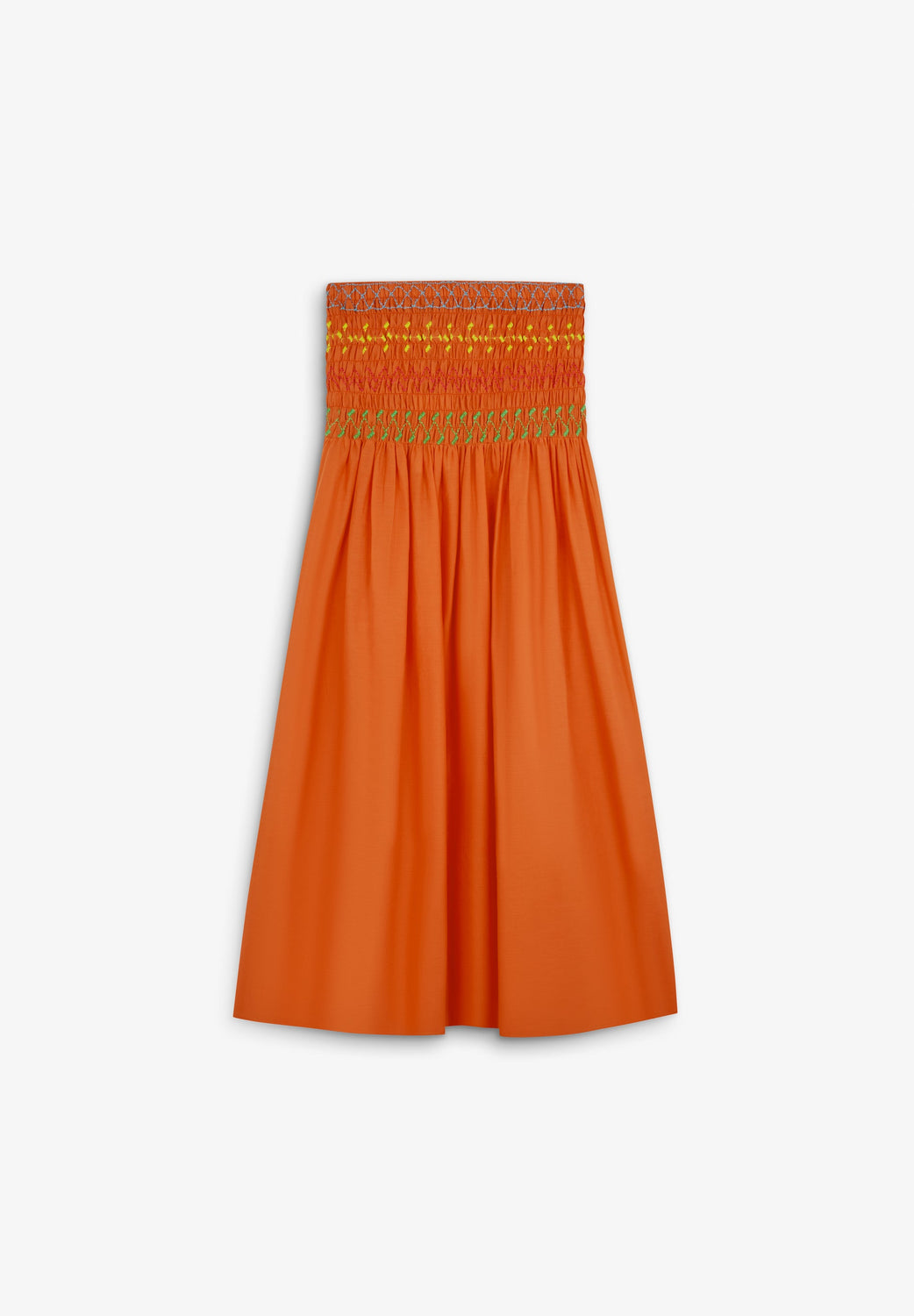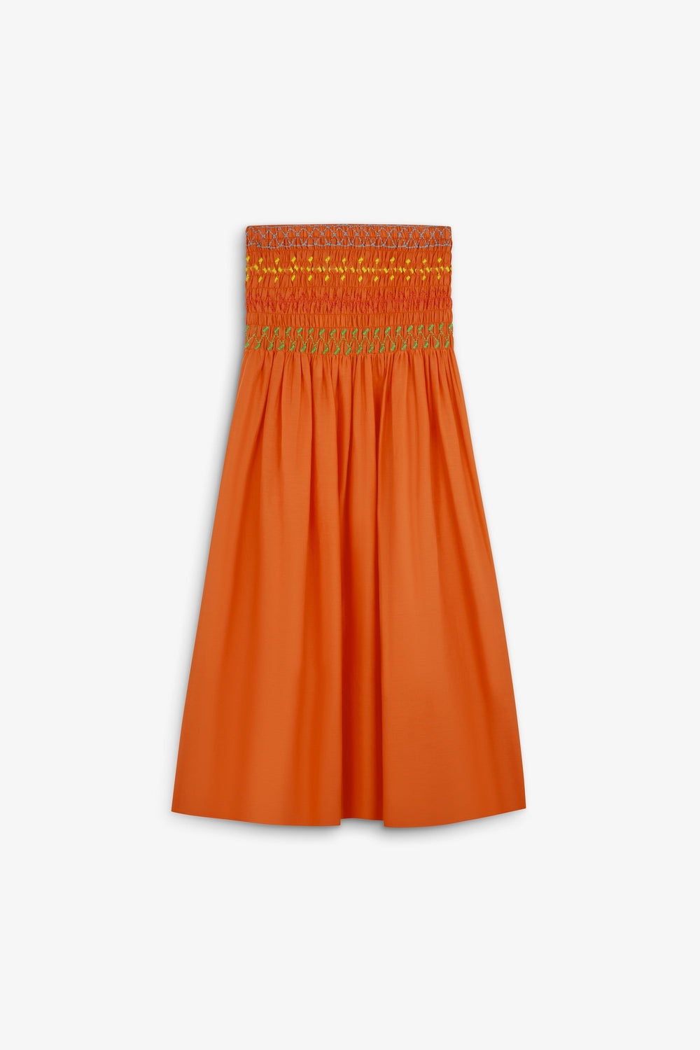 Skirt made of 100% cotton with multicoloured smocking detail on the waist to the hip. Midi cut with a slight flounce.