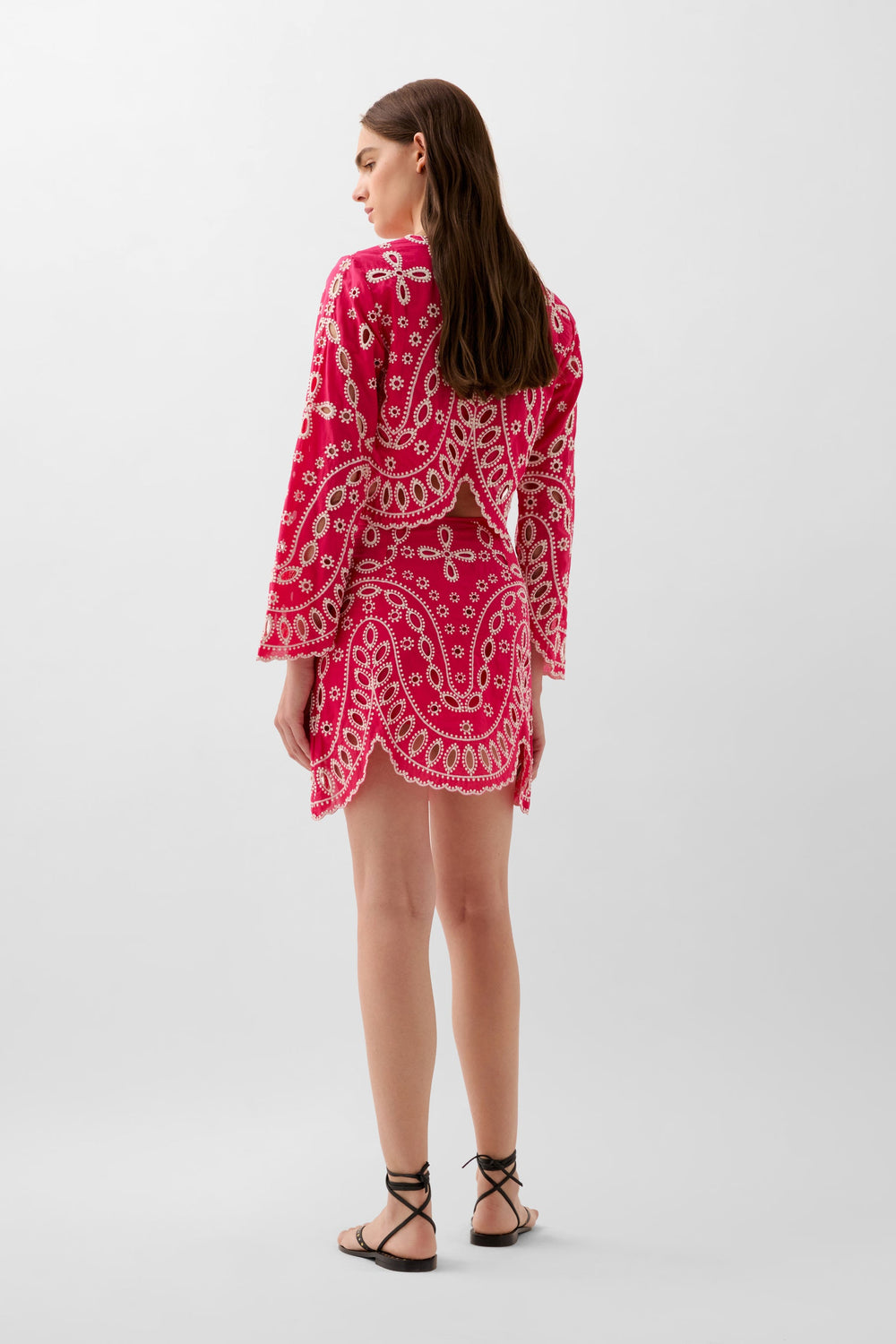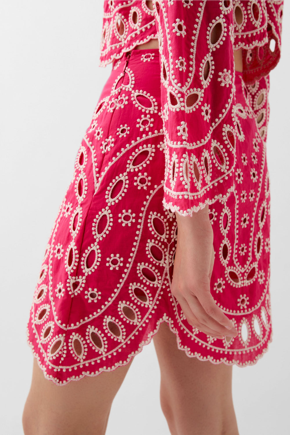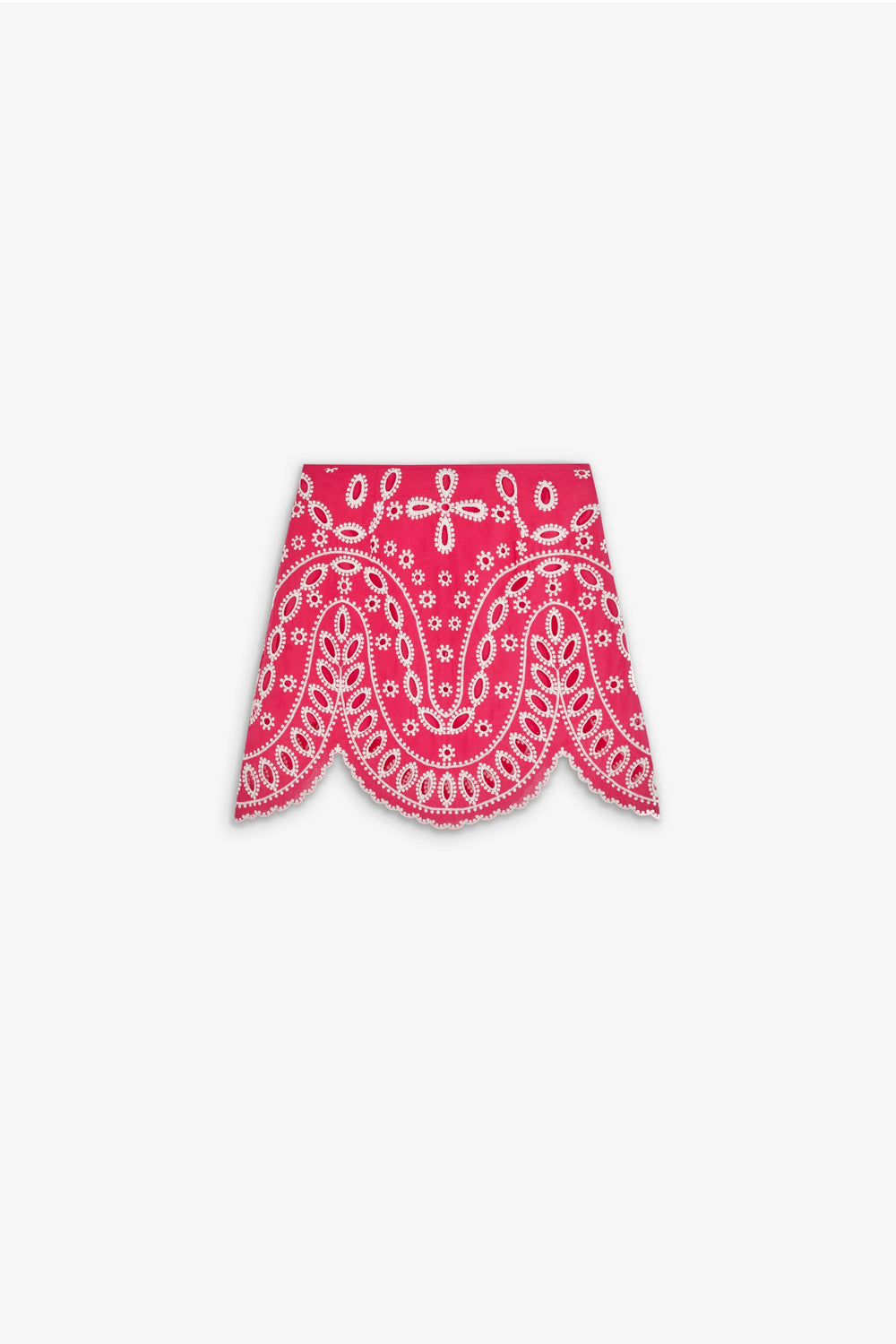 Skirt made of 100% organic BCI cotton. Contrast embroidered details. Matching side zip fastening.