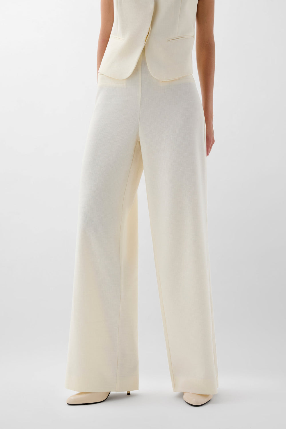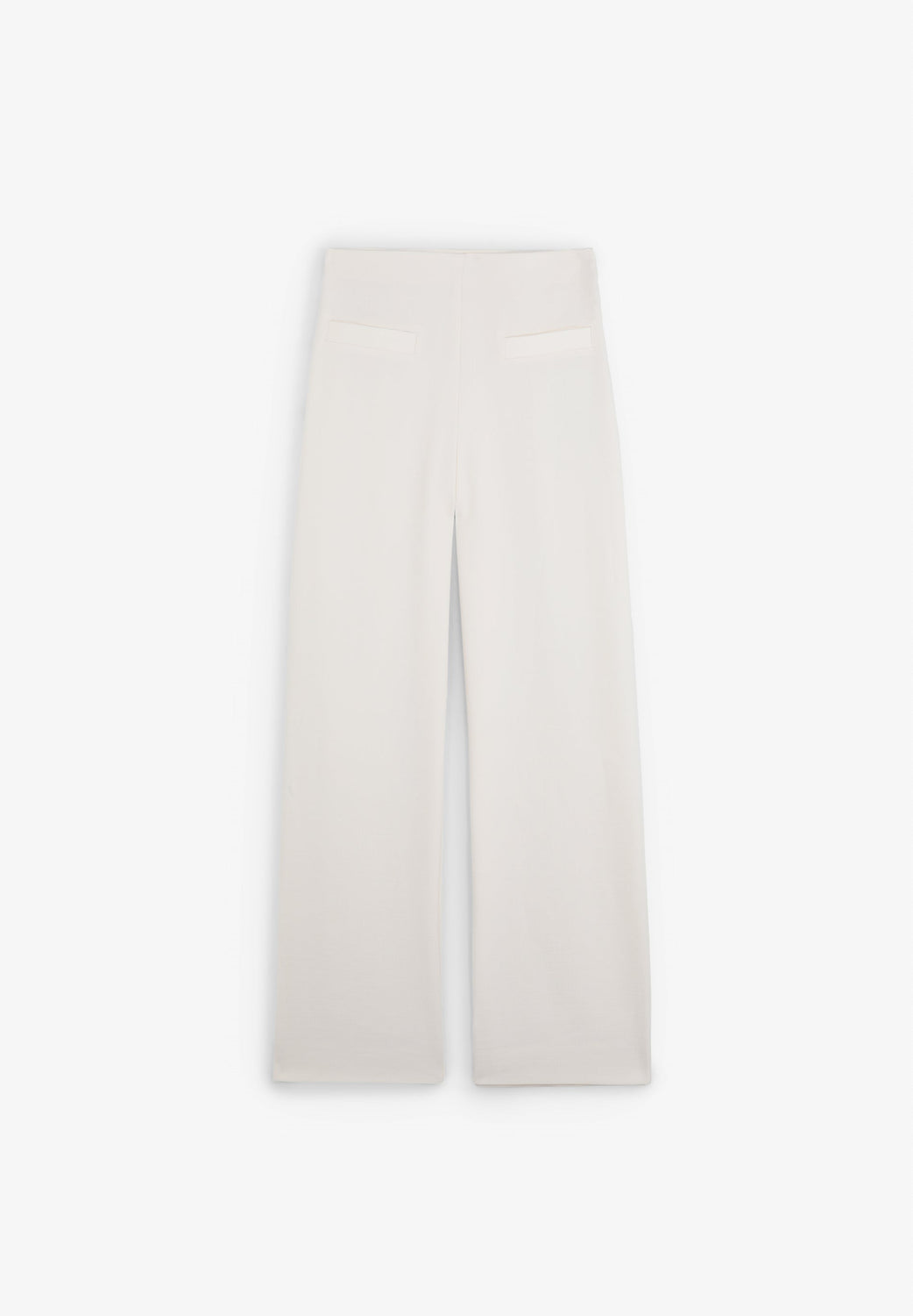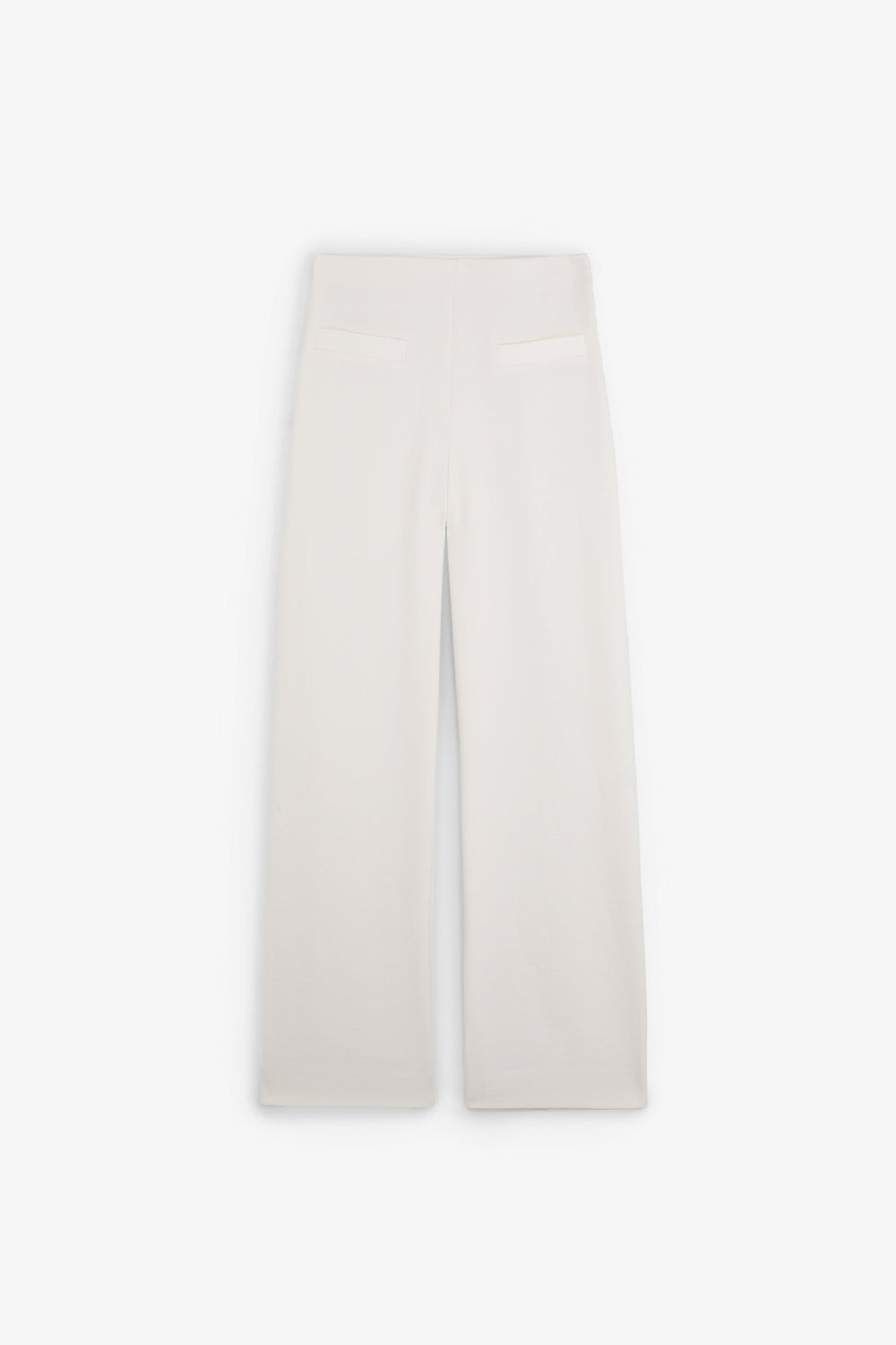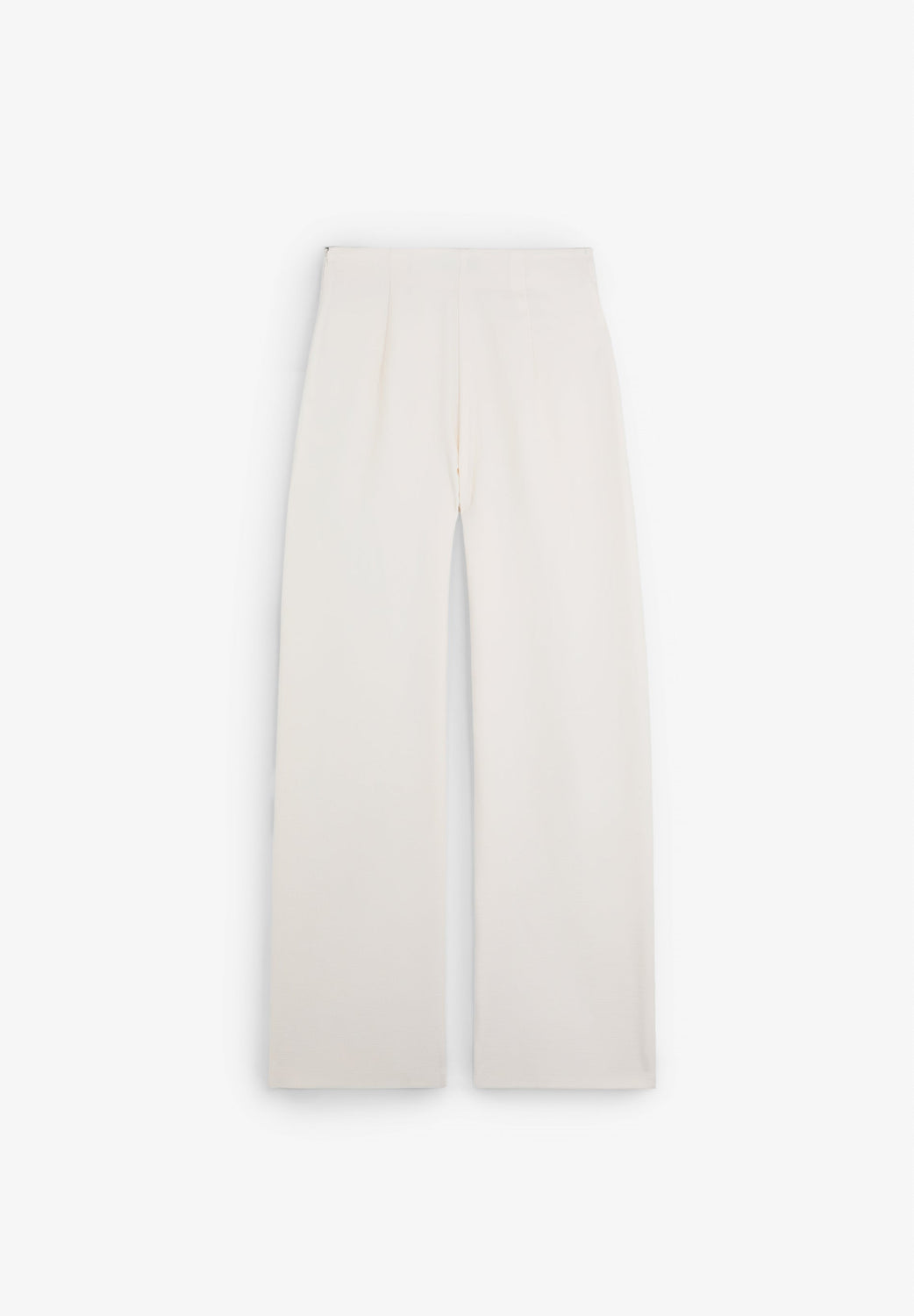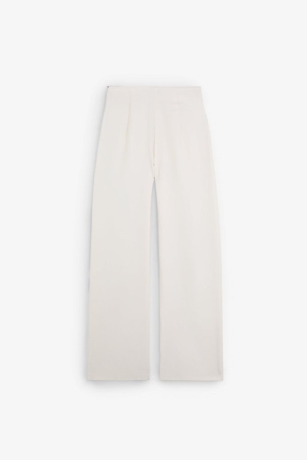 Trousers made of a flowing fabric. Regular fit, full length. Zip and concealed button fastening with extended waistband. Front pockets with piping.