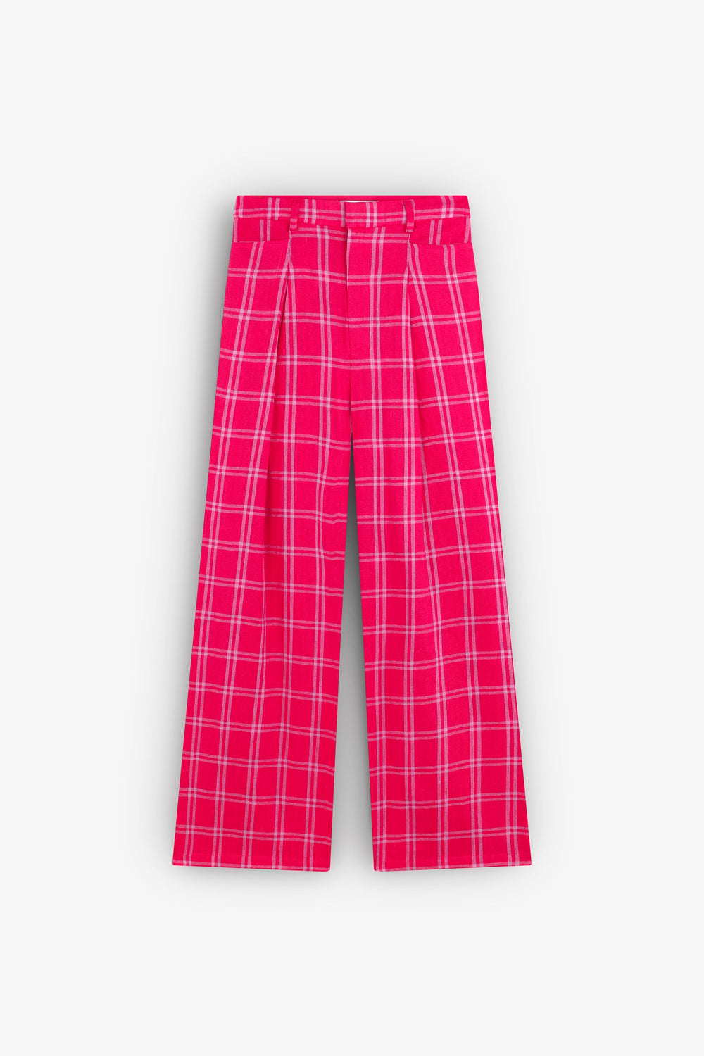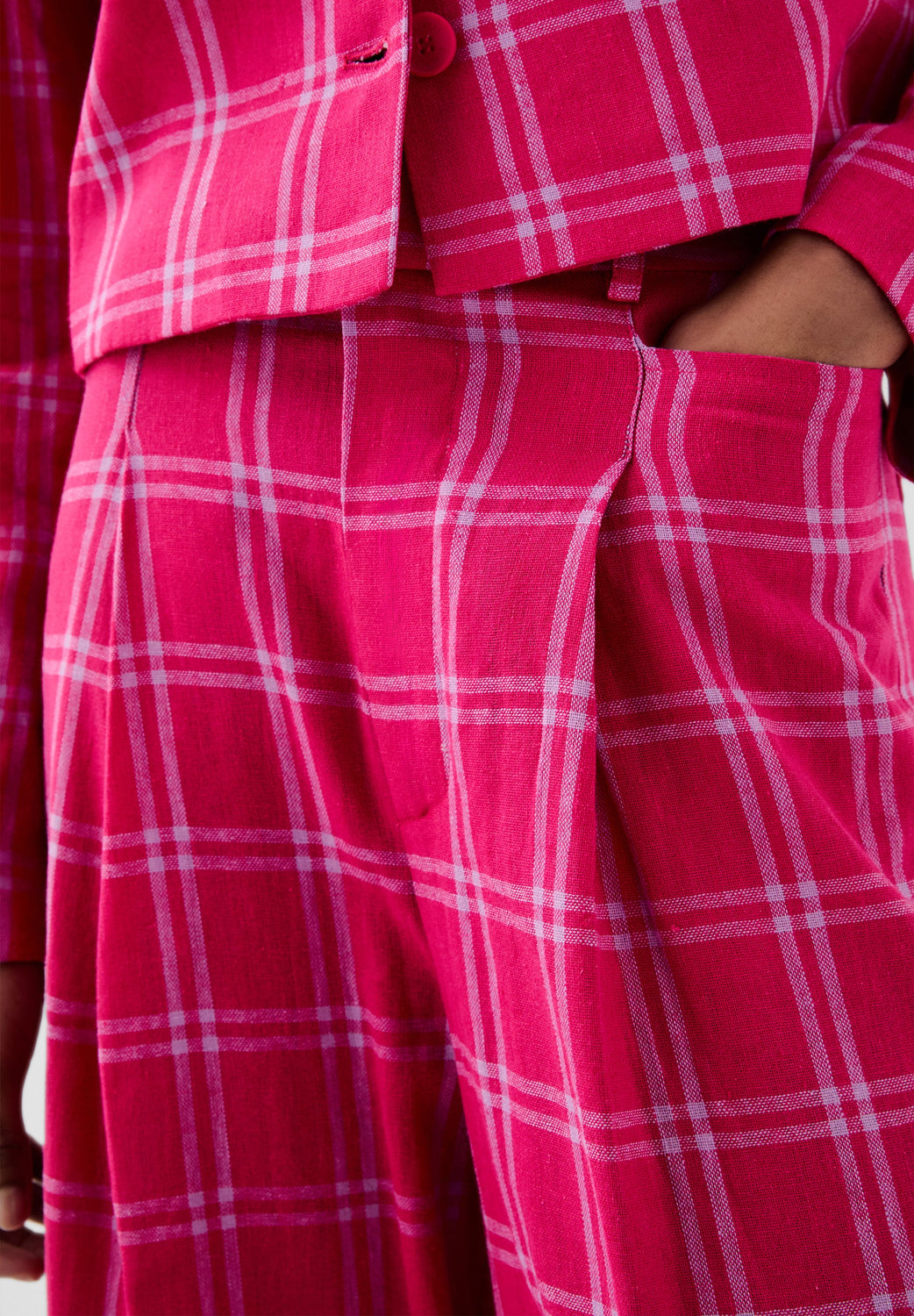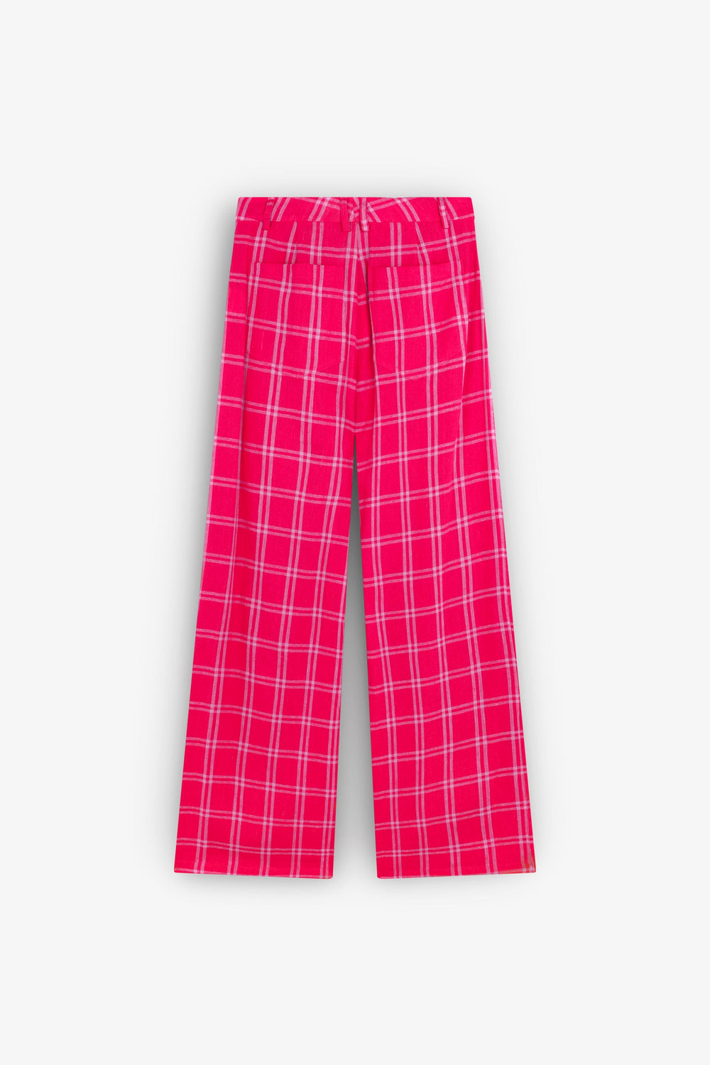 Darted trousers made of linen with a check print. Regular fit, full length with zip and button fastening at waist. Piped slant pockets.