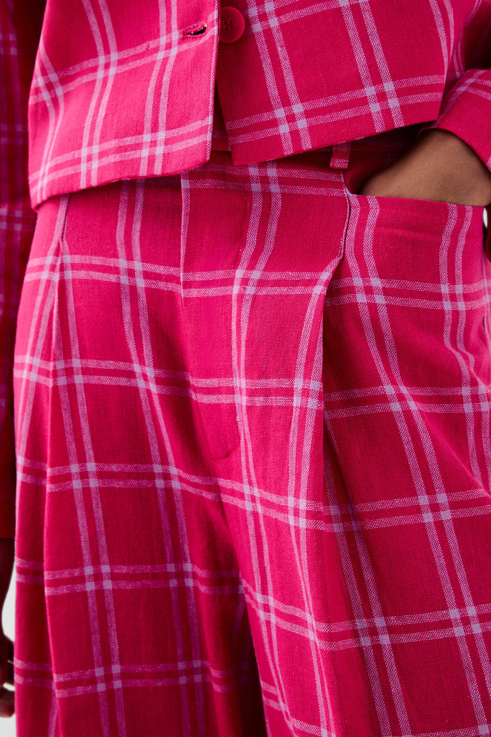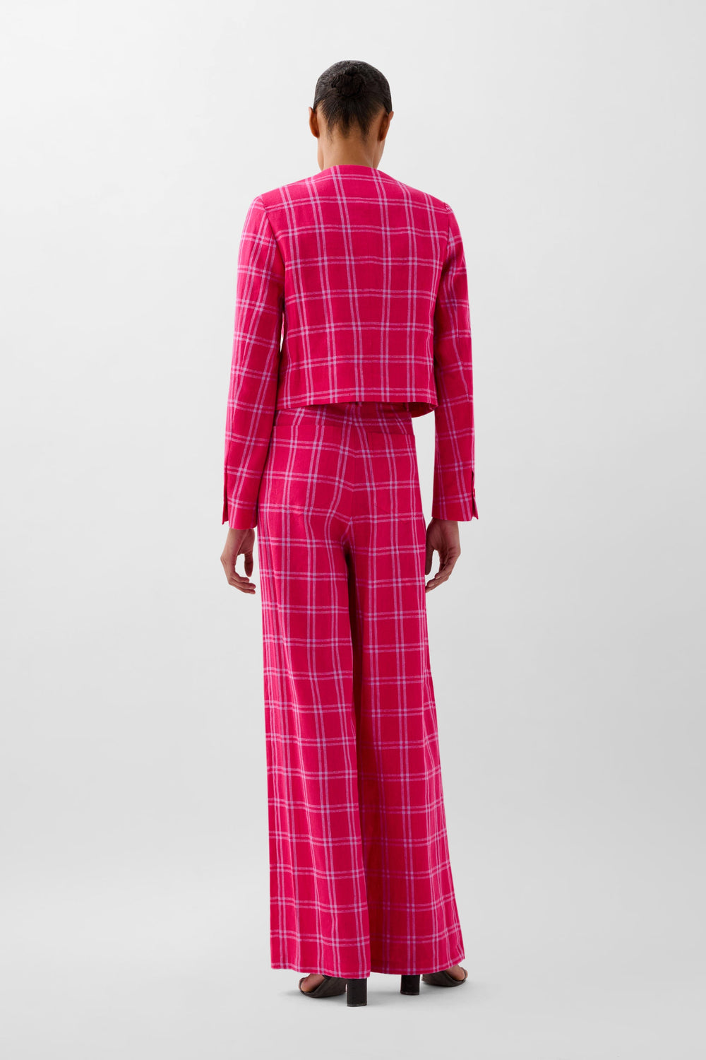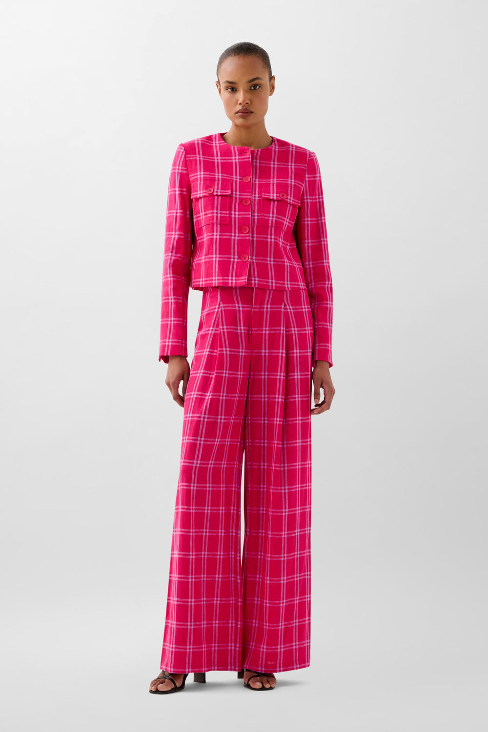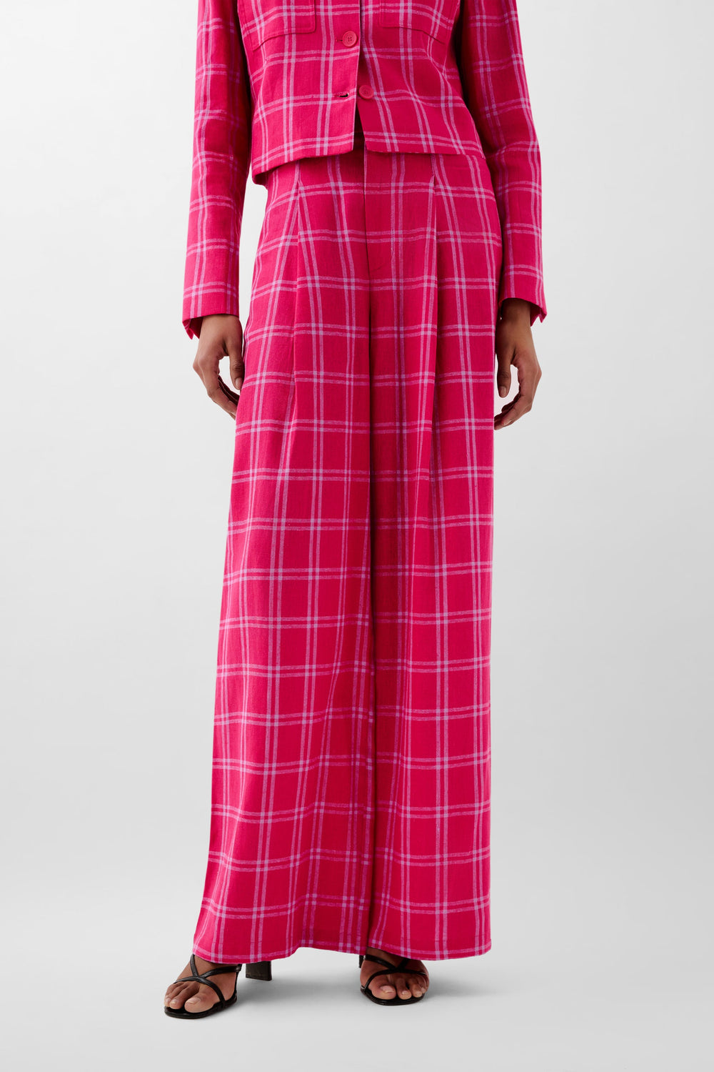 Darted trousers made of linen with a check print. Regular fit, full length with zip and button fastening at waist. Piped slant pockets.