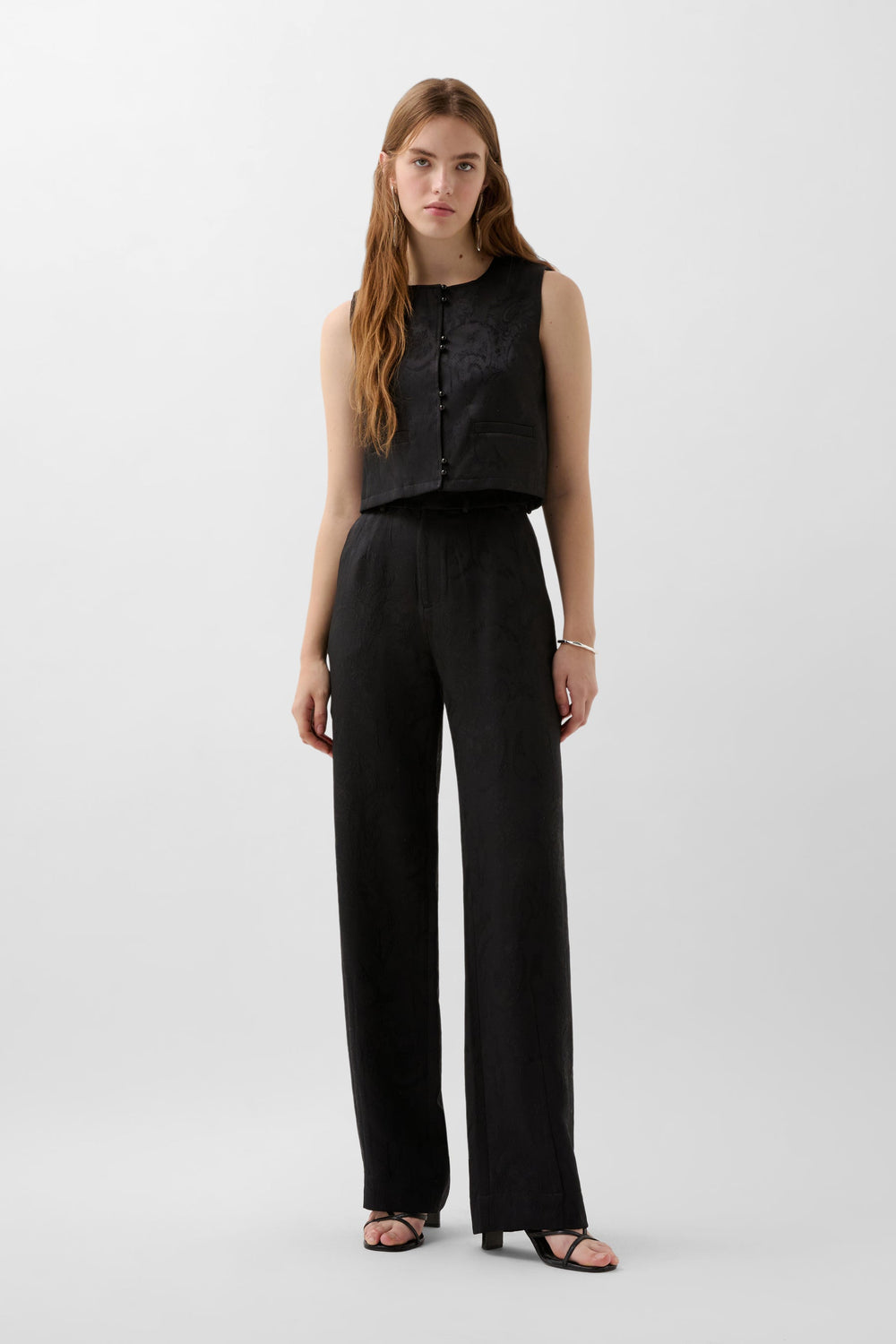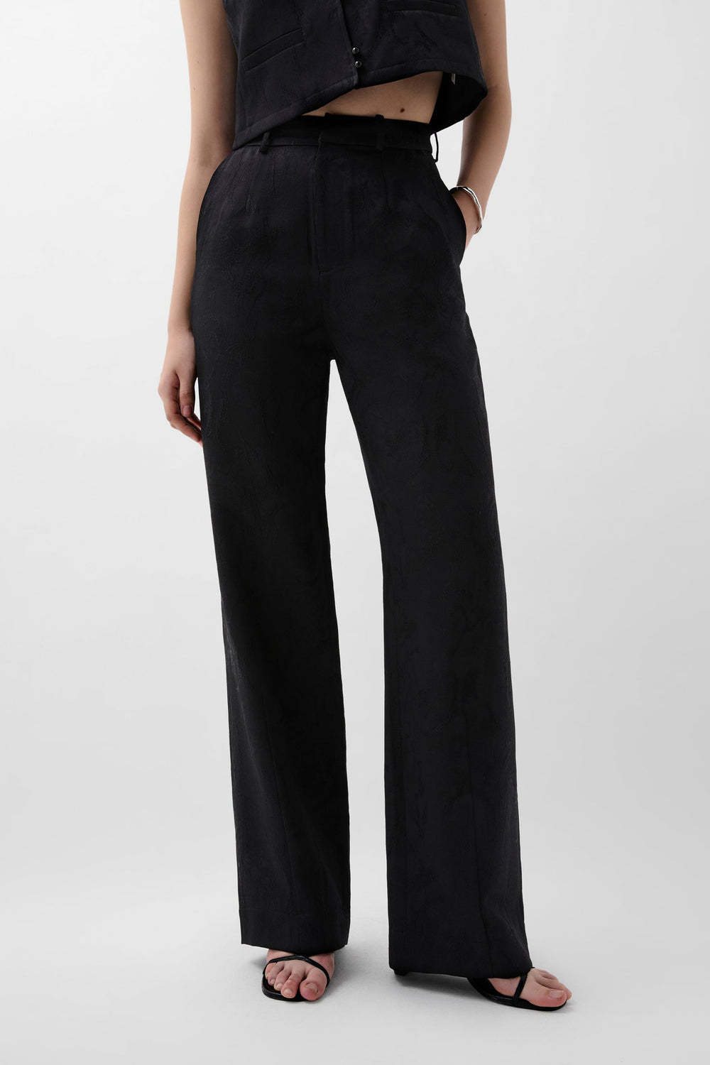 Trousers made of jacquard fabric. High waist, straight cut with zip and hook fastening. Side pockets and concealed back pockets. Belt loops at the waist.