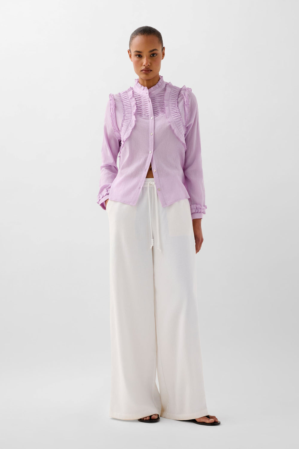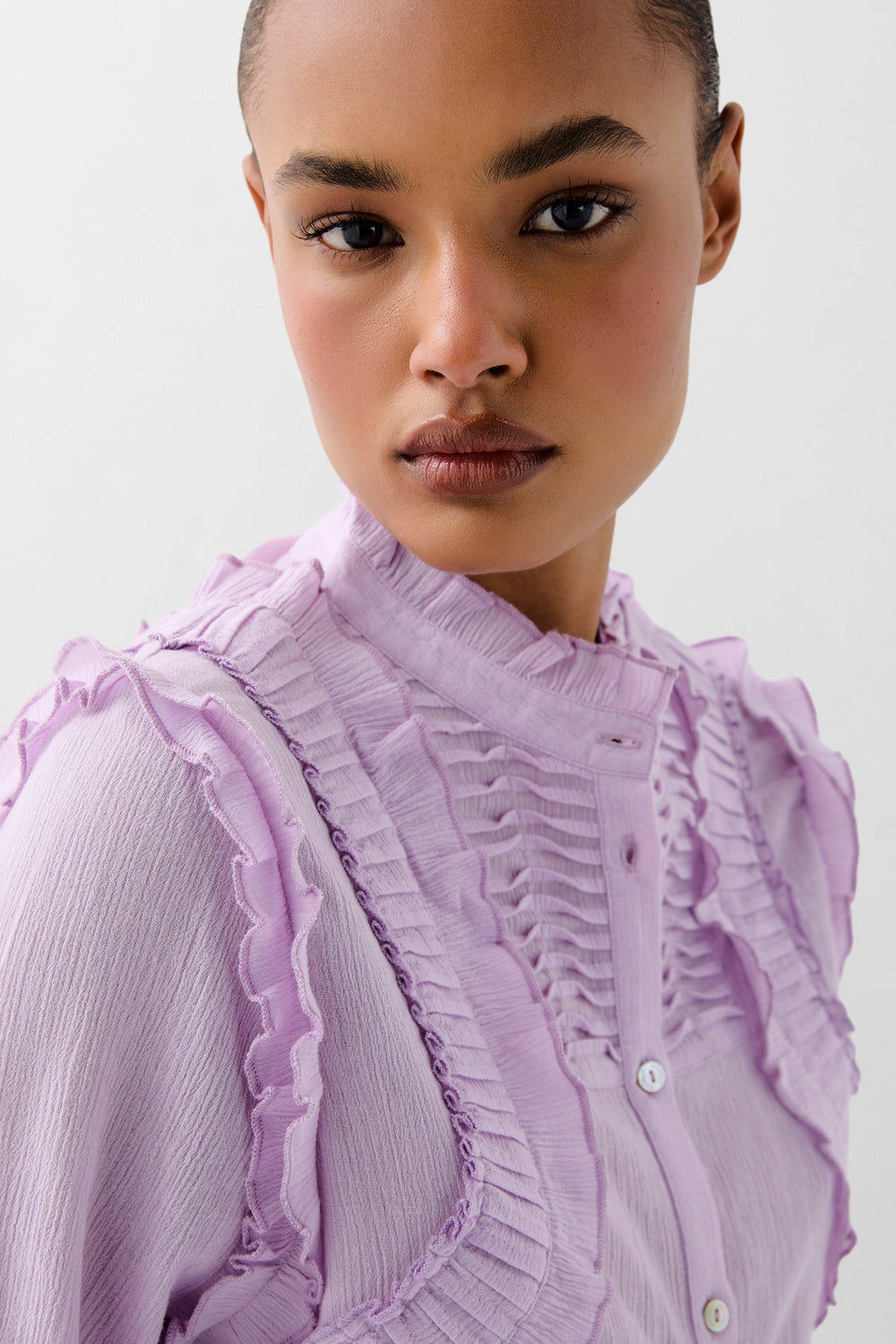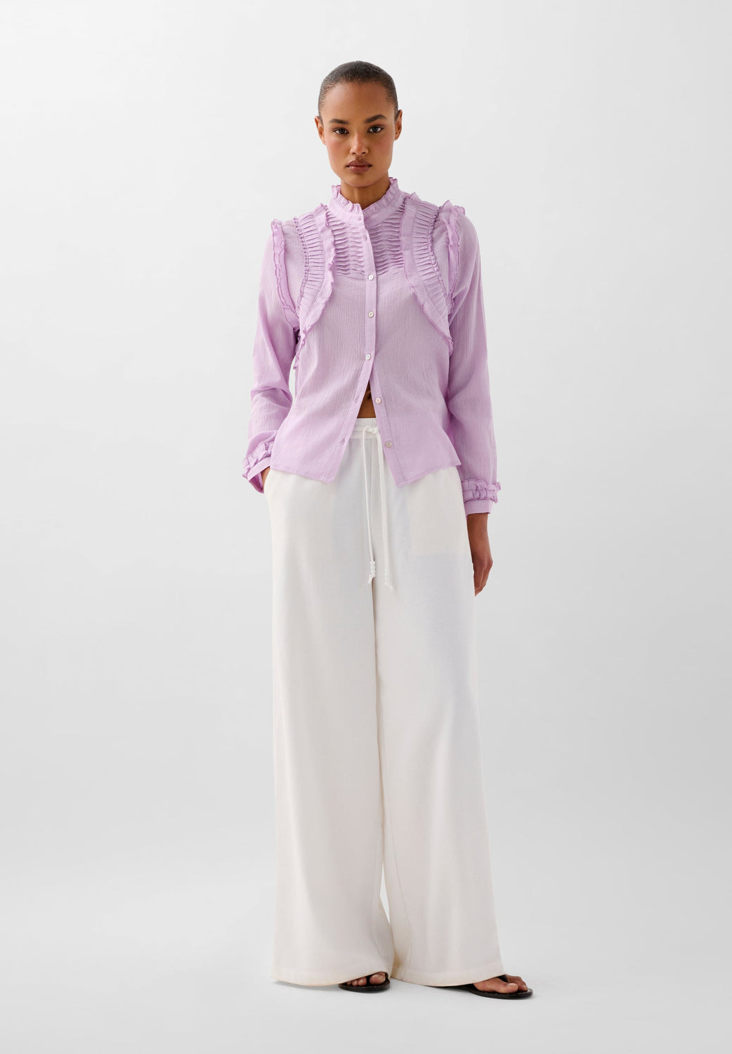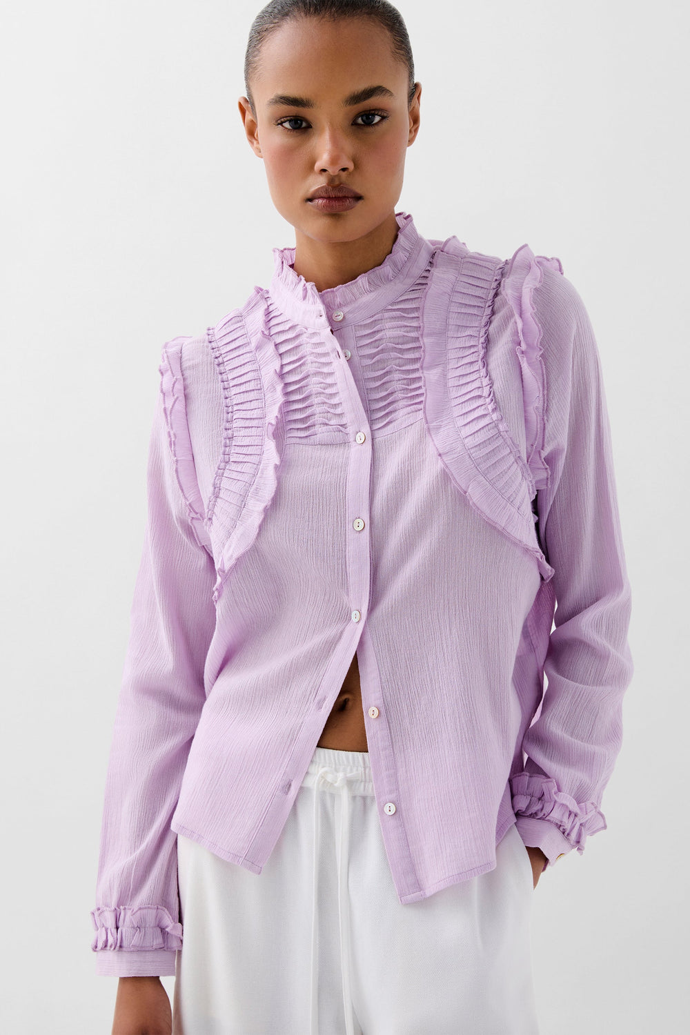 Shirt made of 100% cotton. Regular fit, high collar with gathered detail. Button fastening. Long sleeves with buttoned cuff detail.