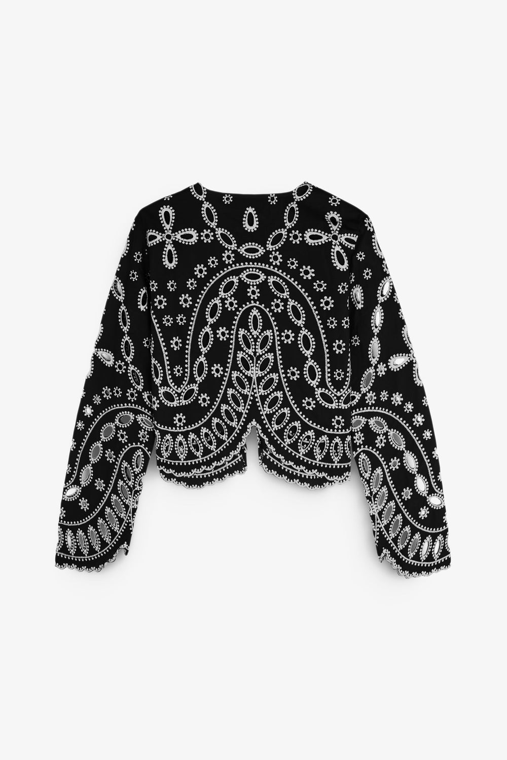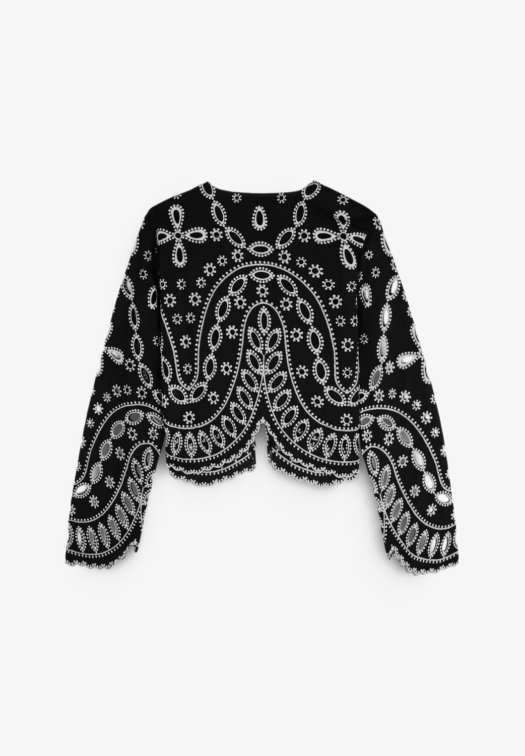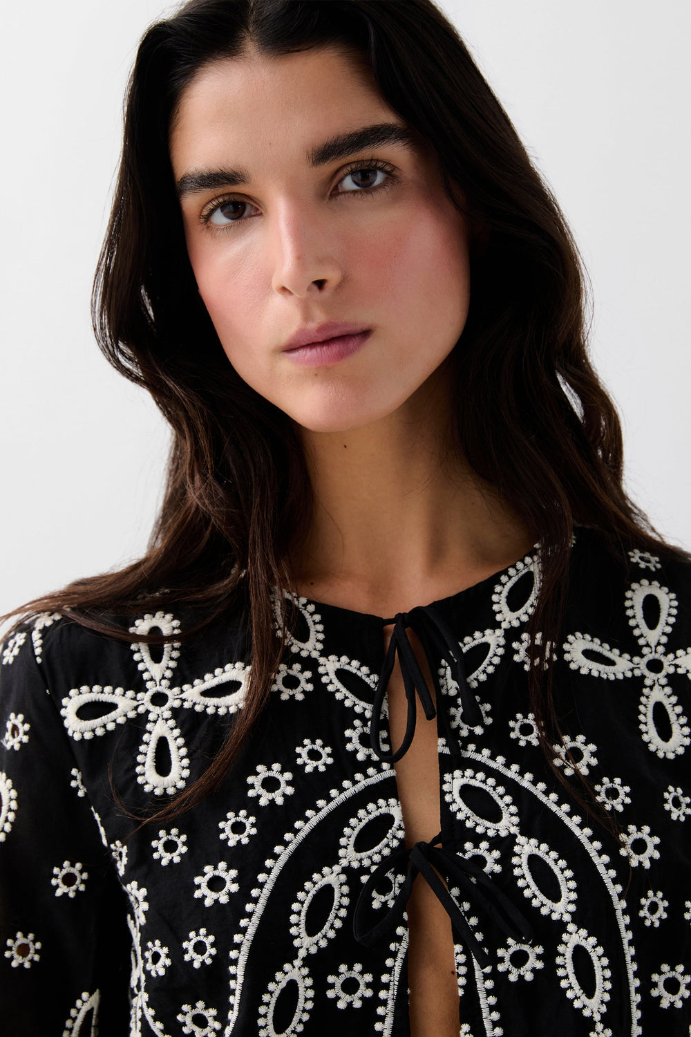Shirt made of 100% cotton with contrast embroidery. Regular fit, round neck and long slightly flared sleeves. Fastens at front with ties.