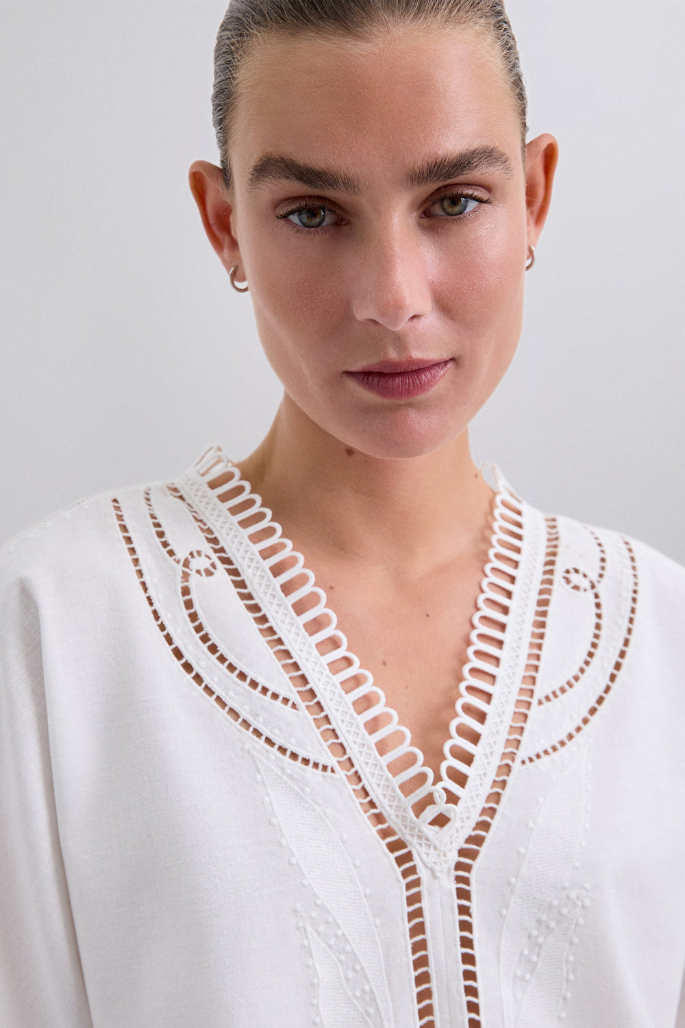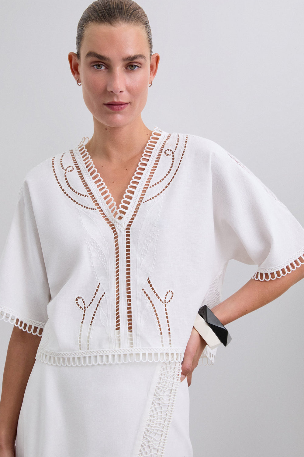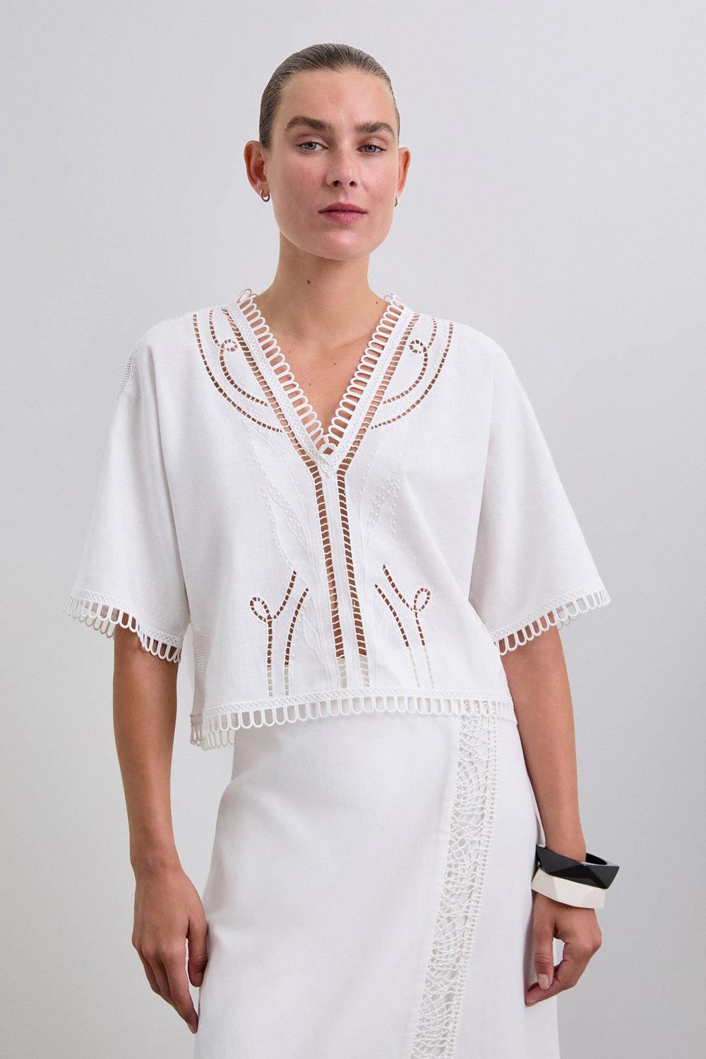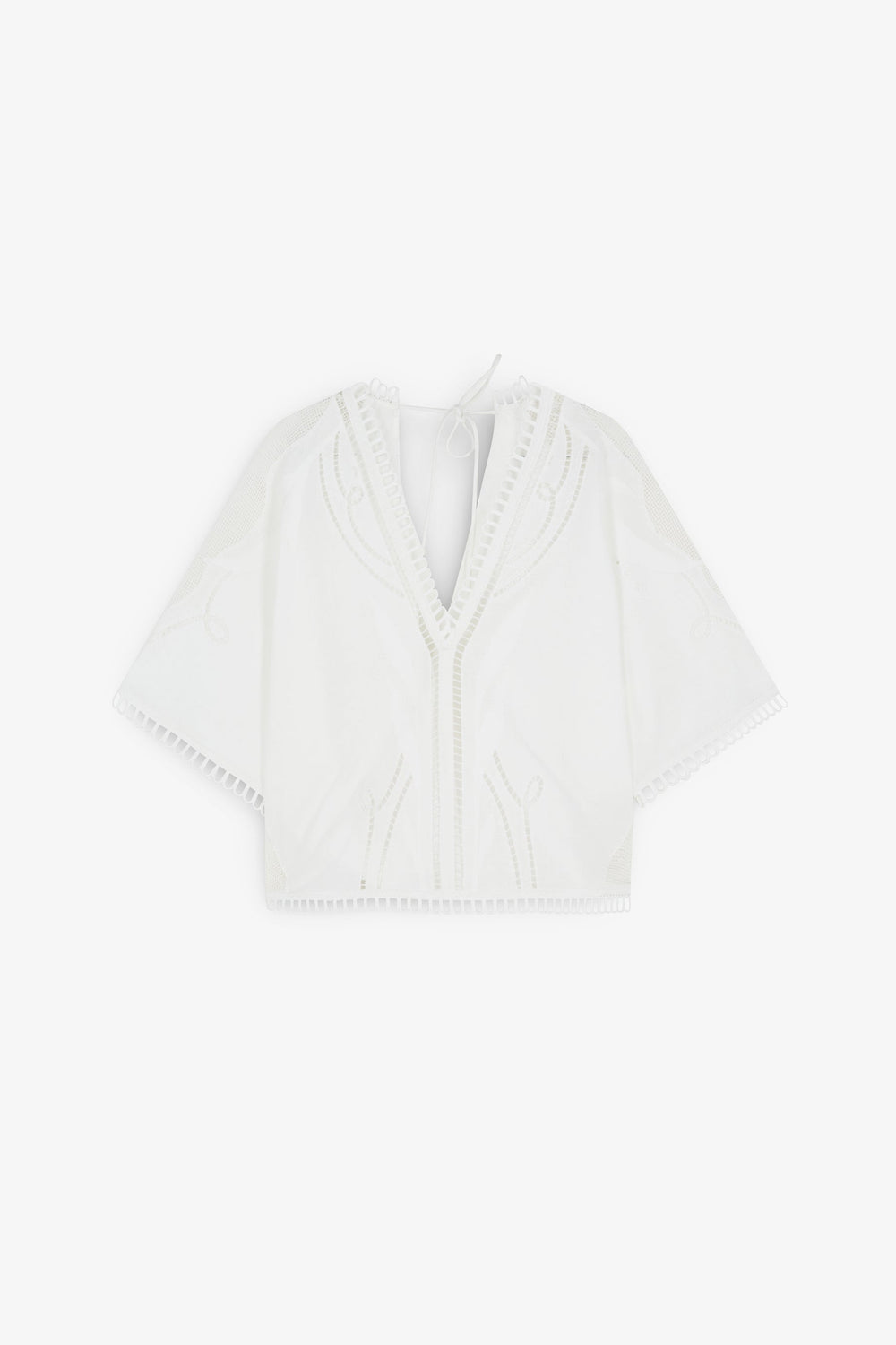 Linen and cotton blend blouse with lace details. Slightly cropped fit, V-neck and short sleeves. Embroidered detail and trim on neckline, sleeves and hem. Back tie fastening and opening at the back.