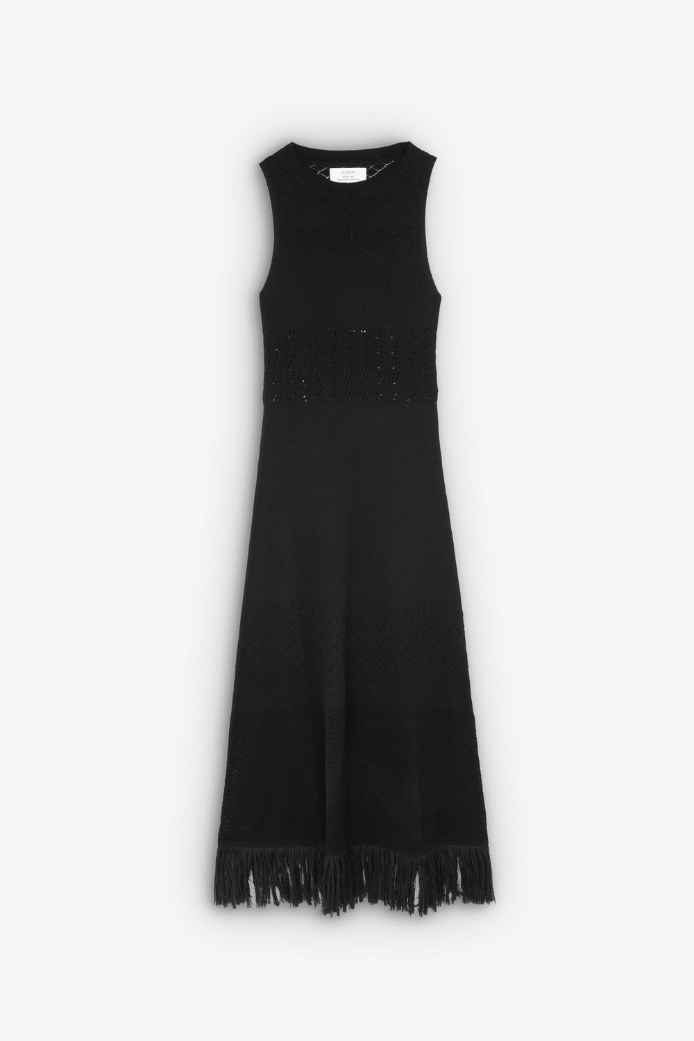 Dress made of slightly stretchy knit fabric. Regular fit, round neck, sleeveless design. Slightly A-line, with fringed trim on hem.