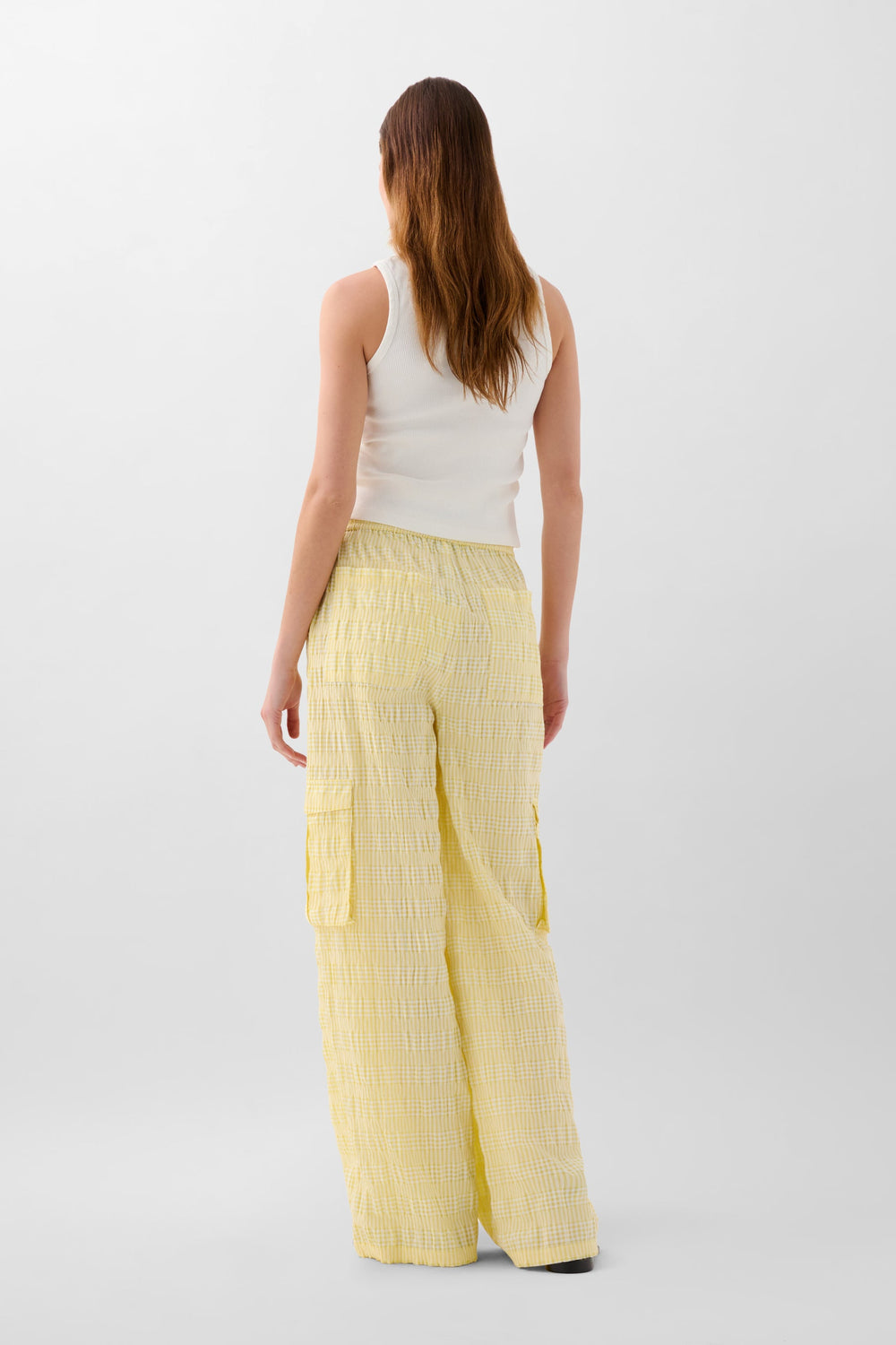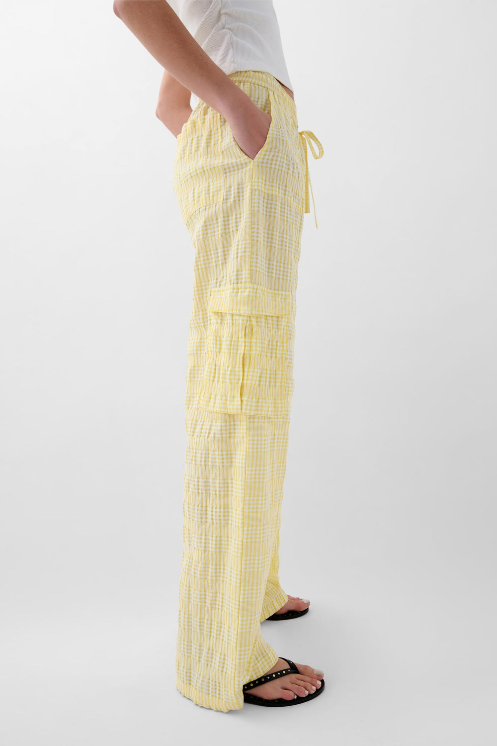 Cargo trousers made of cotton. Adjustable elastic waist. Two pockets on the front and two on the back. Pocket detail on the hem.